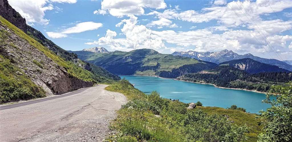 It’s a wooded, green & pretty ascent to Col de Meraillet, with views back down the valley & the gradient is a constant 7% to 8% for these first 8 miles. As soon as we passed this intermediate col, we had our first views of one of my favourite alpine lakes, the glorious Lac de Roselend. The next mile or so followed the shore of the lake & I took the opportunity to gather my mental & physical resources by suggesting a quick coffee & raspberry tart stop.