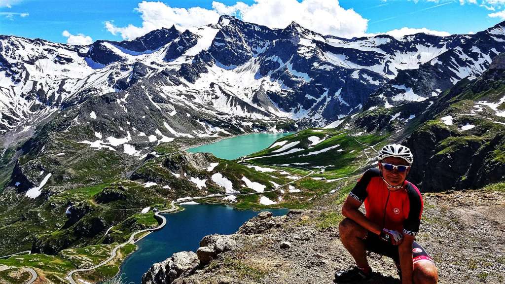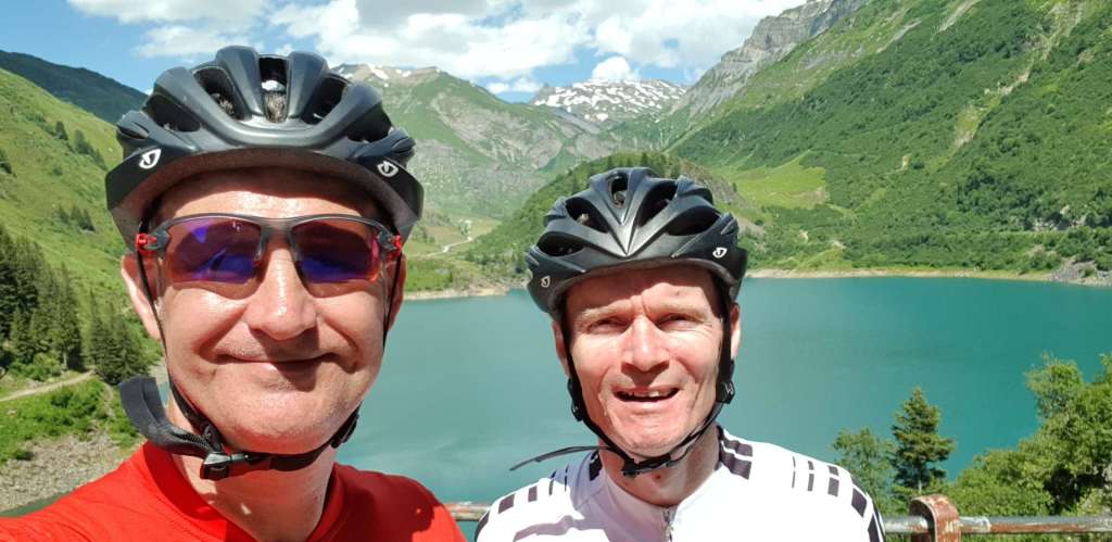 Much as I wanted to ride both sides of this mythical climb, today wasn’t the day, as I don’t have the training in the legs this year, however, I’ll be back again to fulfil that dream. Instead, we headed back down to Col de Meraillet & then took a detour across the Barrage de Roselend & then did a short, sharp bonus climb up to Col du Pre. This is a climb that reminded me of a classic Spinal Tap quote where the volume was turned up to 11 – in this case it was the gradient that was louder than 10!!! The real reason for this side ride was the absolutely breath taking view across the Barrage & Lake to the huge snow encrusted mountains in the bacckground. All Alpine lakes are beautiful, but some are more so than others – the mountain to the left of the photo with its head in the clouds is Mont Blanc.
