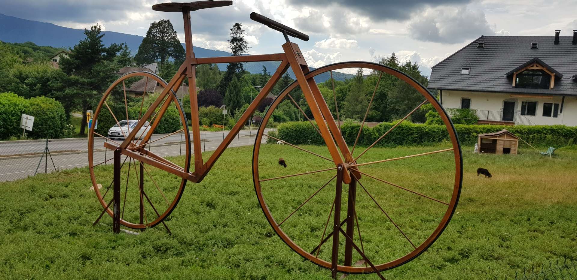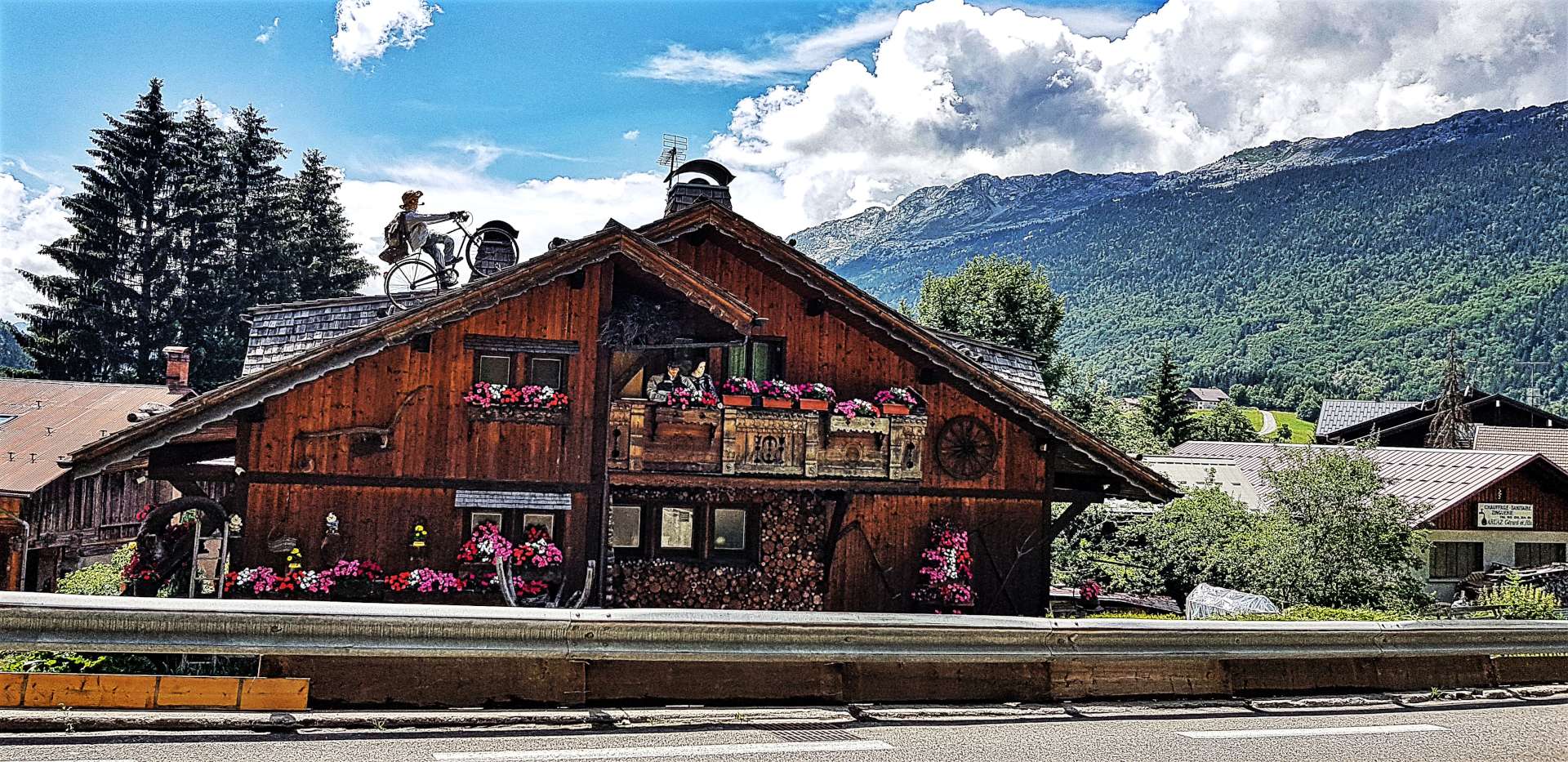 We stopped briefly for coffee in La Clusaz, which is a skiing hotspot in winter & a cycling mecca in summer. The Tour de France is visiting this year & they’d entering into the spirit of things, with cycling references displayed everywhere in the town. The highlight was a bike & rider displayed on the roof in E.T. style!!! The Etape de Tour takes place this Sunday over the route of Stage 11 – the Queen (& toughest) stage of this year’s TdF & this was right in the middle of things.