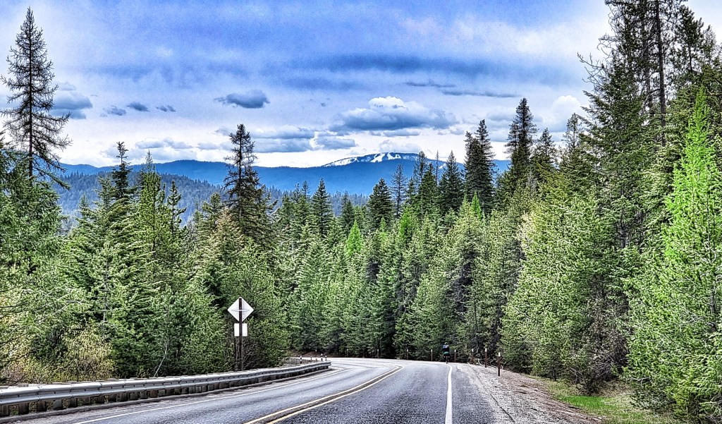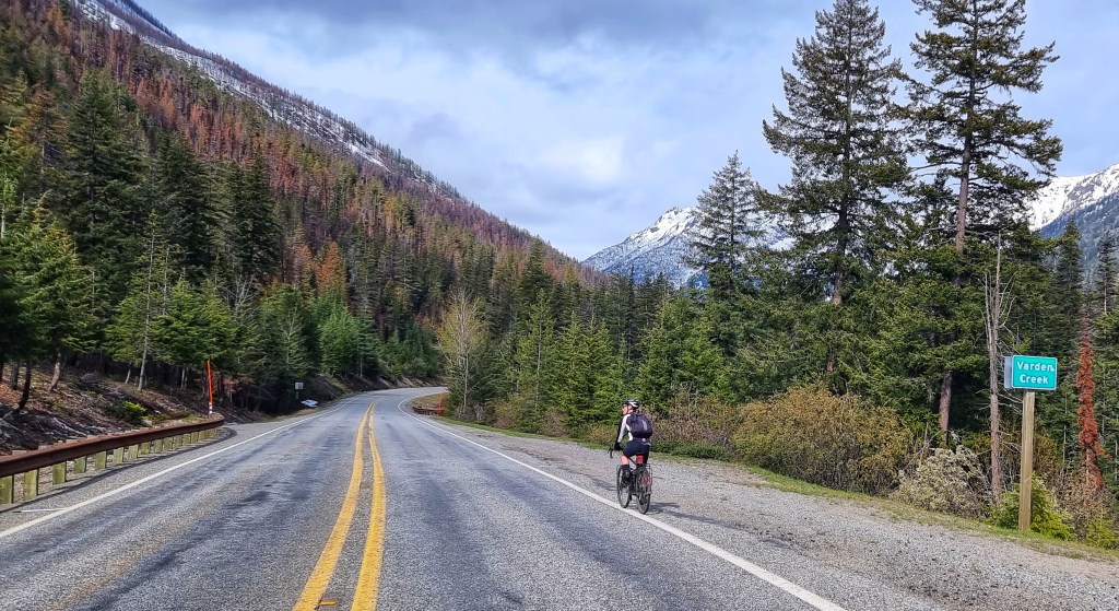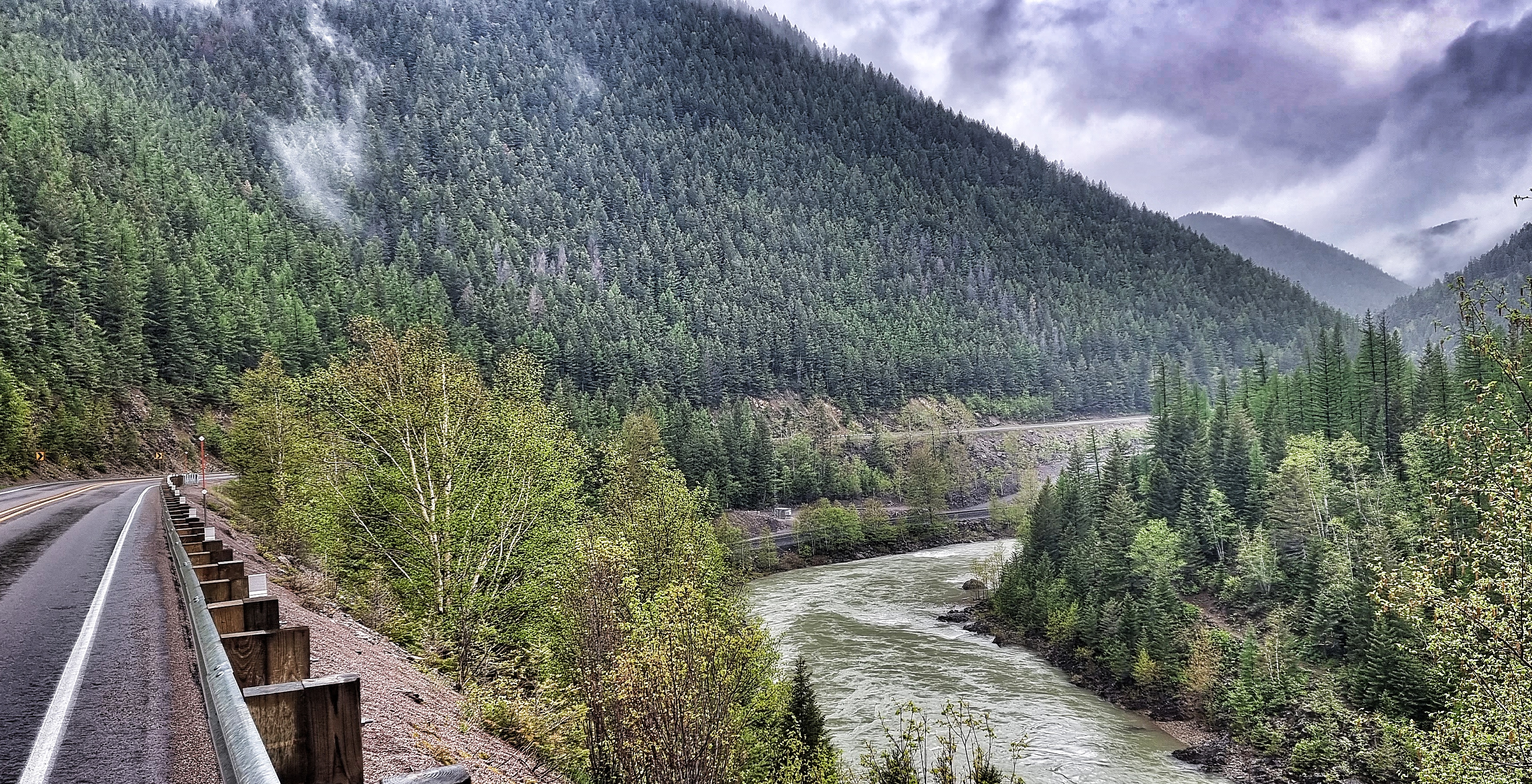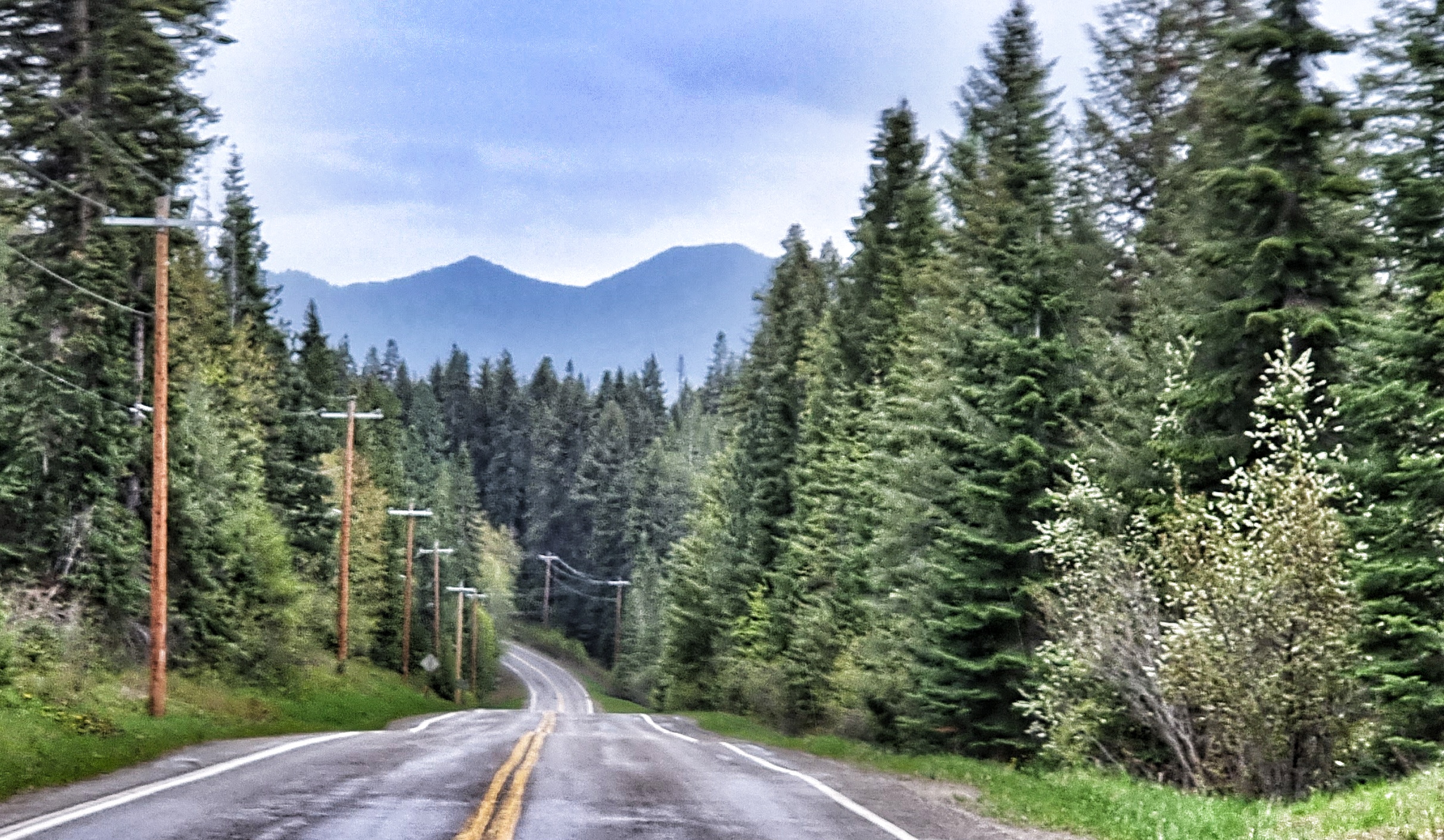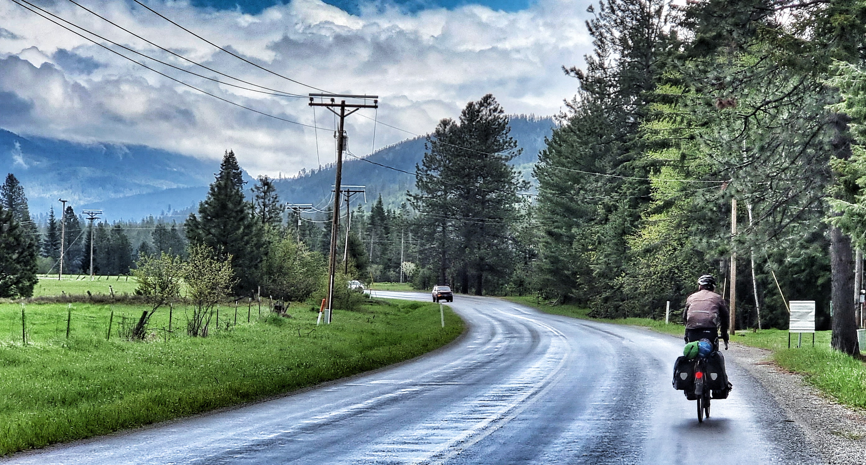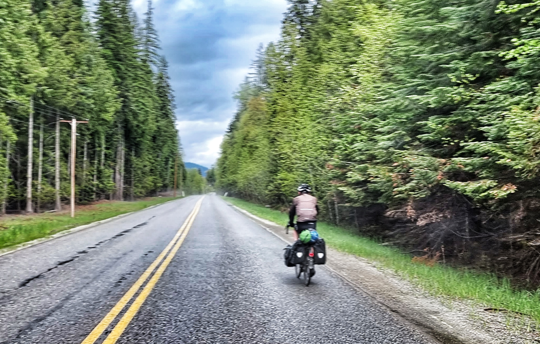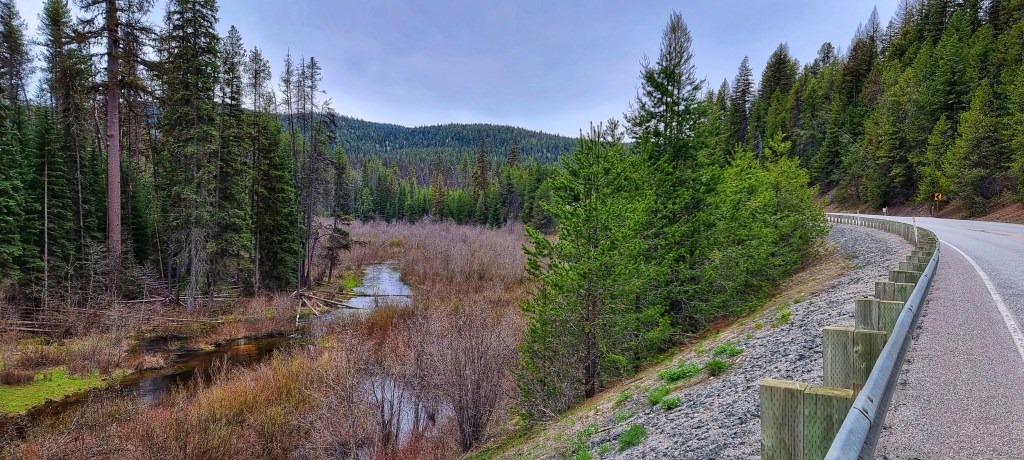While we were relaxing inside, the heavens opened outside! Luckily by the time we remounted the steel steeds, we only had to deal with light rain & the short, sharp climb as soon as we joined the US 2 soon warmed us up! In no time we had big views over the river & railroad below, but then almost immediately gave all those hard fought for feet back! At Nimrod we left the Flathead river behind us & started following the course of the babbling Bear Creek.