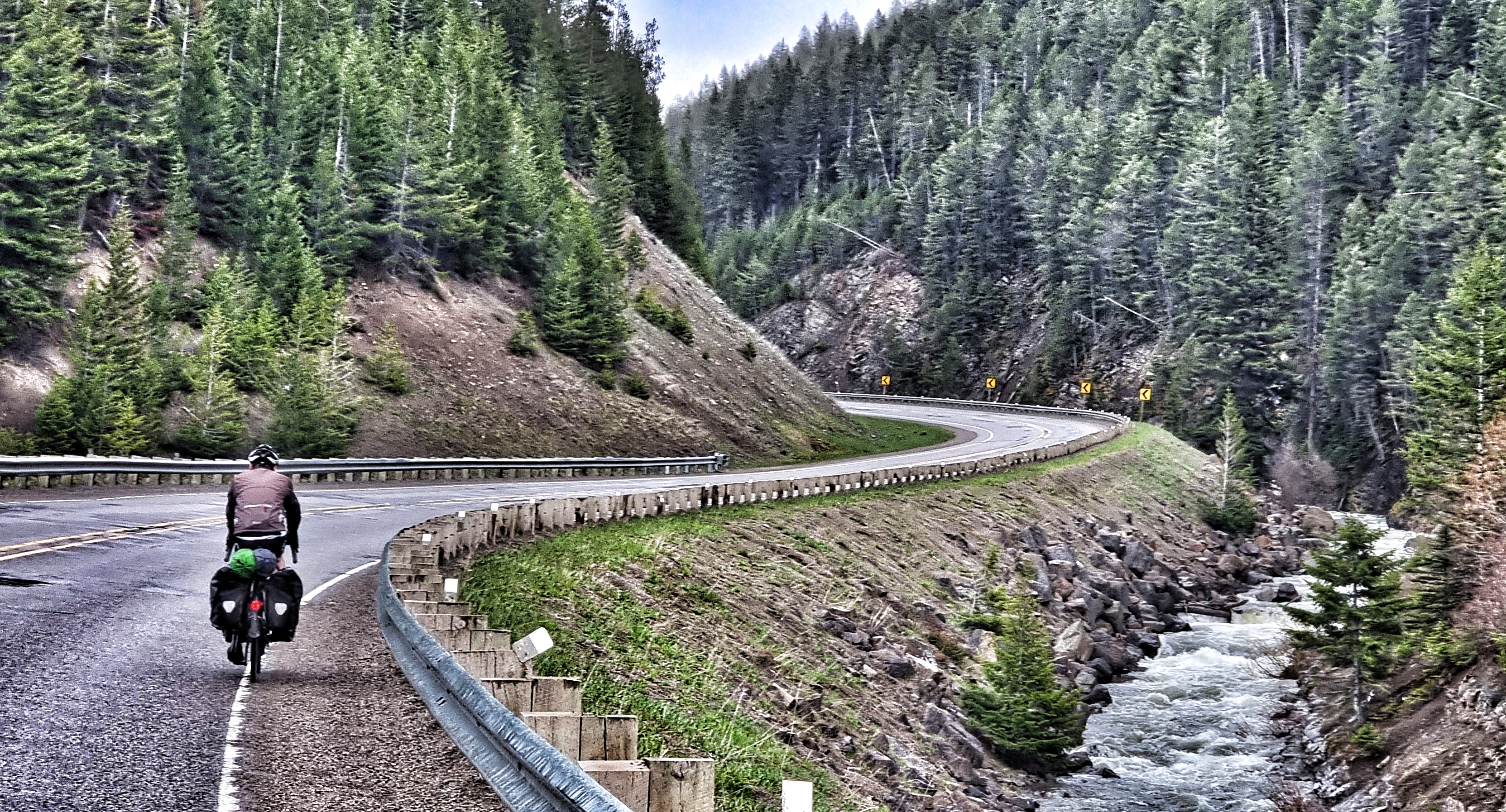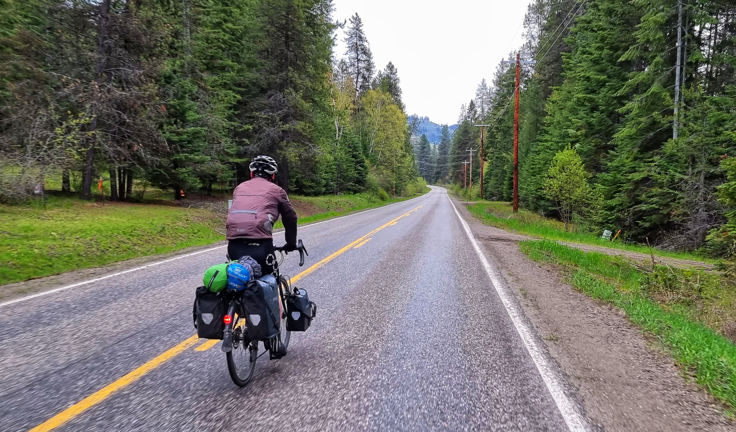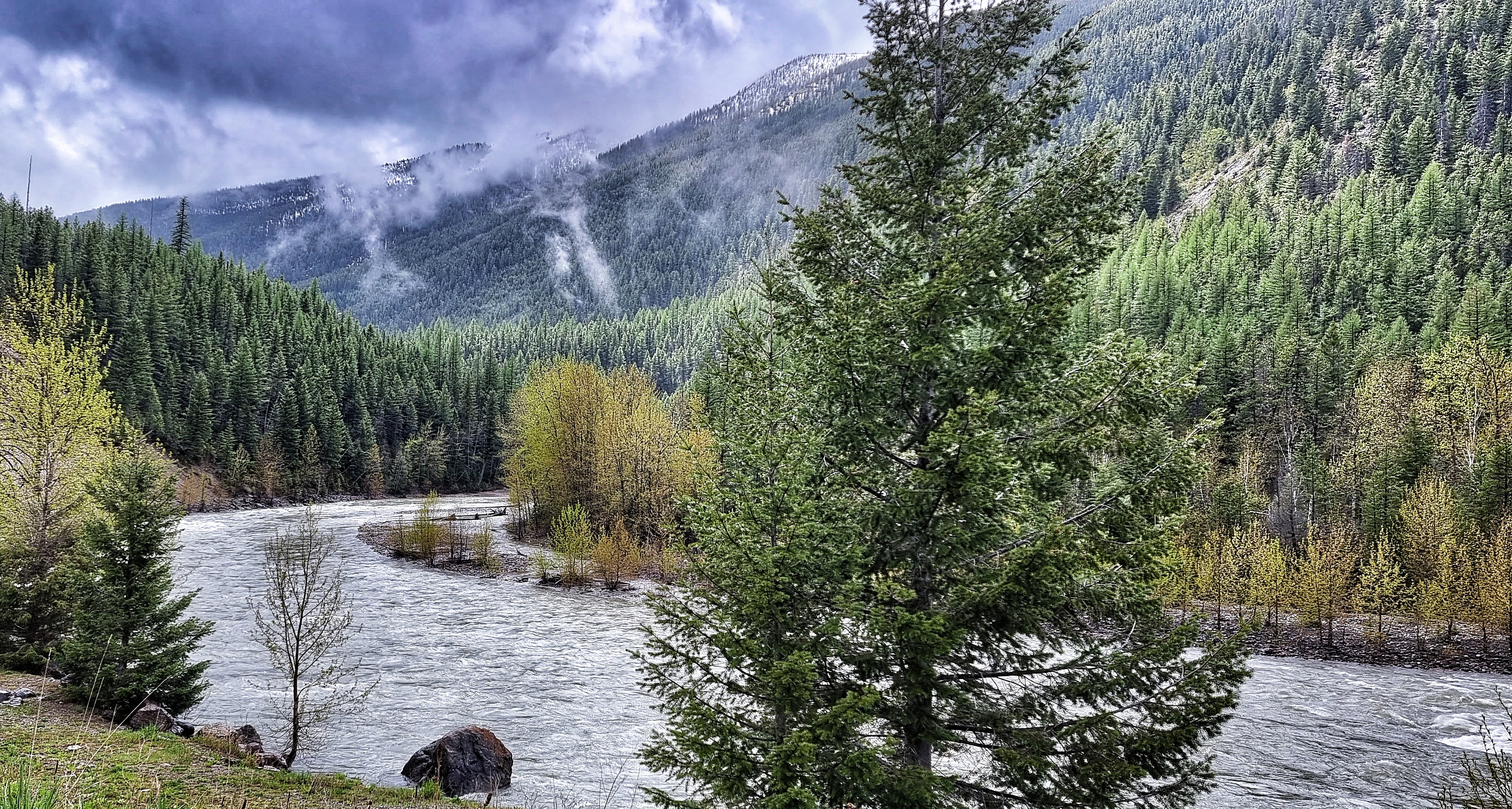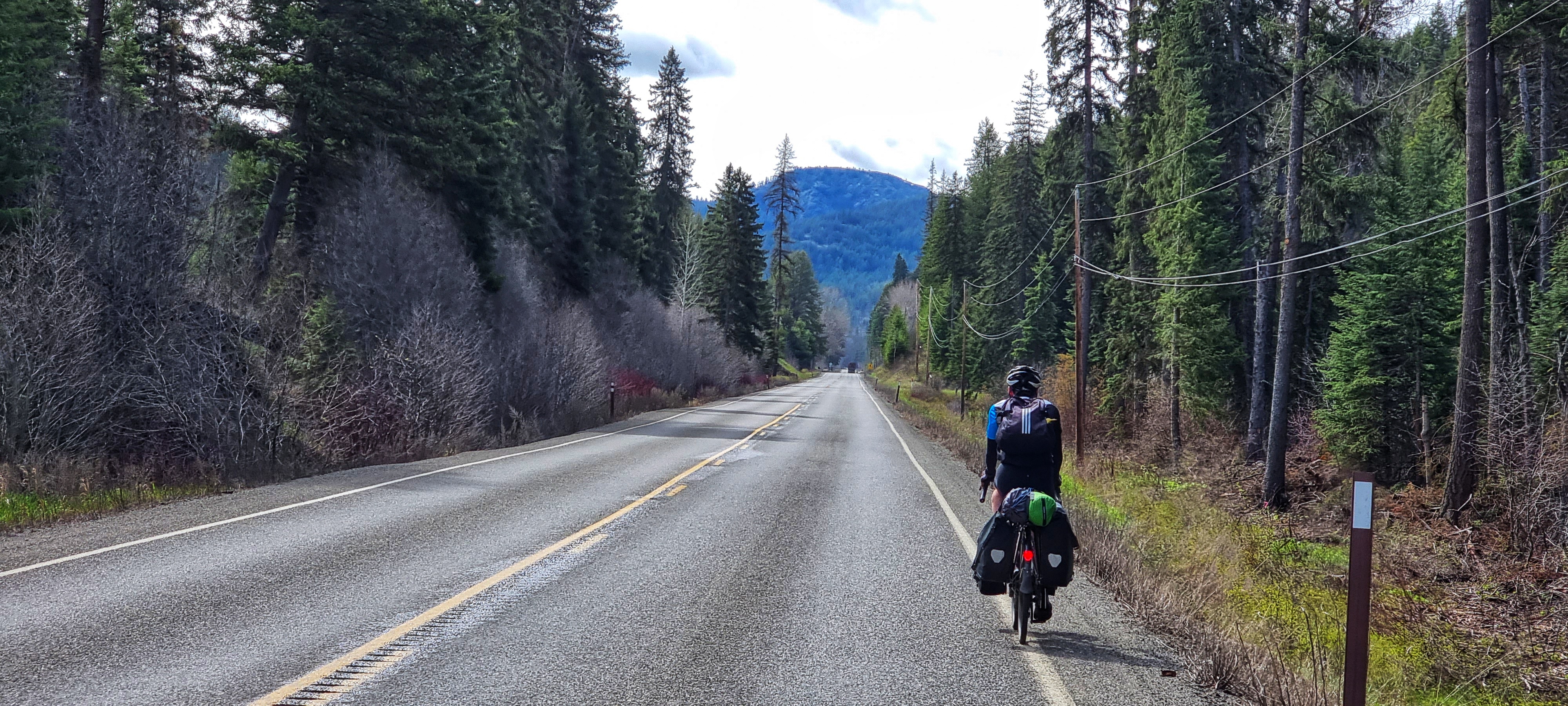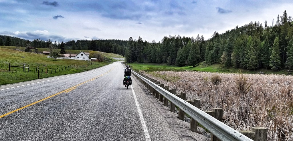 While we were relaxing inside, the heavens opened outside! Luckily by the time we remounted the steel steeds, we only had to deal with light rain & the short, sharp climb as soon as we joined the US 2 soon warmed us up! In no time we had big views over the river & railroad below, but then almost immediately gave all those hard fought for feet back! At Nimrod we left the Flathead river behind us & started following the course of the babbling Bear Creek.