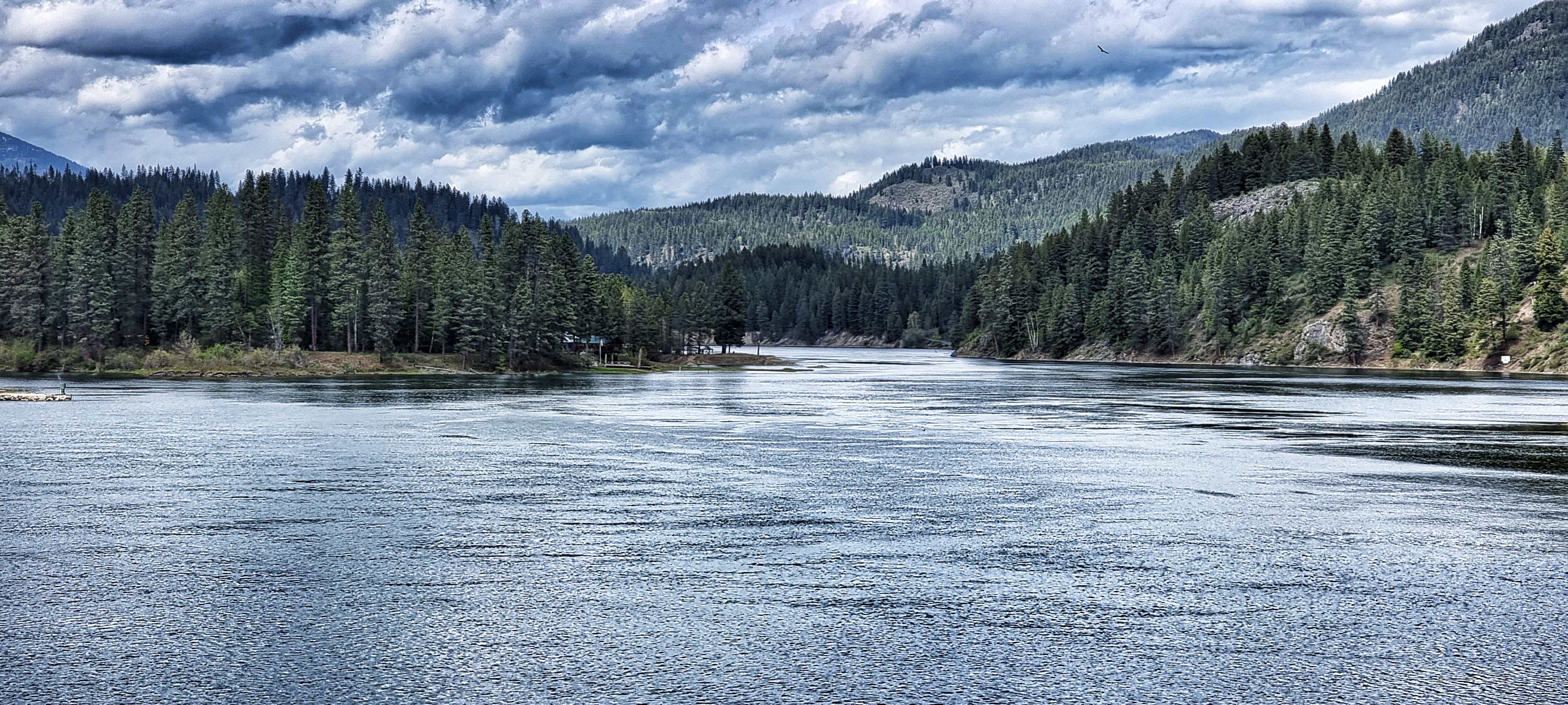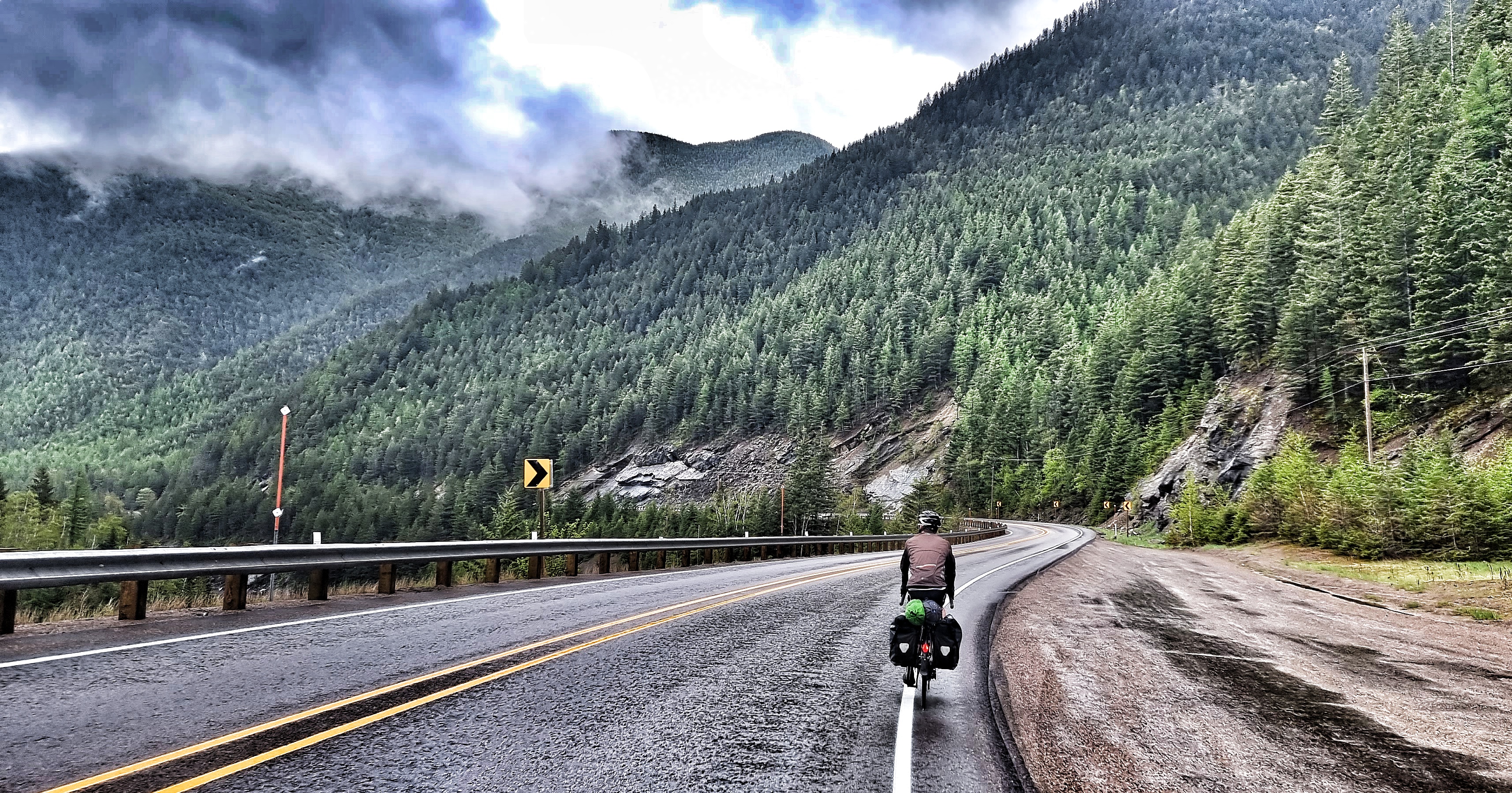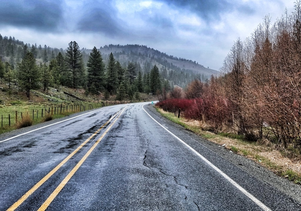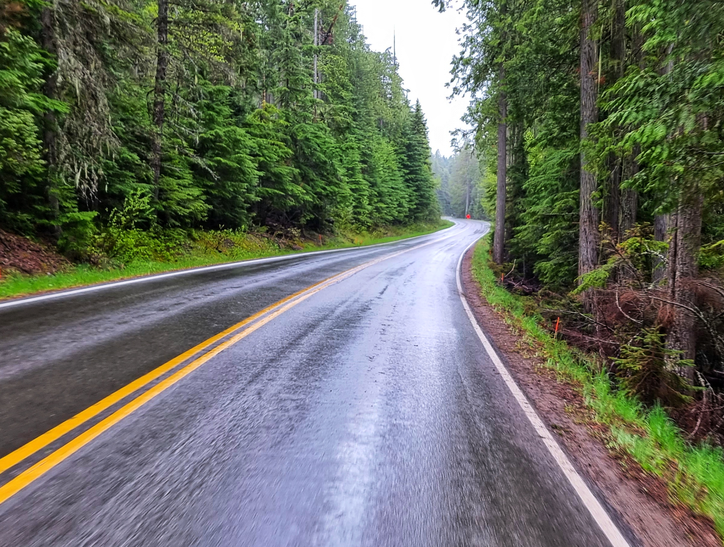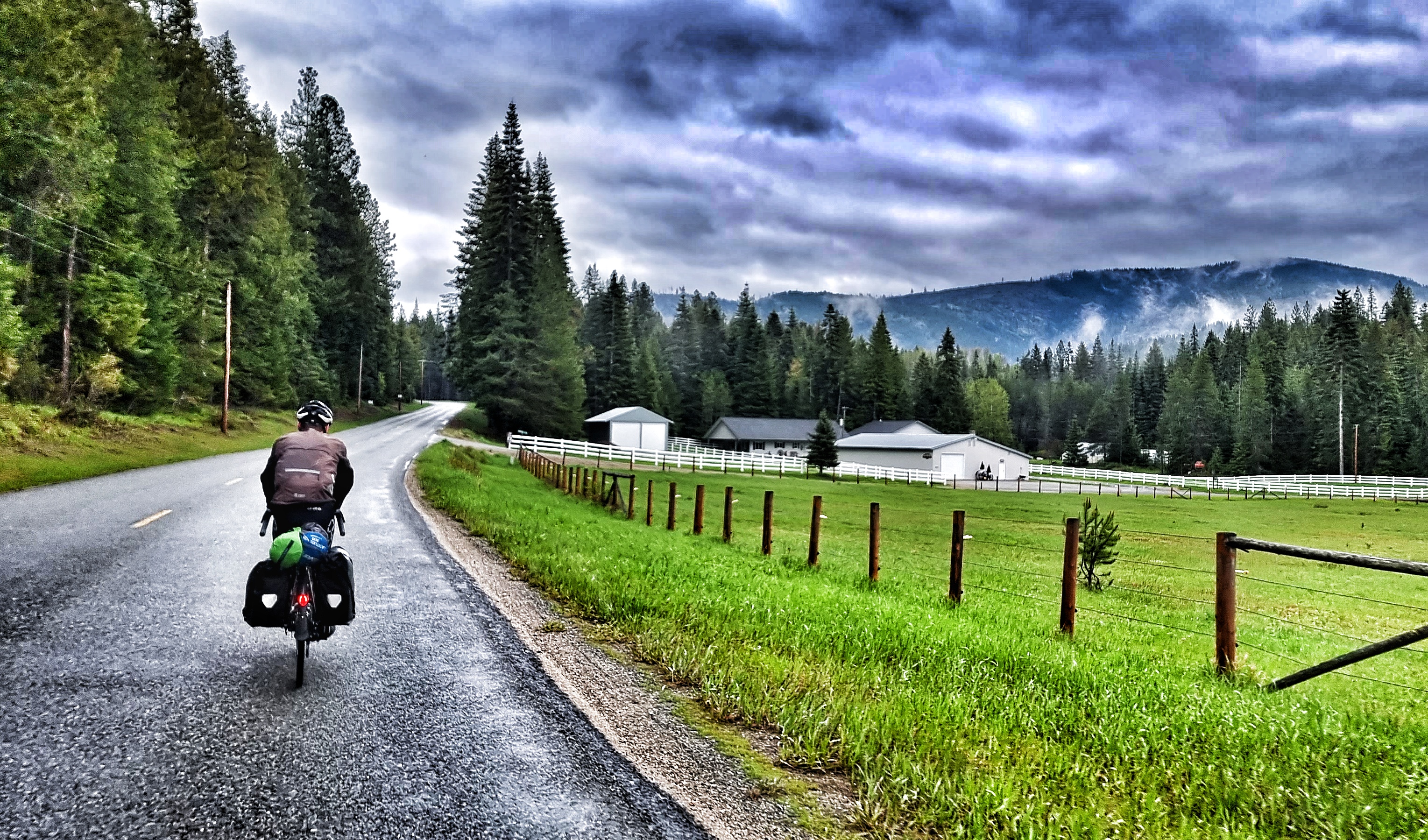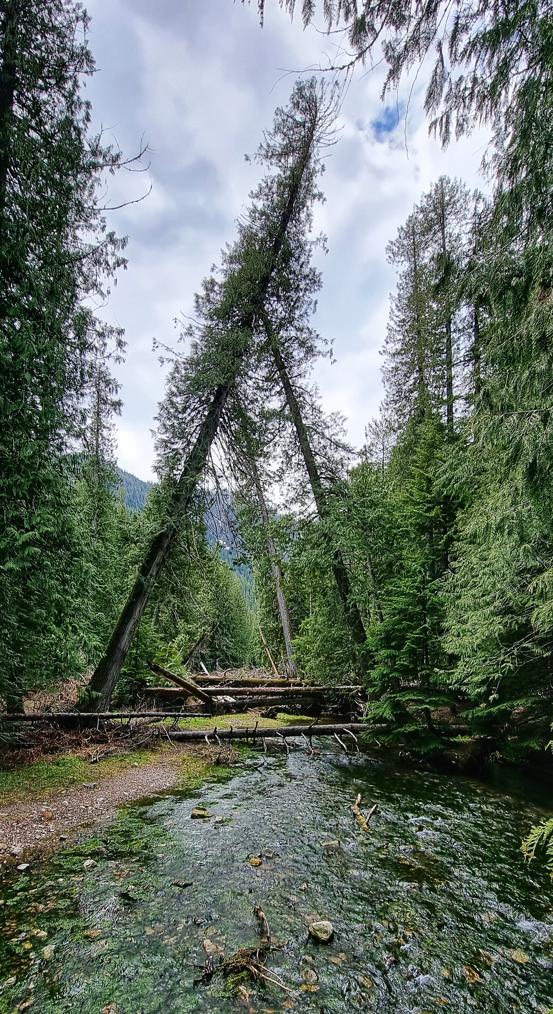 While we were relaxing inside, the heavens opened outside! Luckily by the time we remounted the steel steeds, we only had to deal with light rain & the short, sharp climb as soon as we joined the US 2 soon warmed us up! In no time we had big views over the river & railroad below, but then almost immediately gave all those hard fought for feet back! At Nimrod we left the Flathead river behind us & started following the course of the babbling Bear Creek.
