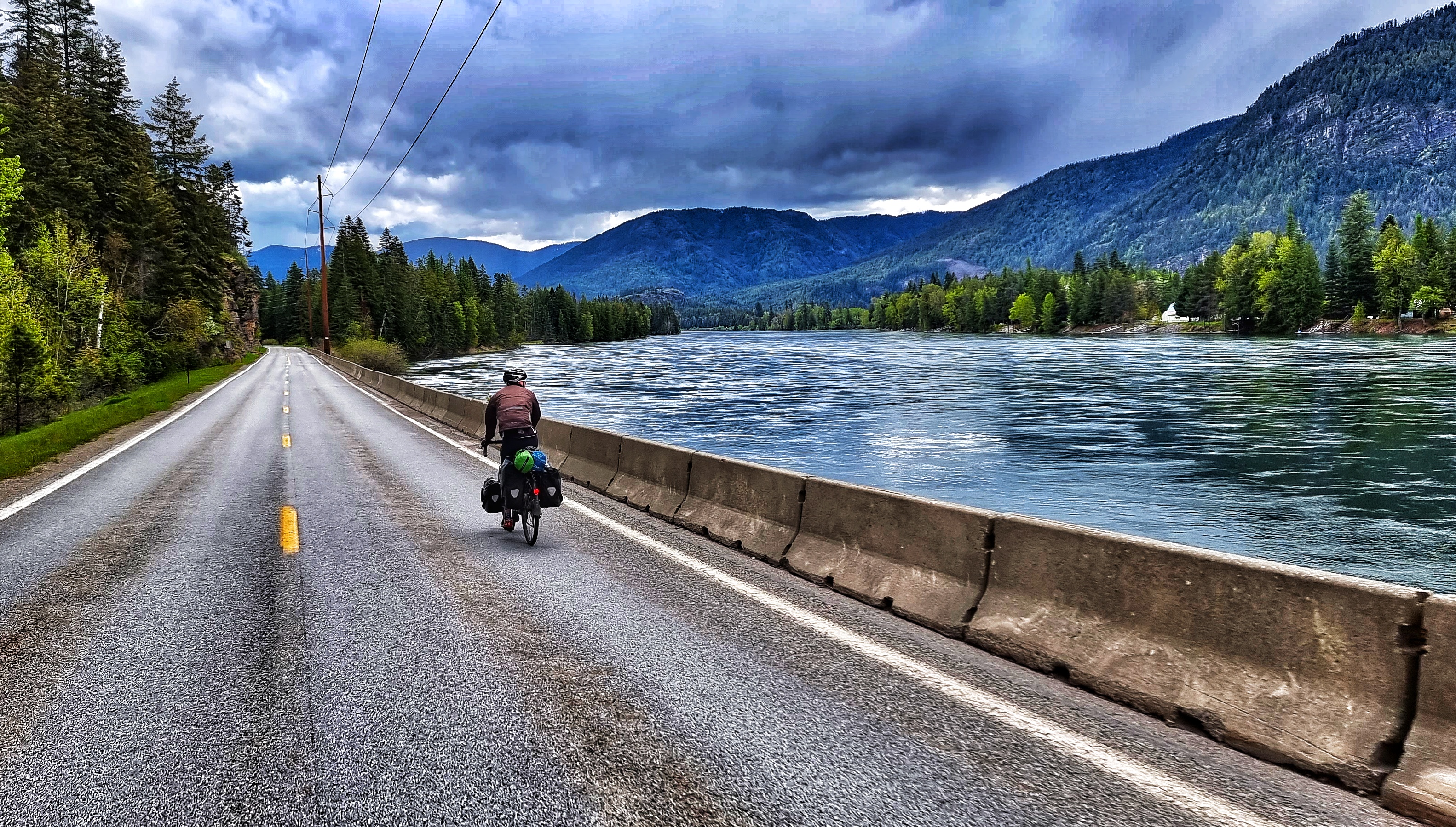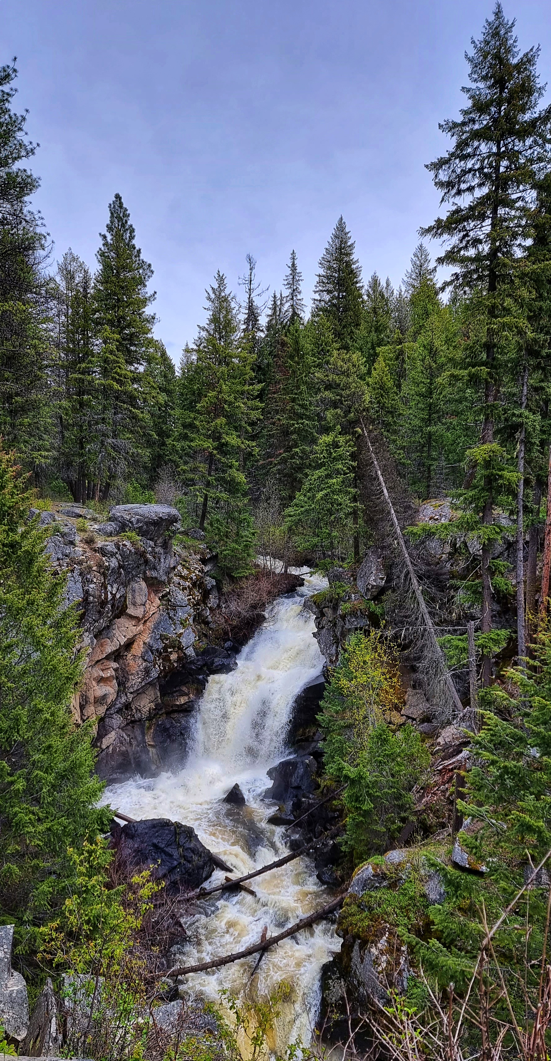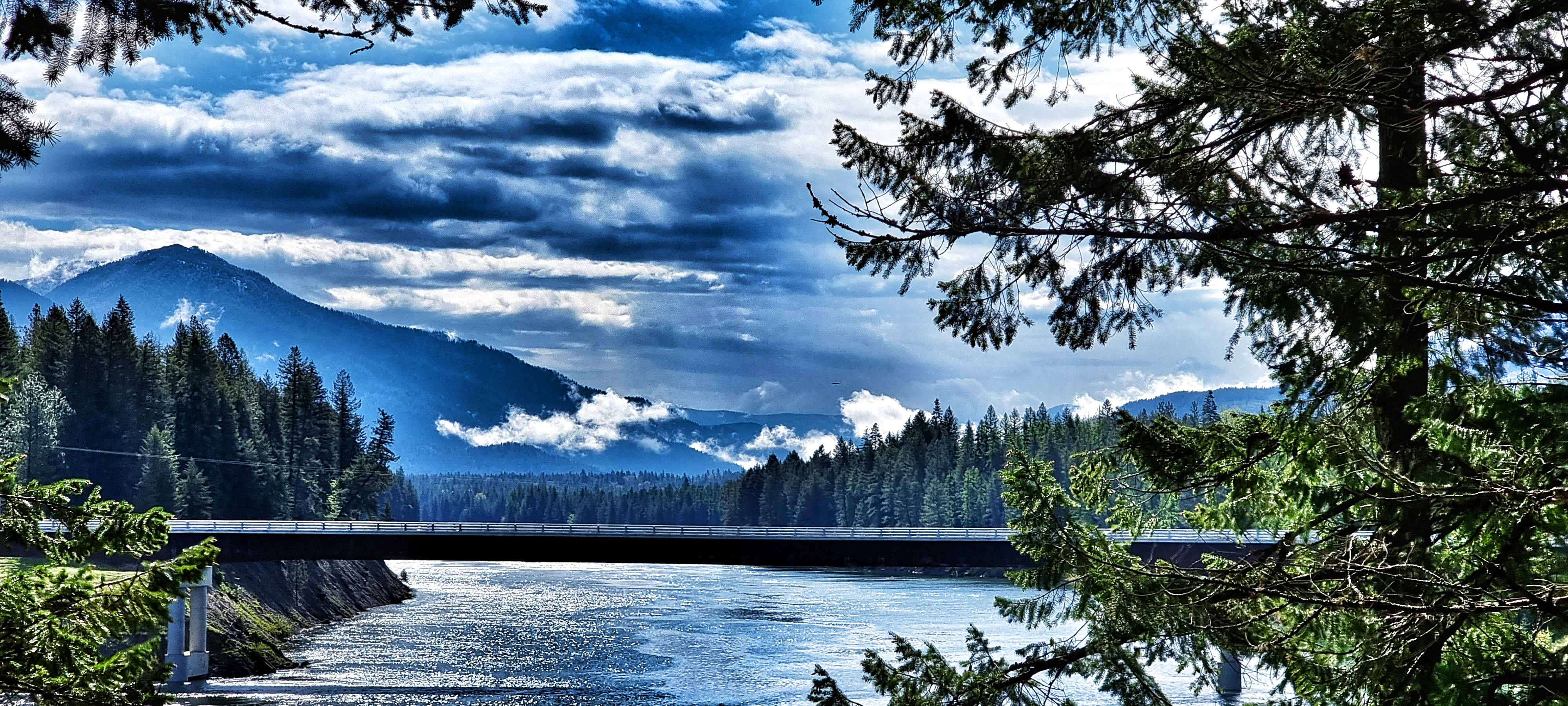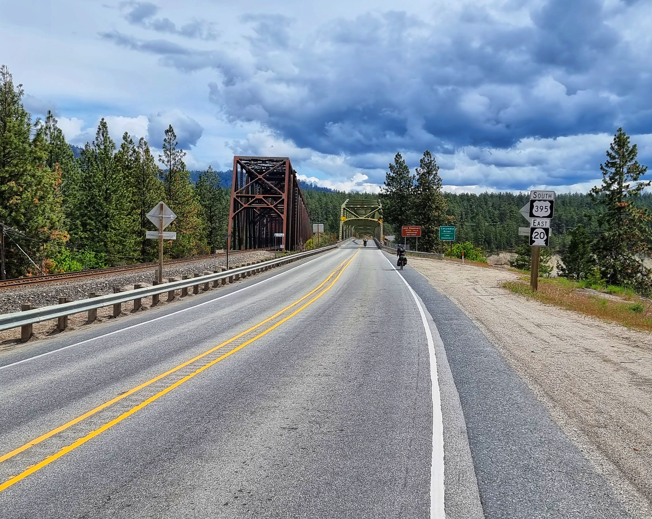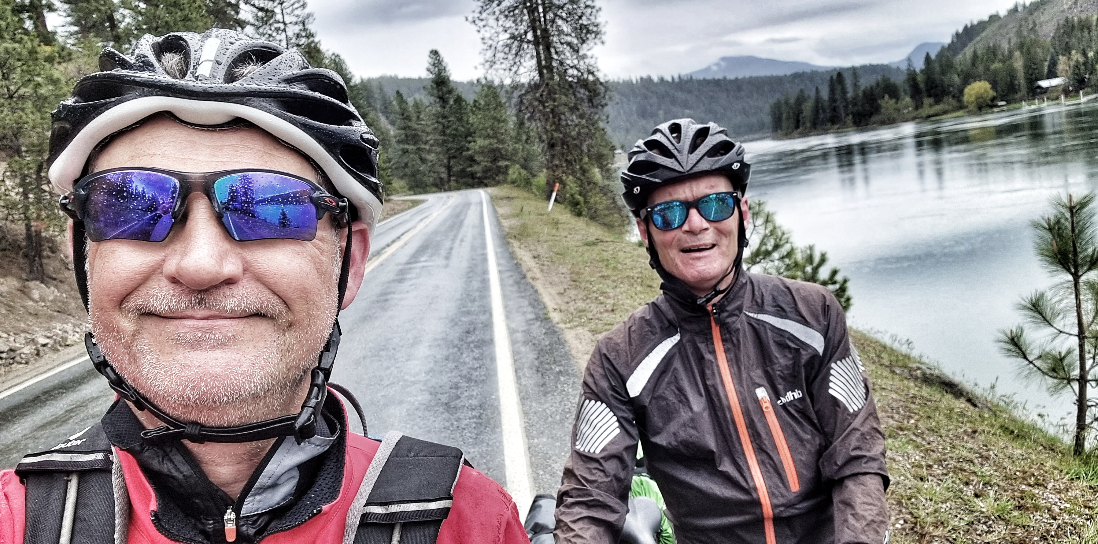 While we were relaxing inside, the heavens opened outside! Luckily by the time we remounted the steel steeds, we only had to deal with light rain & the short, sharp climb as soon as we joined the US 2 soon warmed us up! In no time we had big views over the river & railroad below, but then almost immediately gave all those hard fought for feet back! At Nimrod we left the Flathead river behind us & started following the course of the babbling Bear Creek.