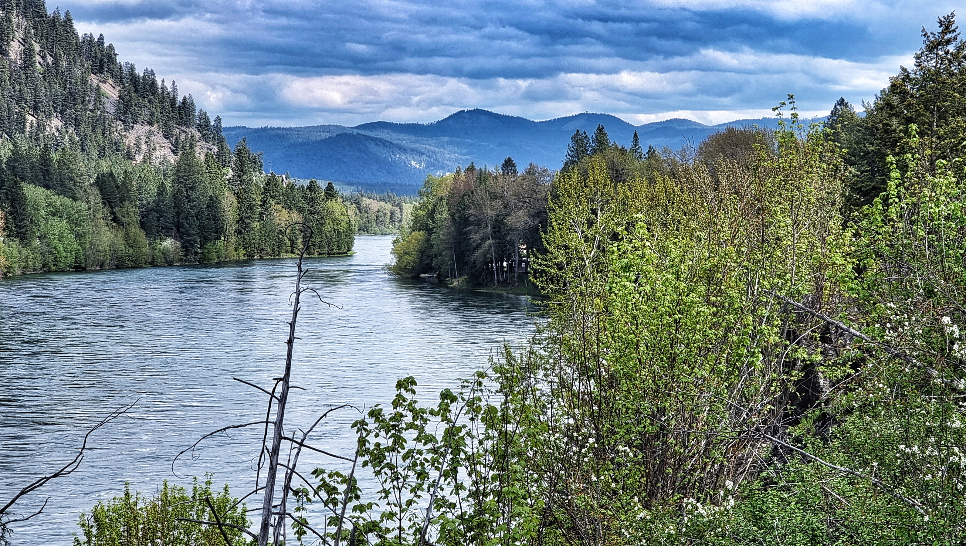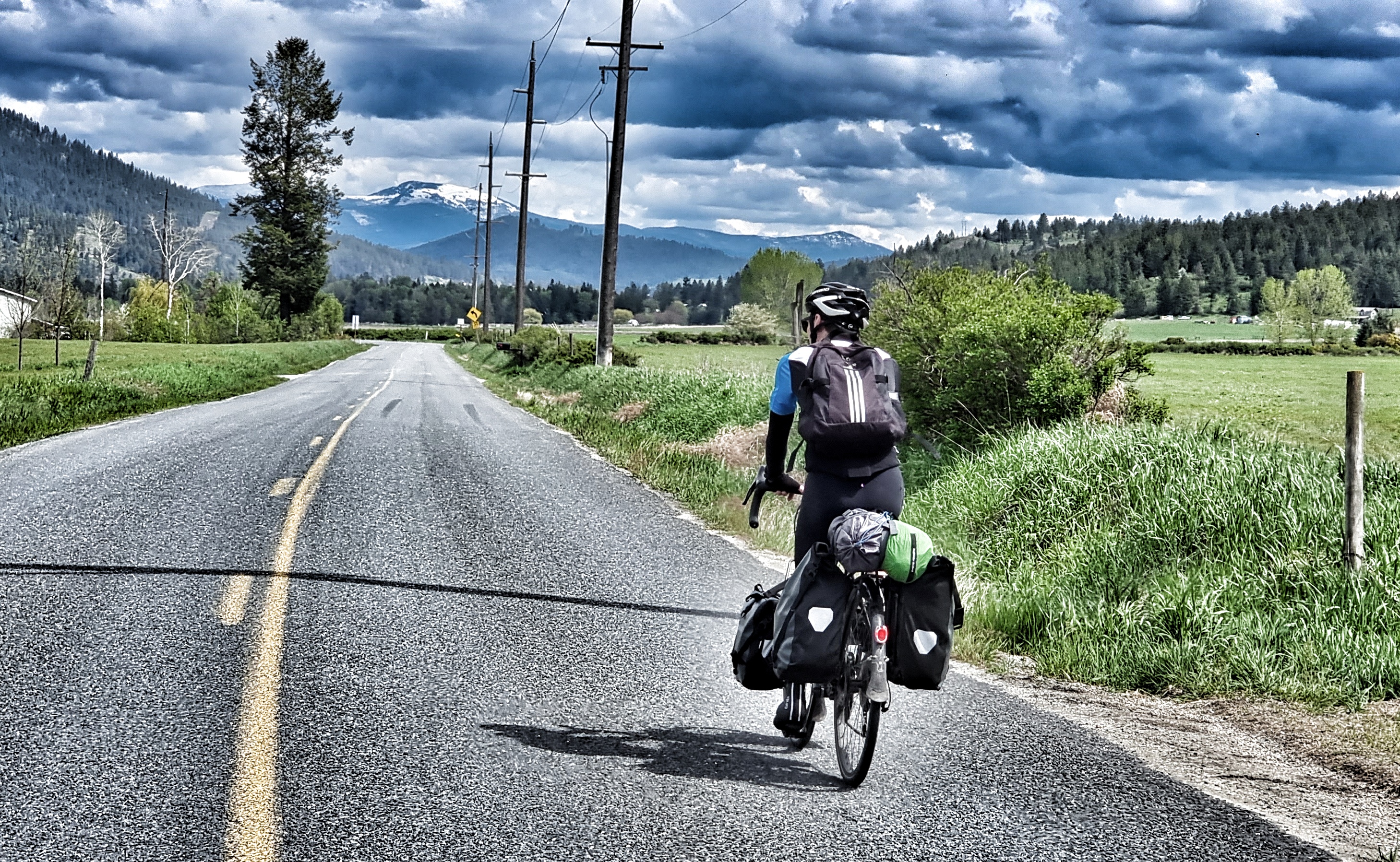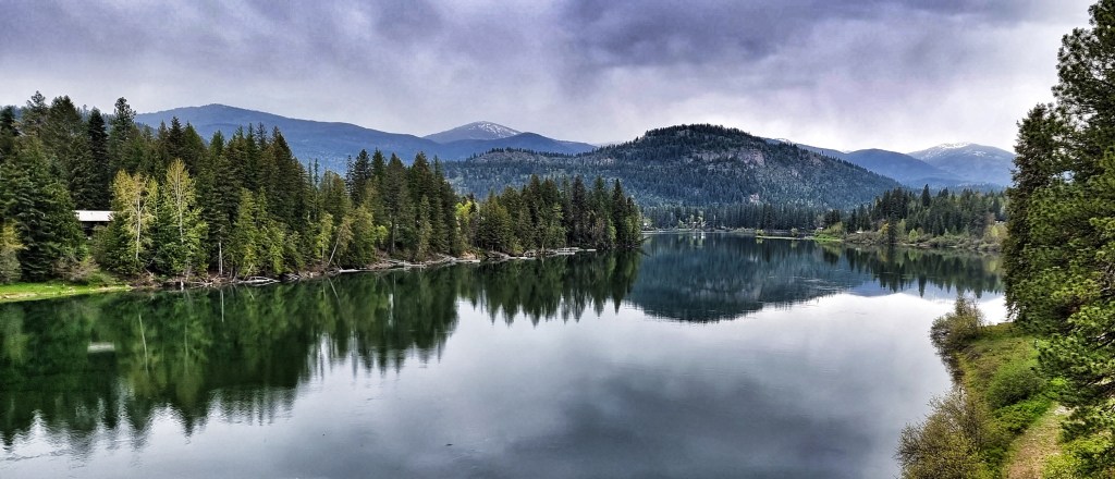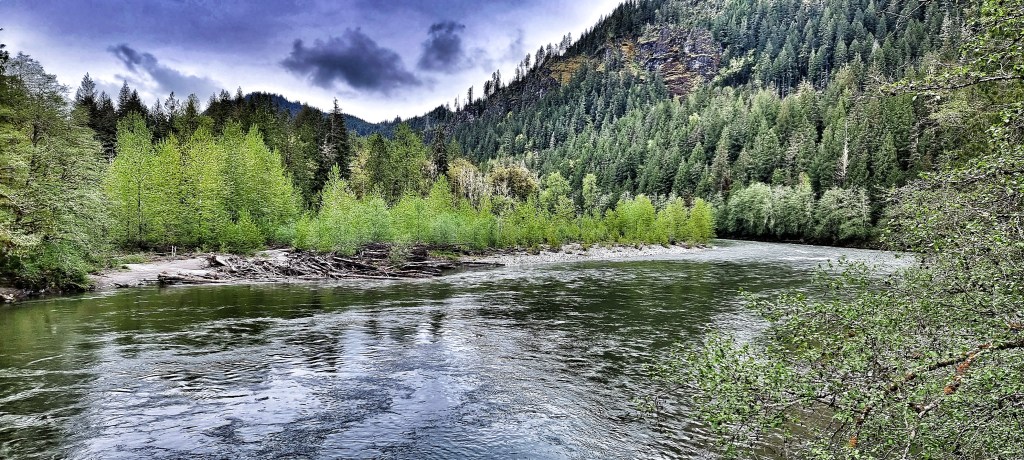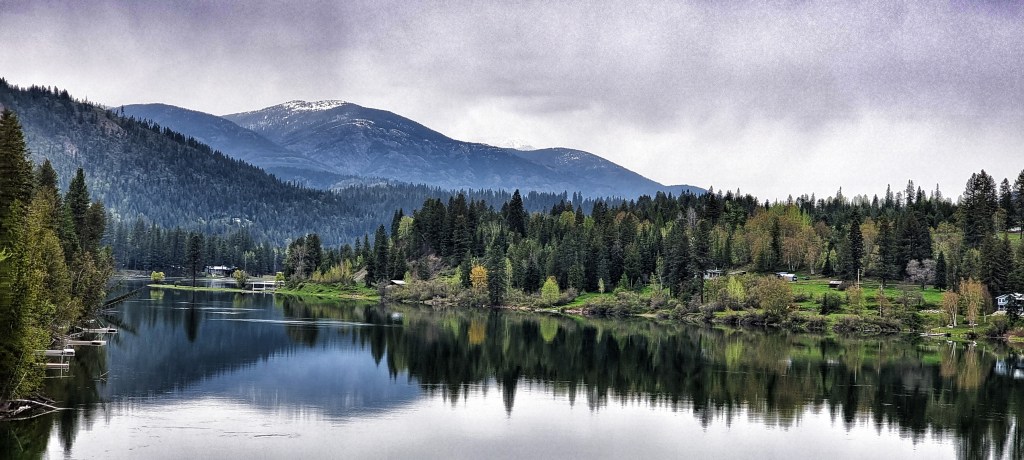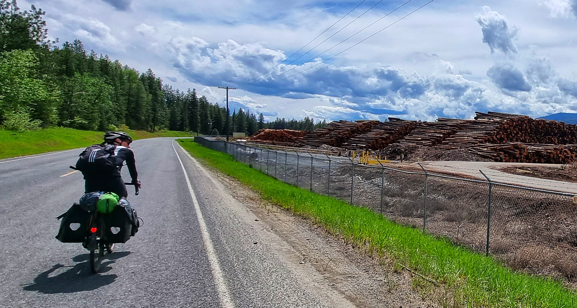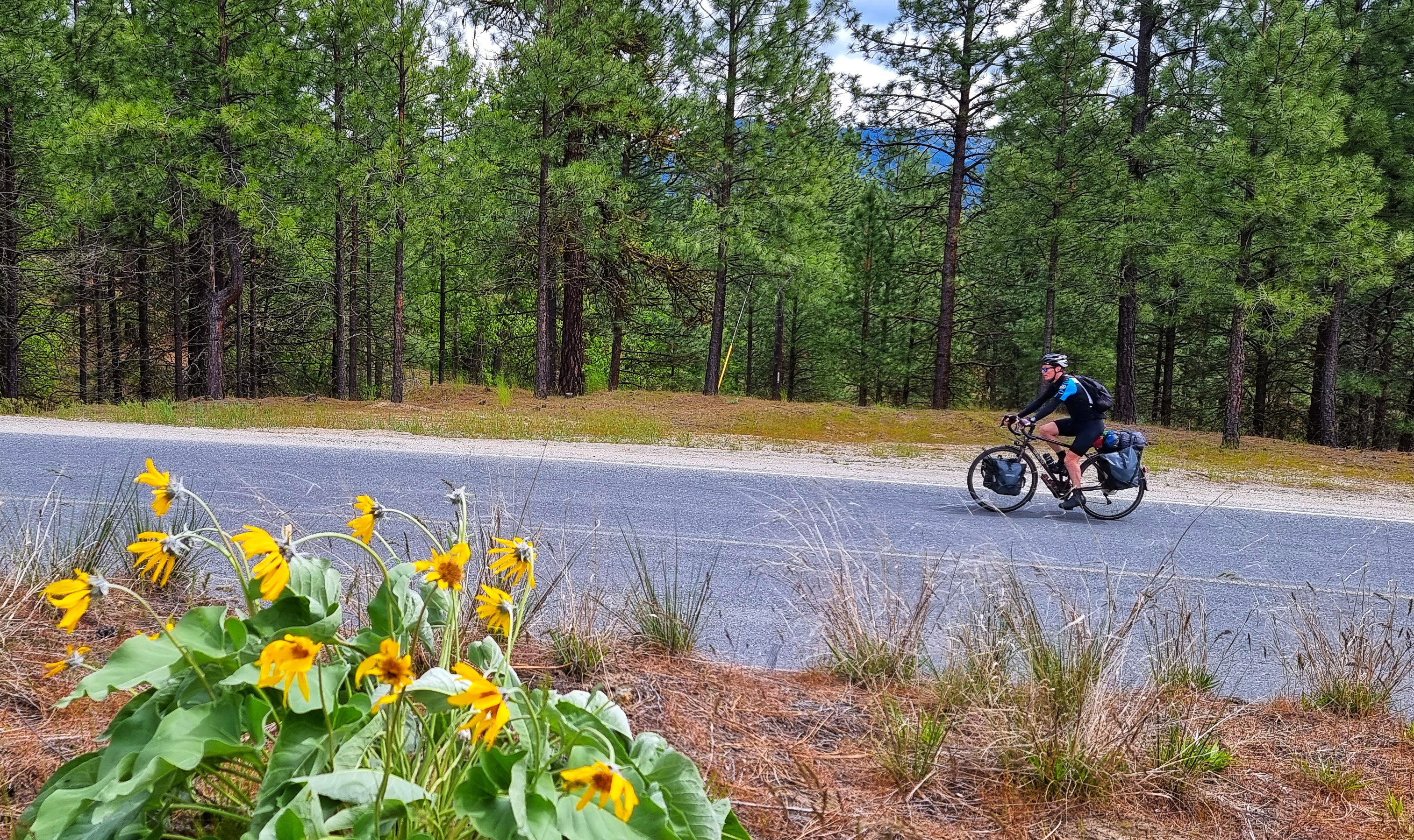 While we were relaxing inside, the heavens opened outside! Luckily by the time we remounted the steel steeds, we only had to deal with light rain & the short, sharp climb as soon as we joined the US 2 soon warmed us up! In no time we had big views over the river & railroad below, but then almost immediately gave all those hard fought for feet back! At Nimrod we left the Flathead river behind us & started following the course of the babbling Bear Creek.