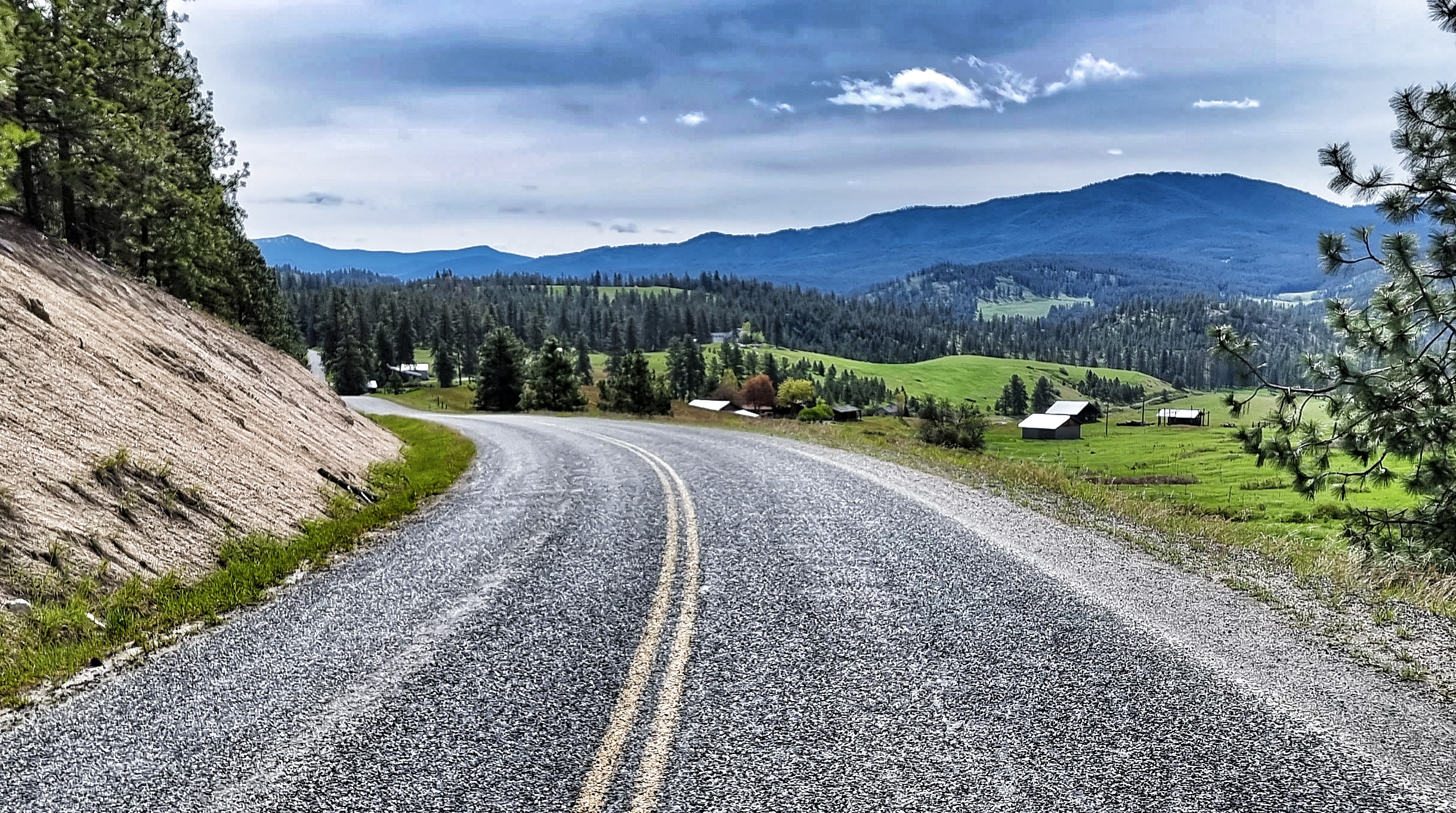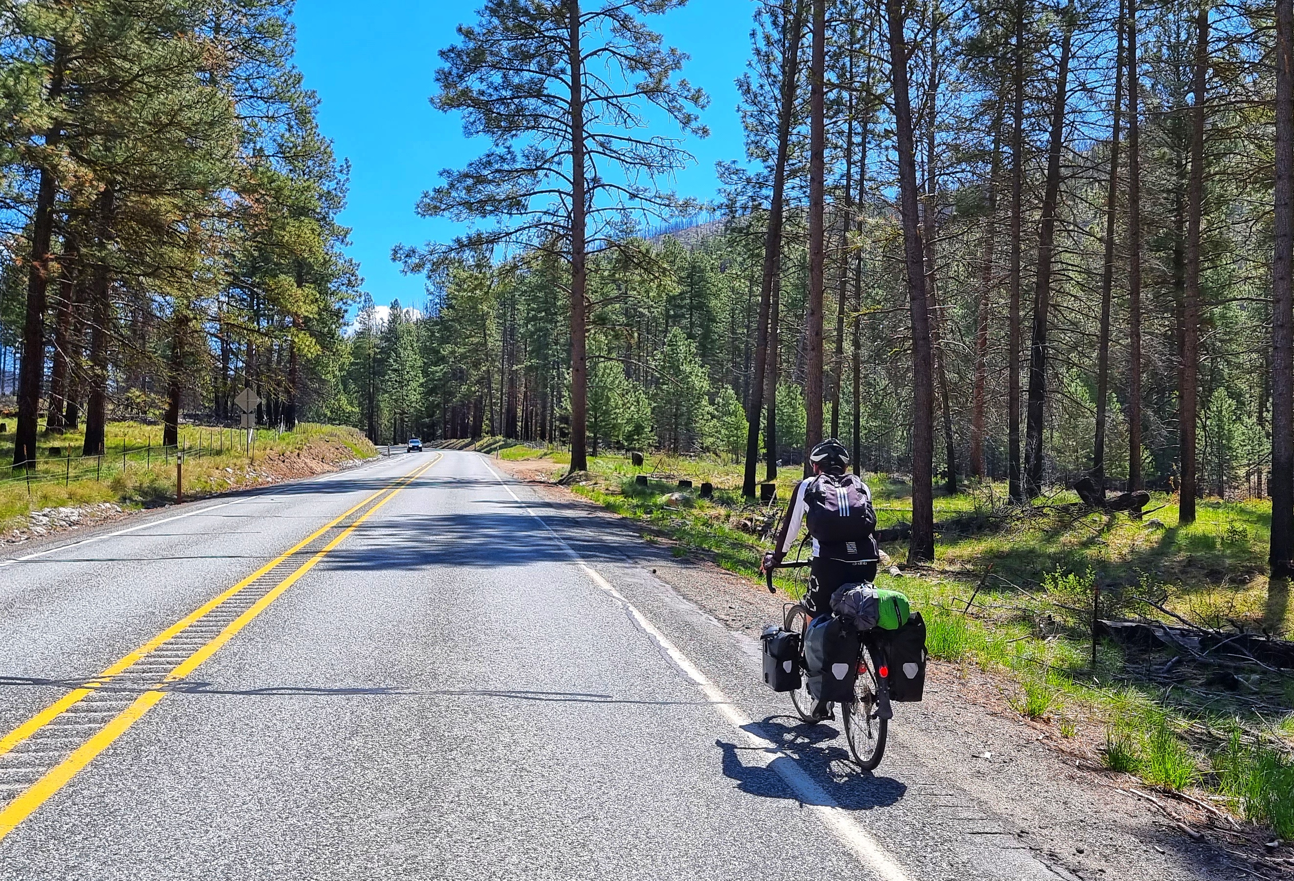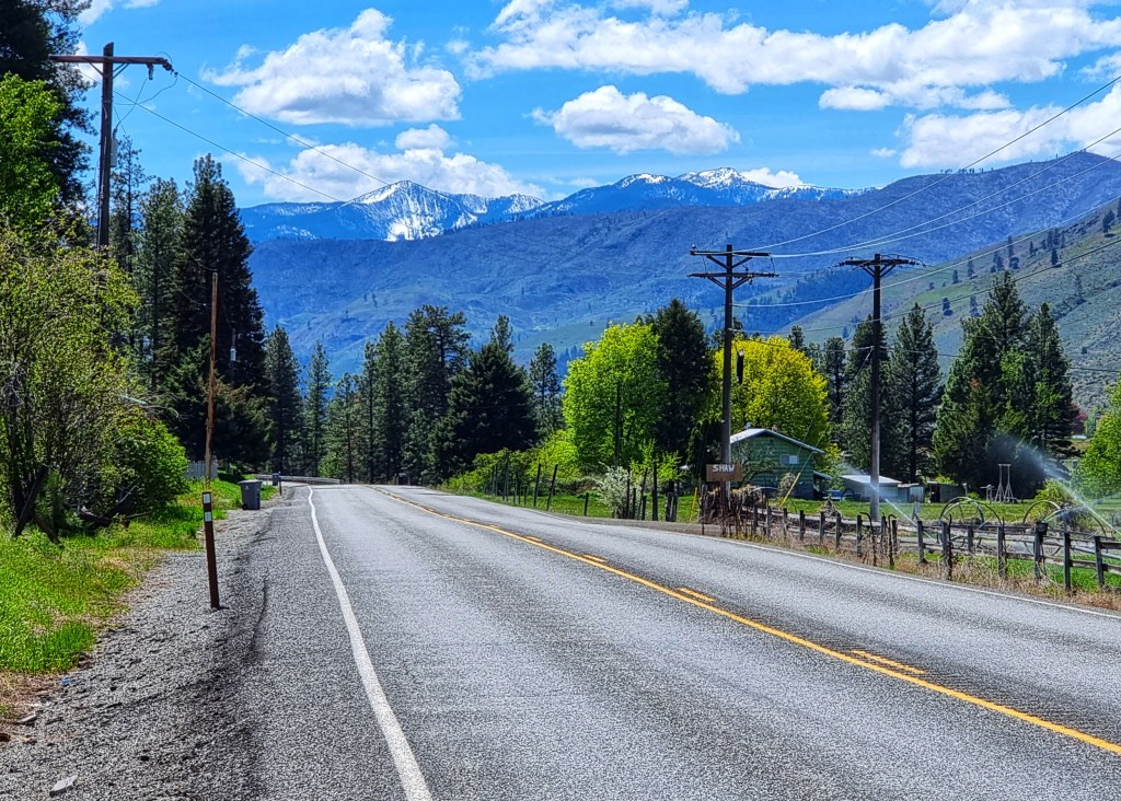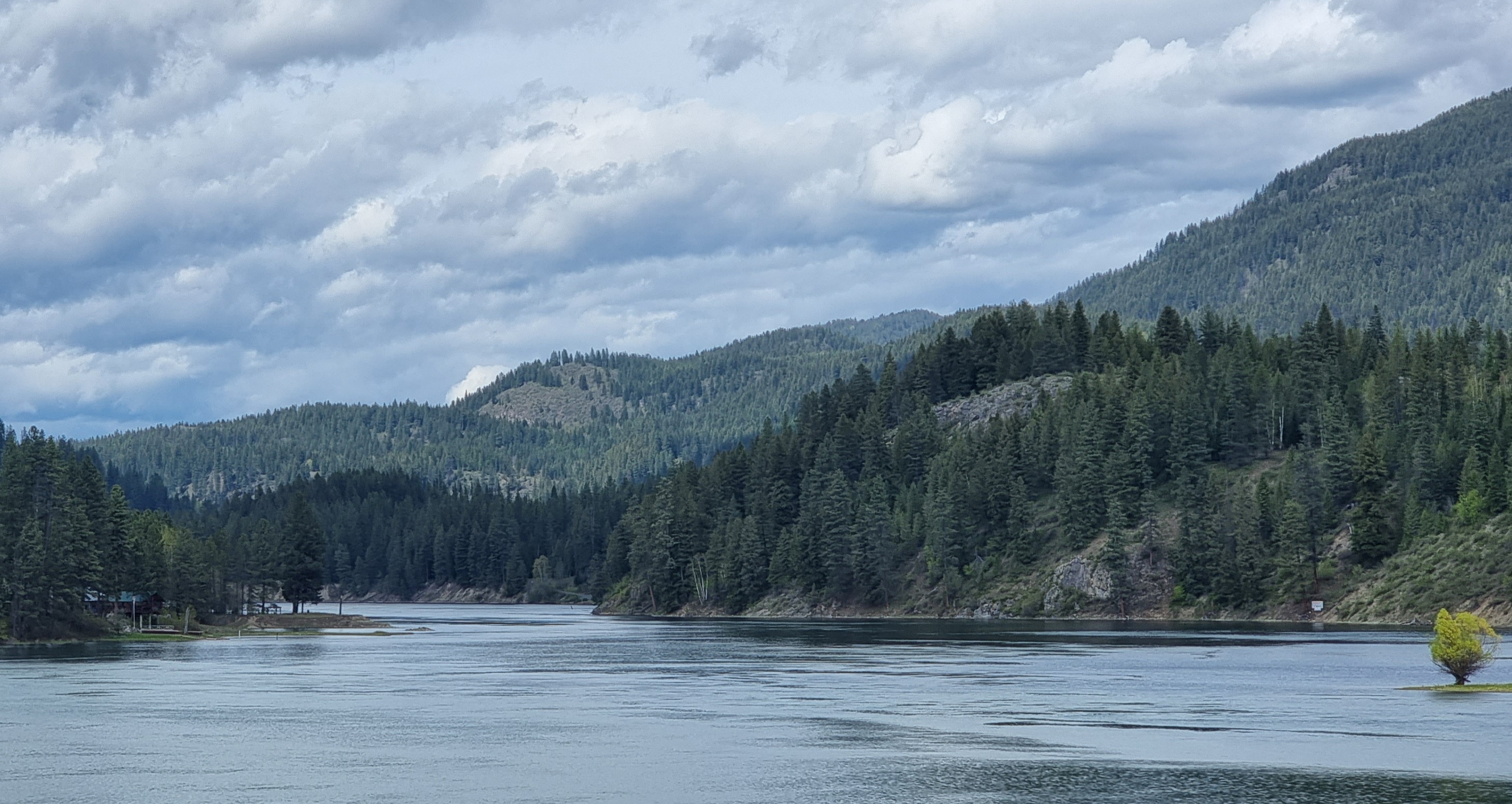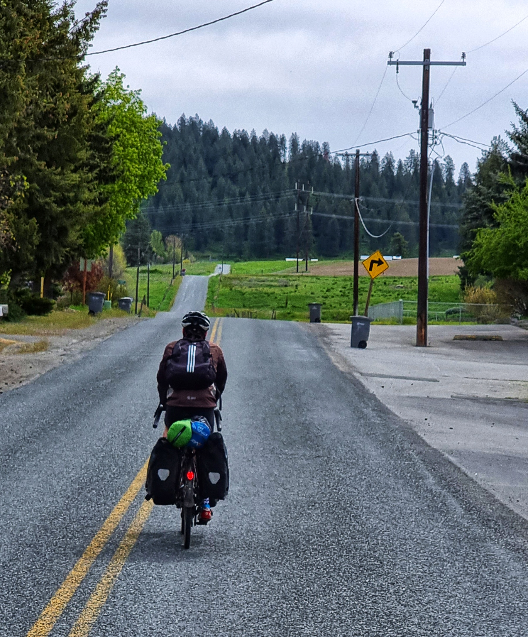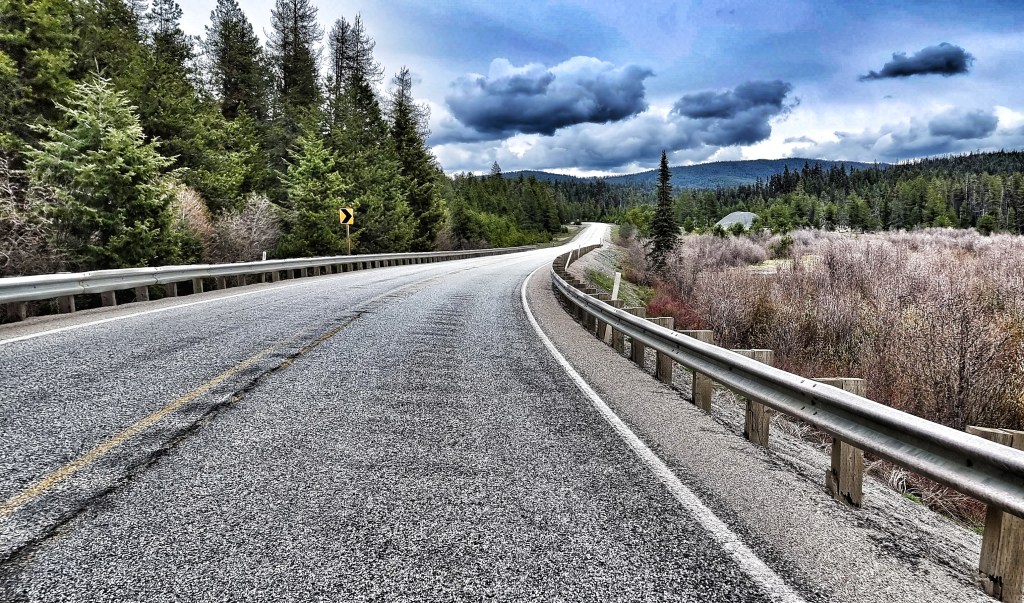 While we were relaxing inside, the heavens opened outside! Luckily by the time we remounted the steel steeds, we only had to deal with light rain & the short, sharp climb as soon as we joined the US 2 soon warmed us up! In no time we had big views over the river & railroad below, but then almost immediately gave all those hard fought for feet back! At Nimrod we left the Flathead river behind us & started following the course of the babbling Bear Creek.