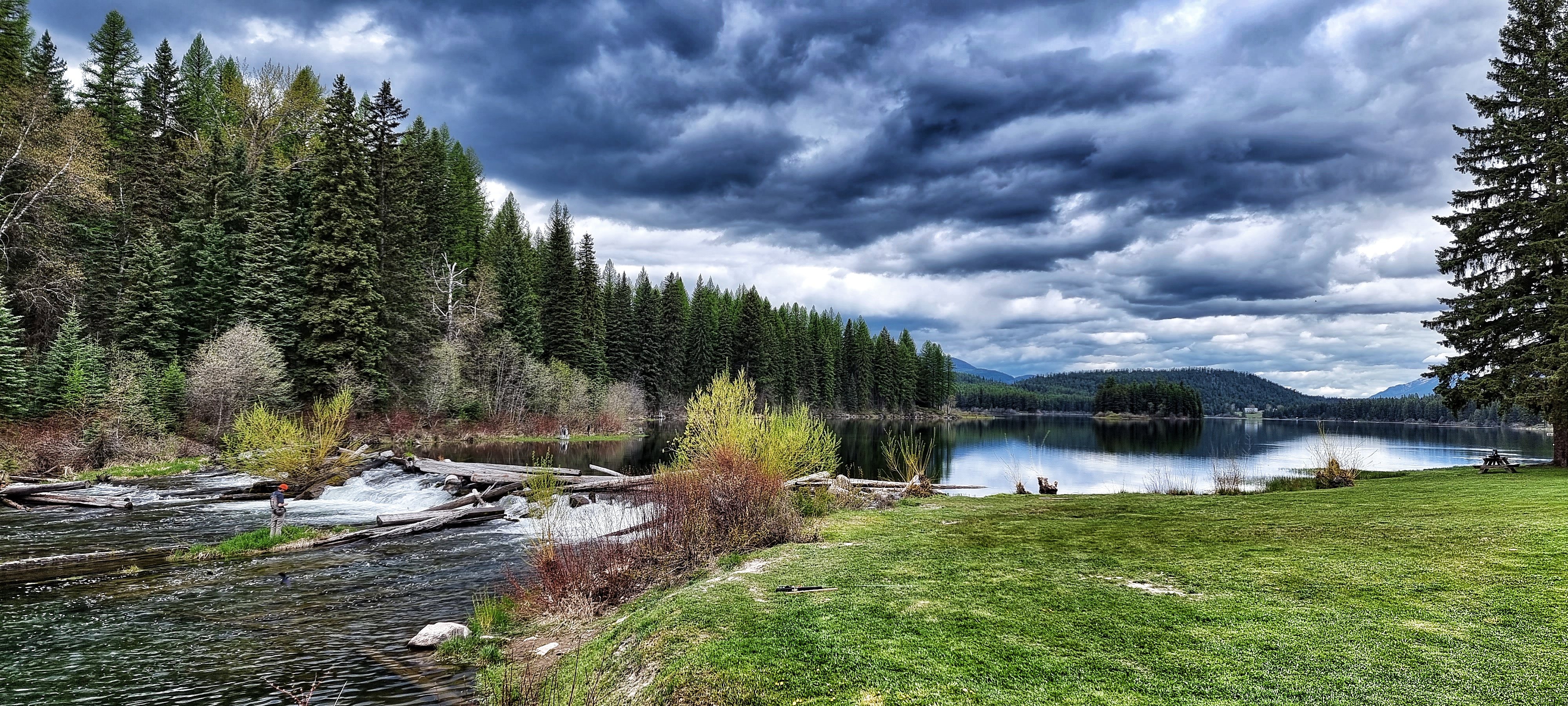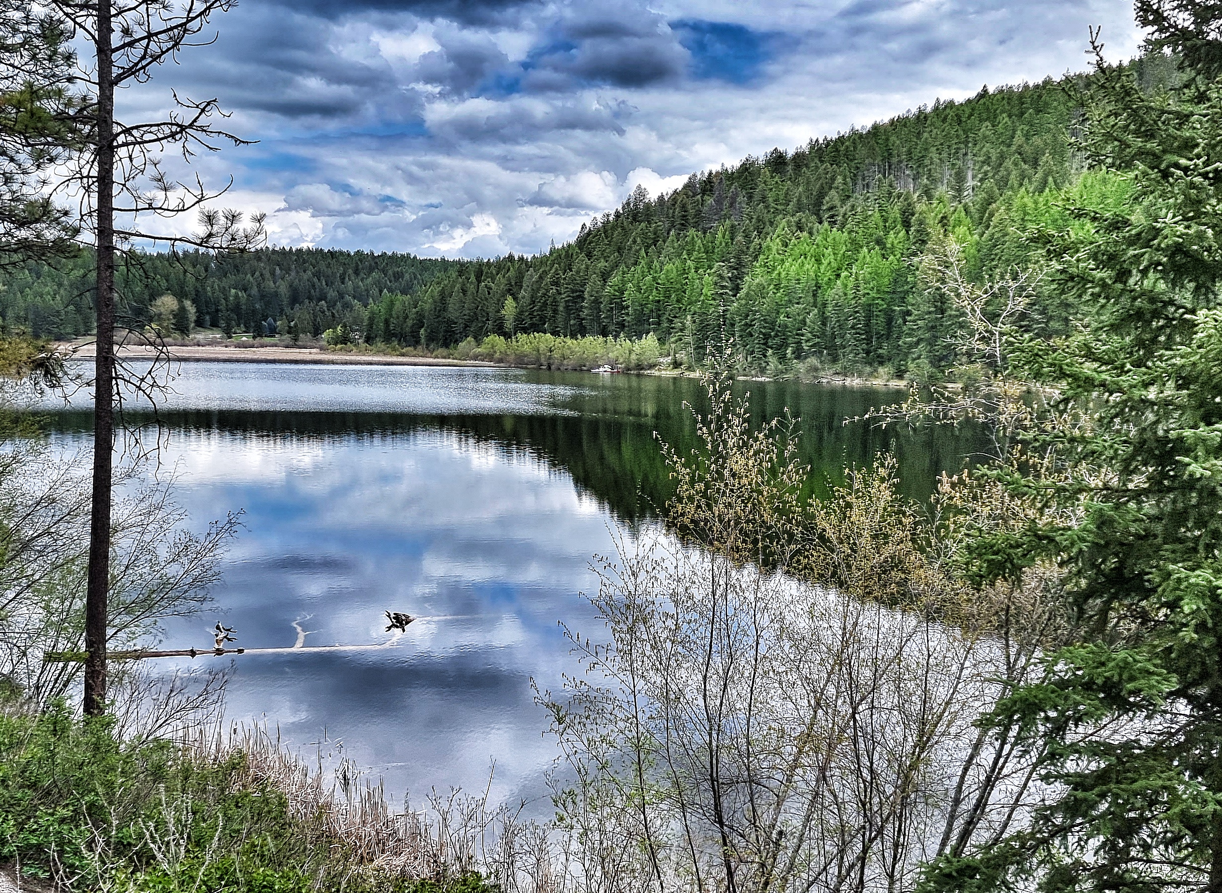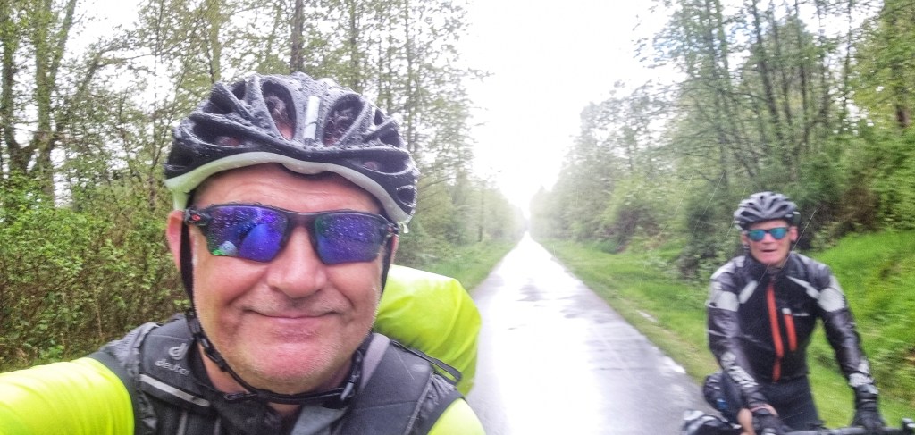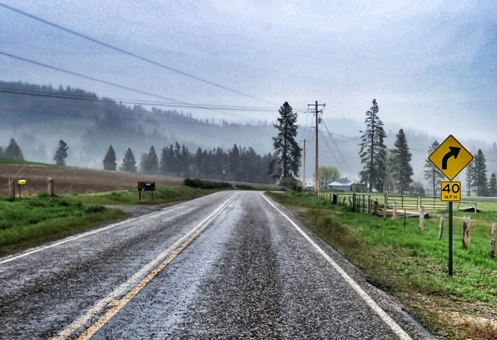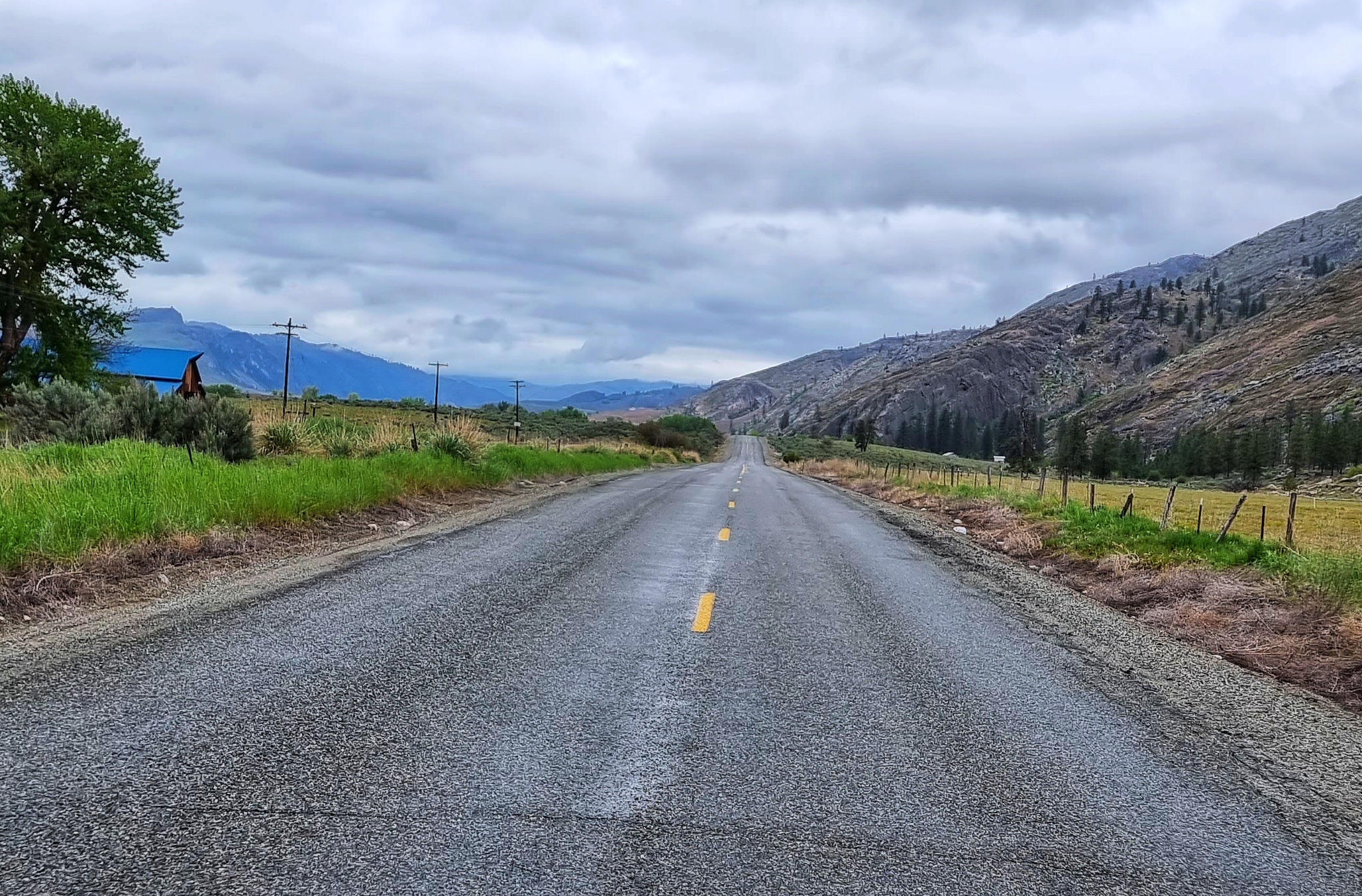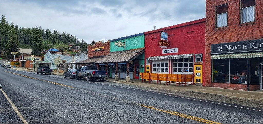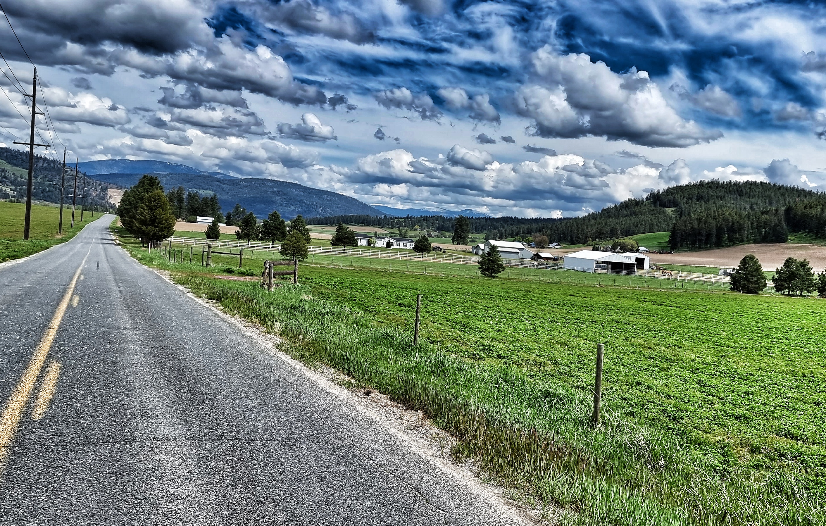 While we were relaxing inside, the heavens opened outside! Luckily by the time we remounted the steel steeds, we only had to deal with light rain & the short, sharp climb as soon as we joined the US 2 soon warmed us up! In no time we had big views over the river & railroad below, but then almost immediately gave all those hard fought for feet back! At Nimrod we left the Flathead river behind us & started following the course of the babbling Bear Creek.