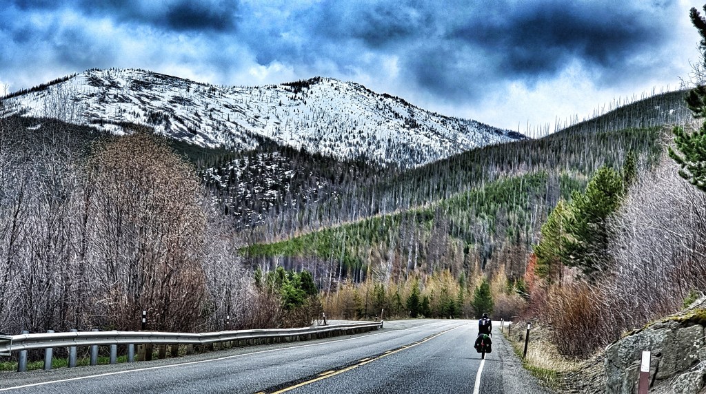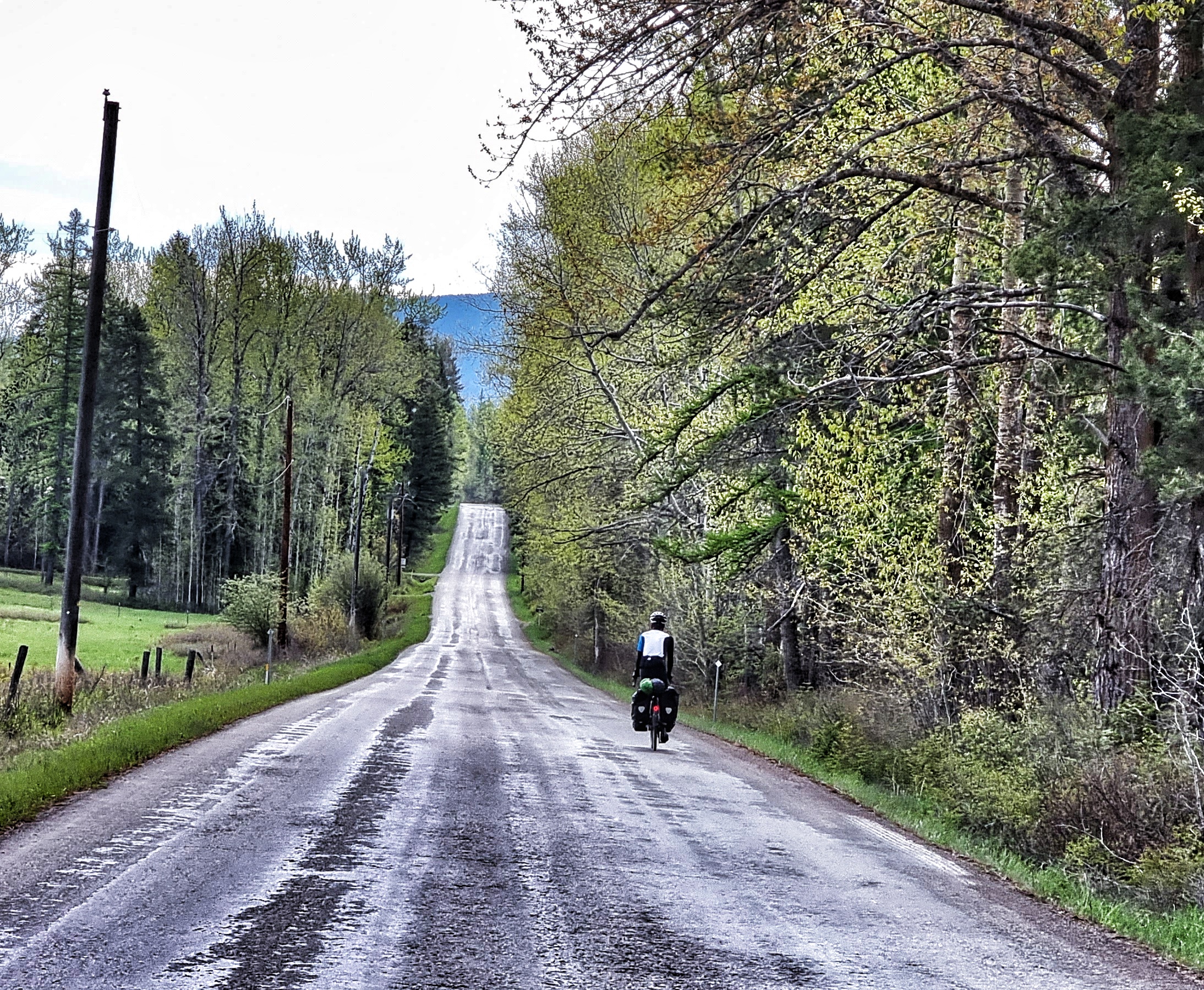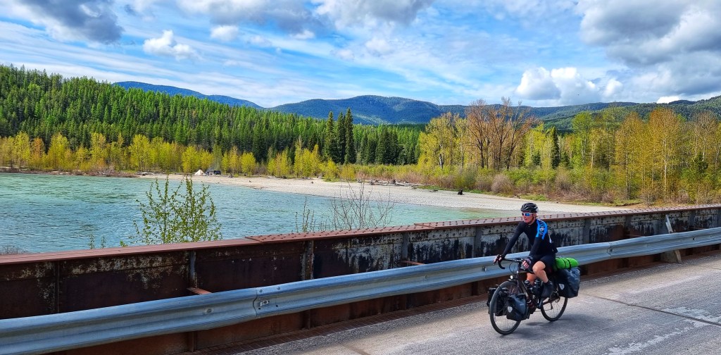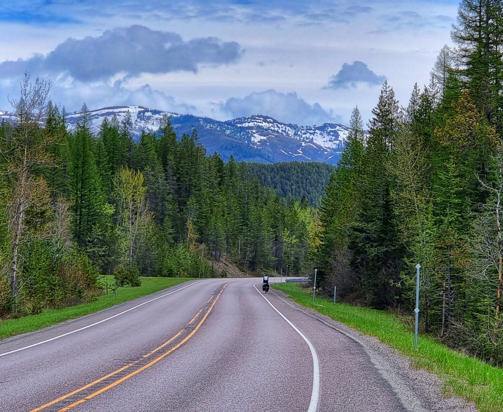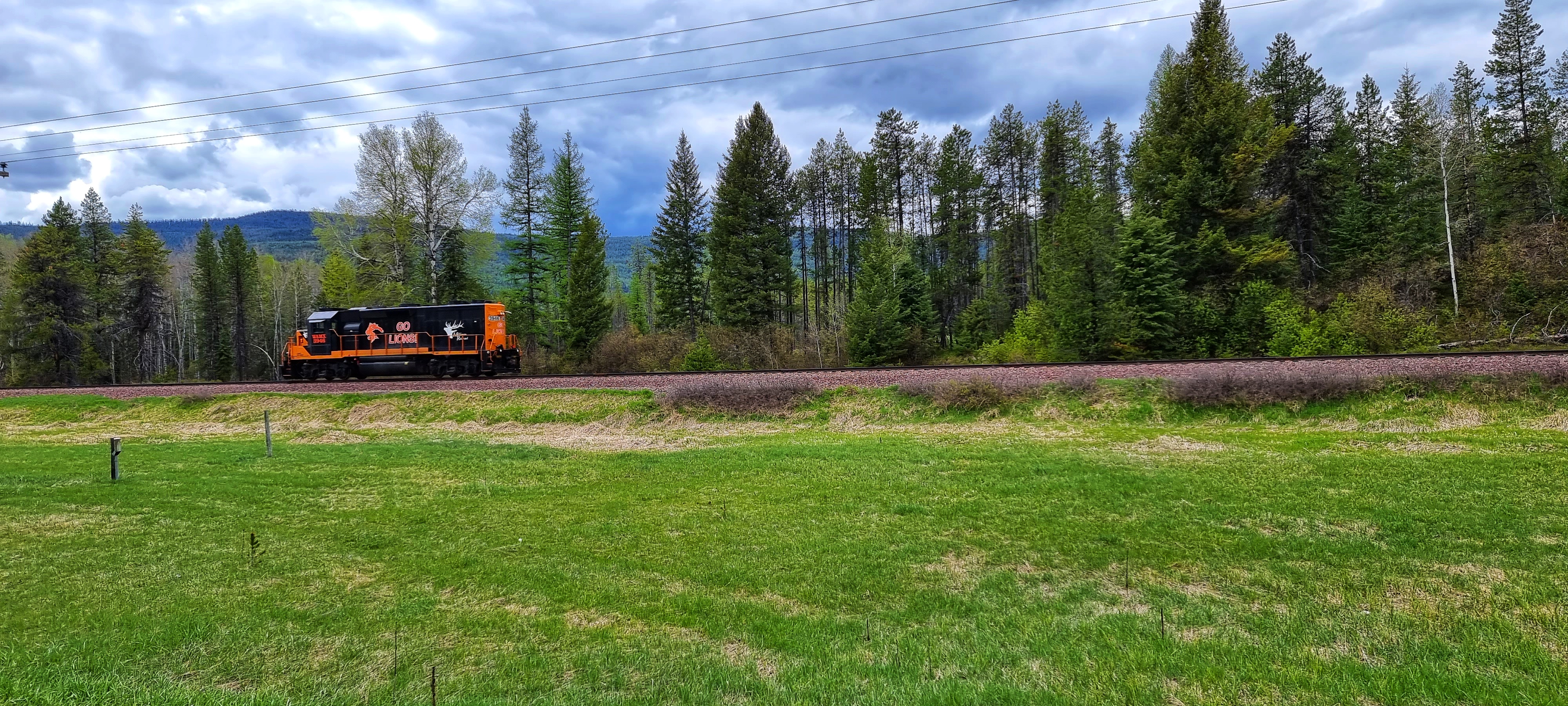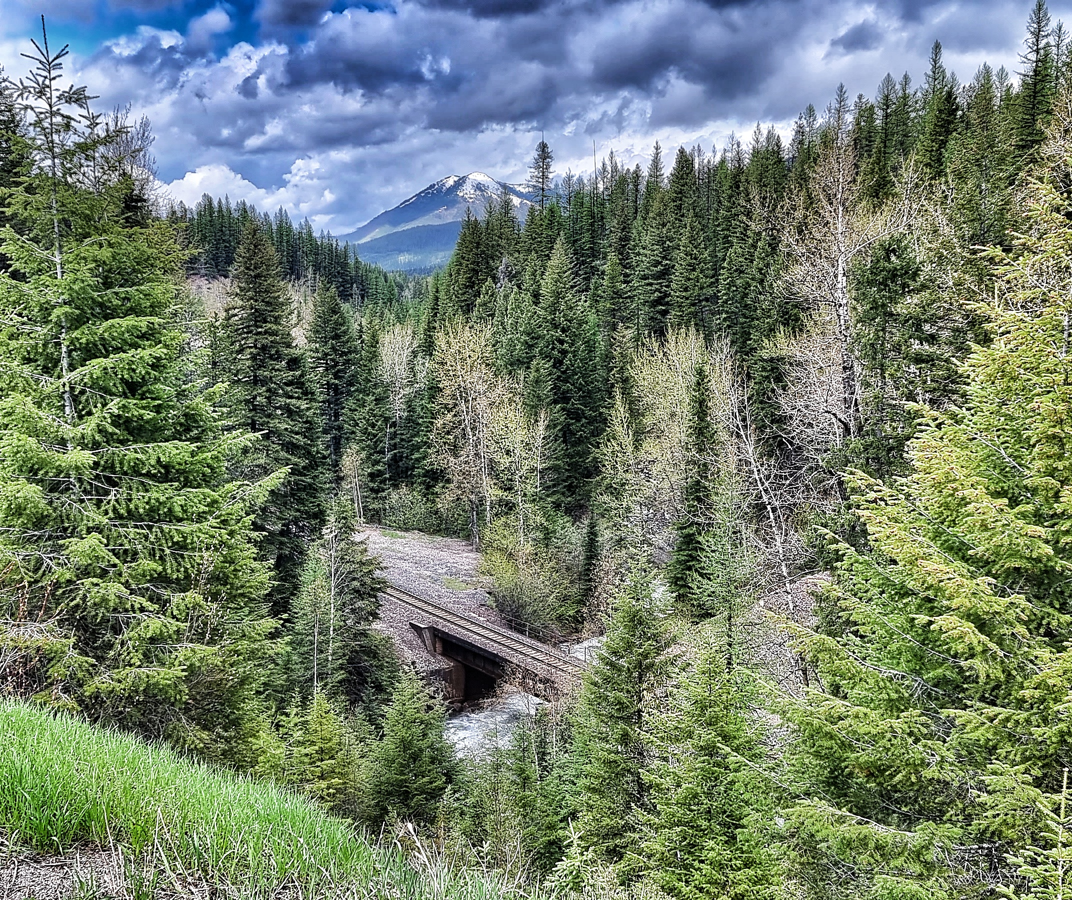 Heading East, we joined the US 2 & immediately started climbing, nothing severe, but enough to wake the legs up! We reached the summit of the climb just as a huge freight train was heading in the opposite direction – this one was double stacked with containers. The road continued to rise & fall gently, as we occasionally caught views of the Middle Fork Flathead river below.