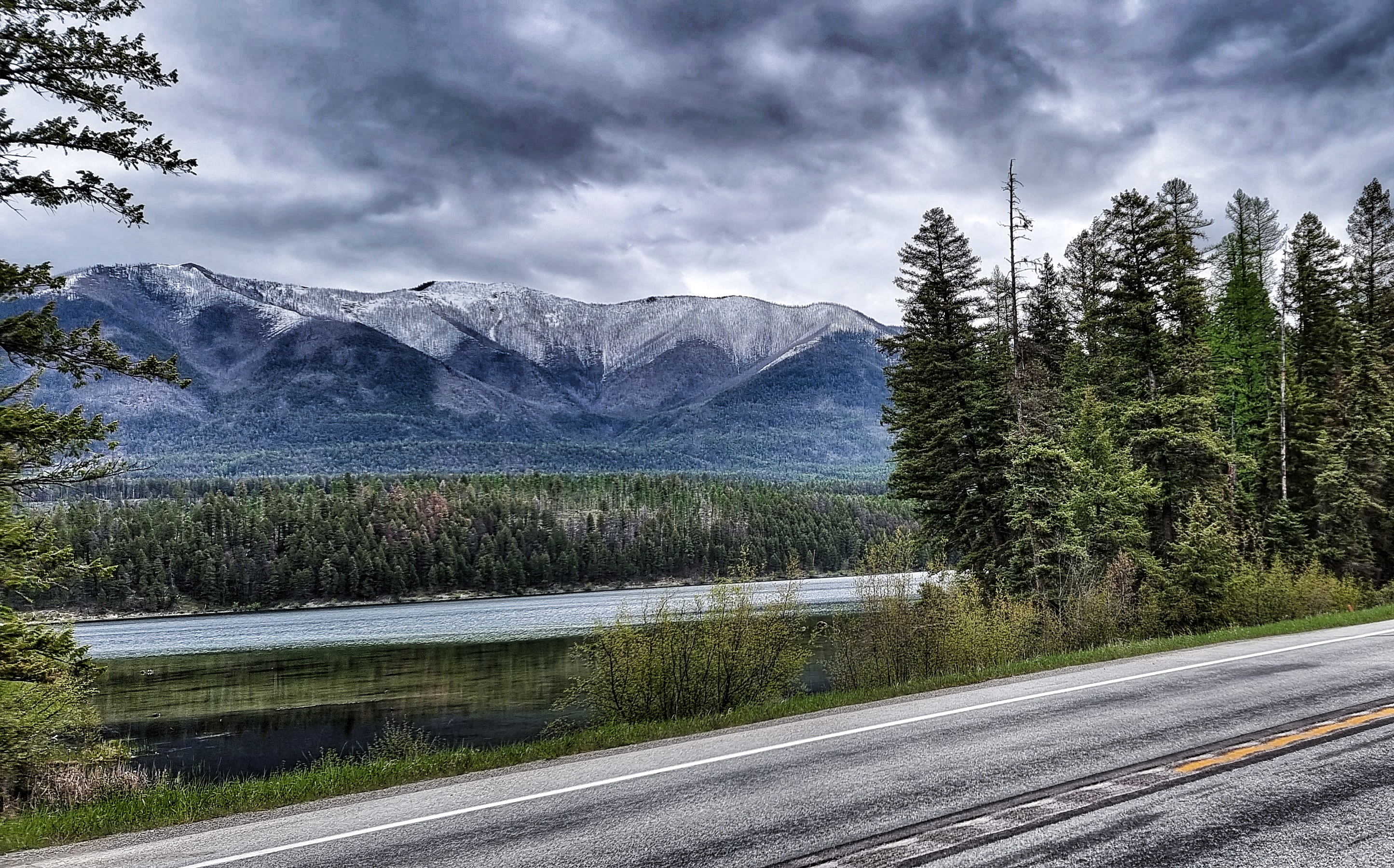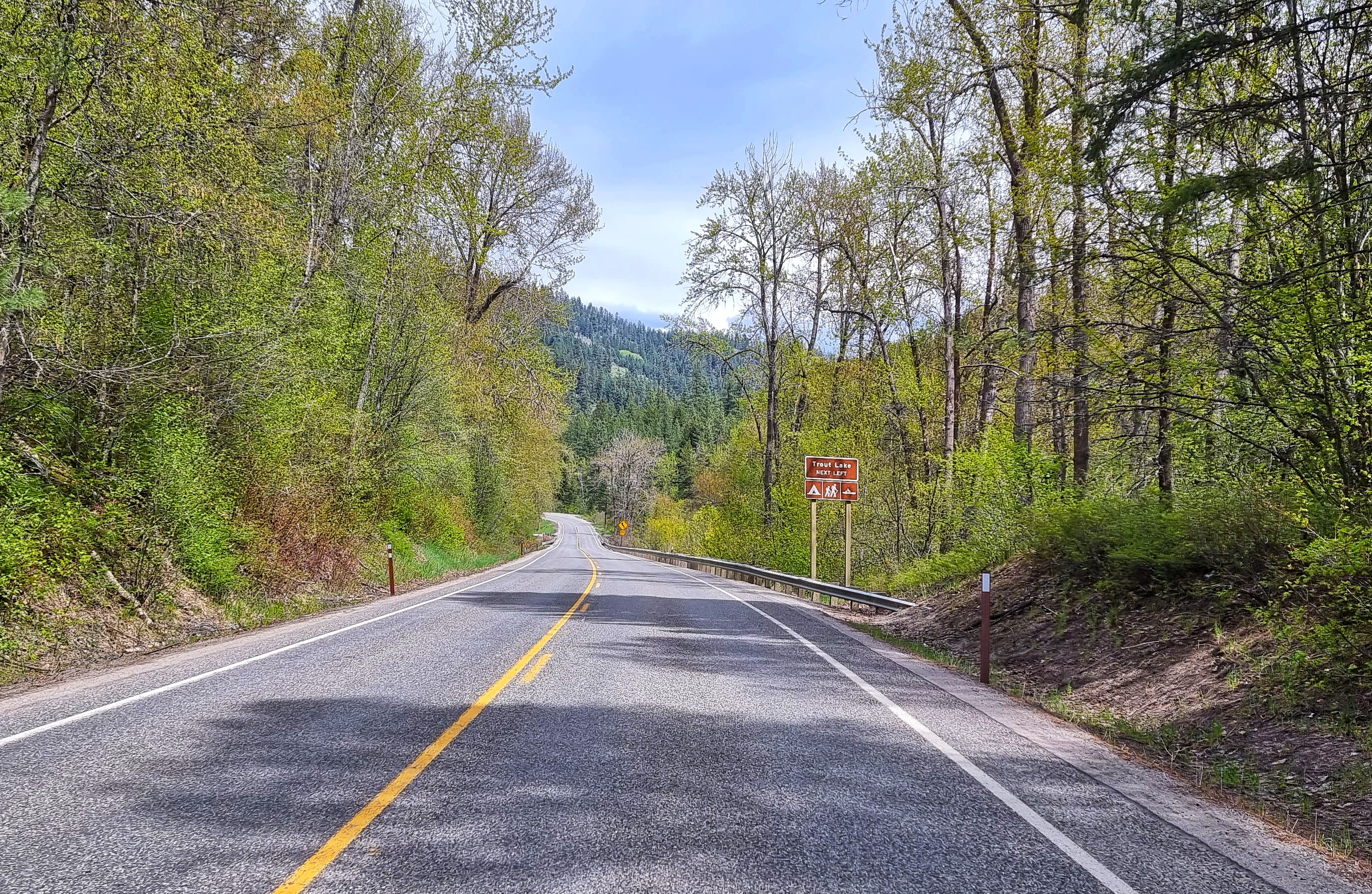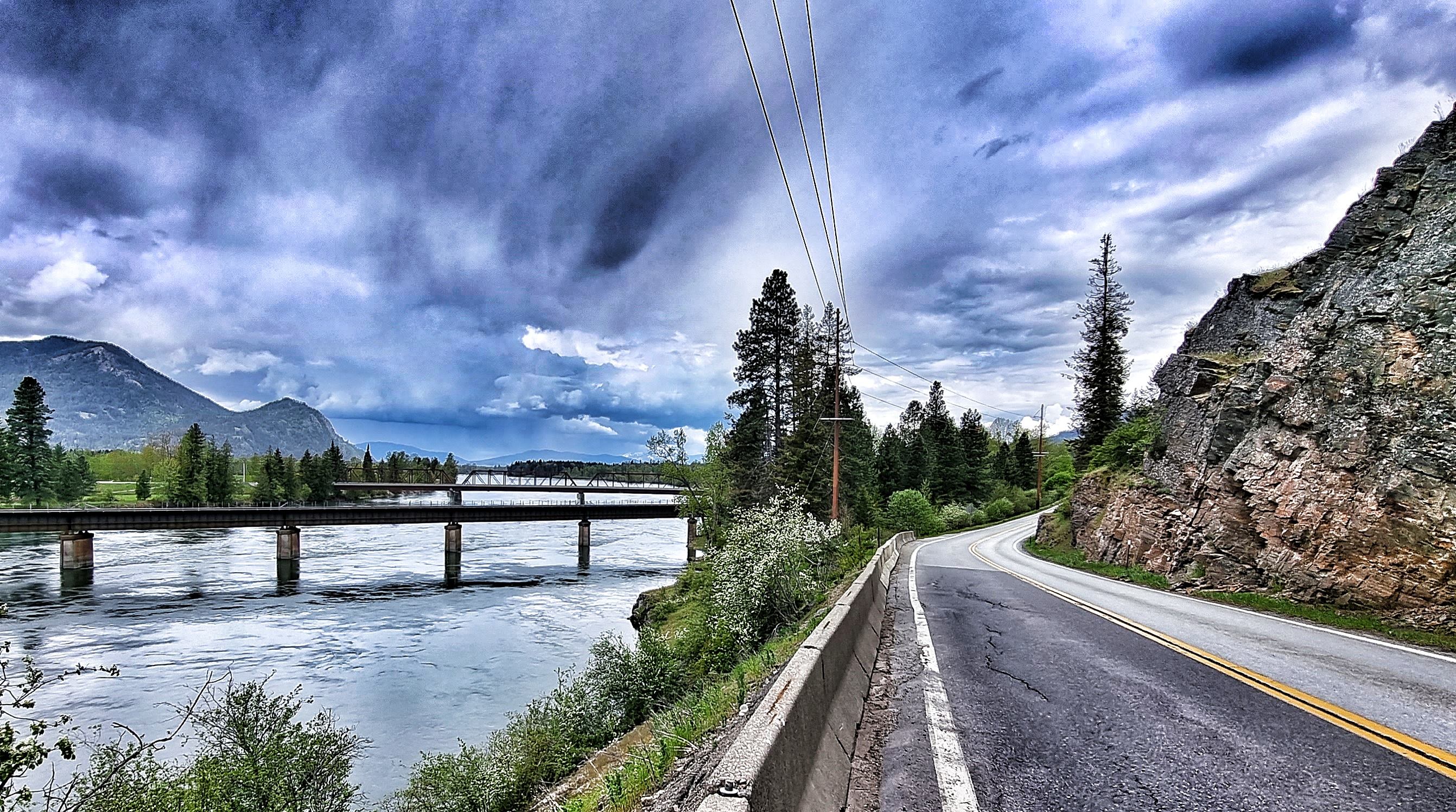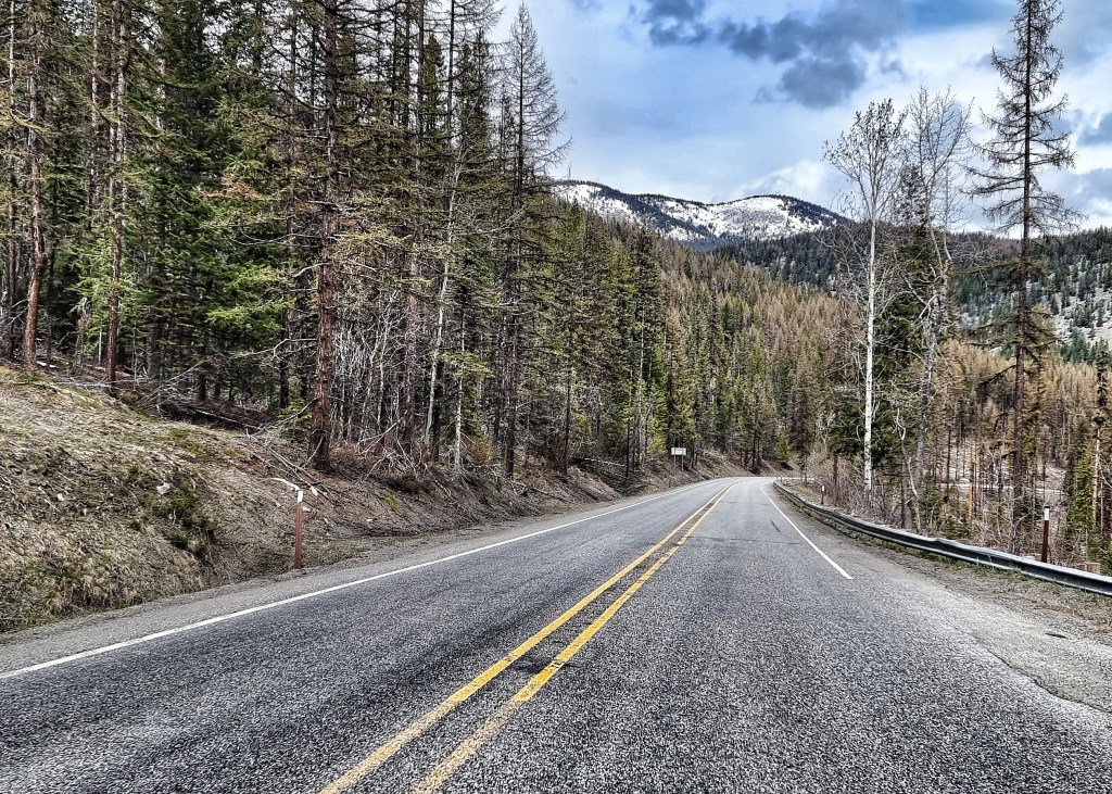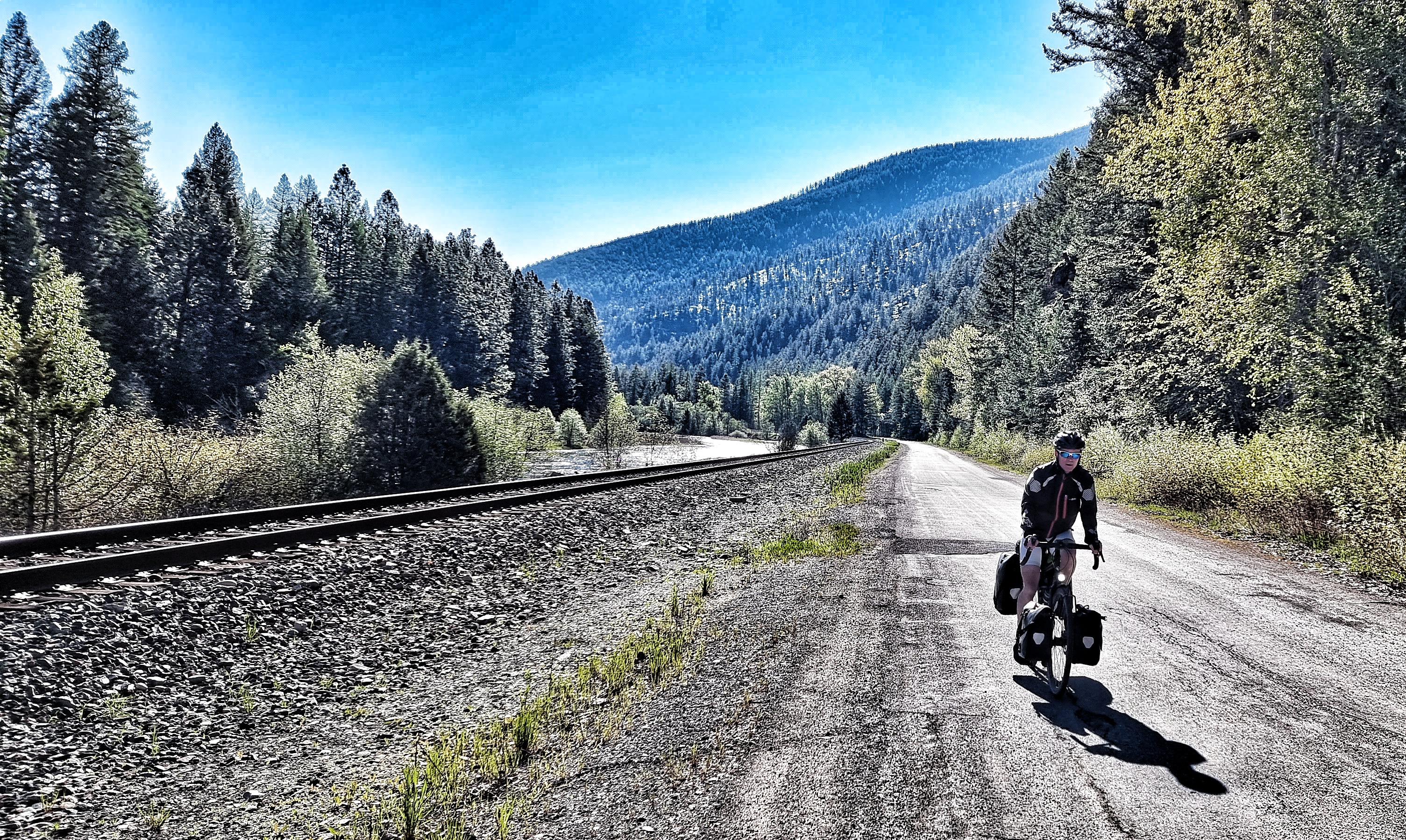 Heading East, we joined the US 2 & immediately started climbing, nothing severe, but enough to wake the legs up! We reached the summit of the climb just as a huge freight train was heading in the opposite direction – this one was double stacked with containers. The road continued to rise & fall gently, as we occasionally caught views of the Middle Fork Flathead river below.