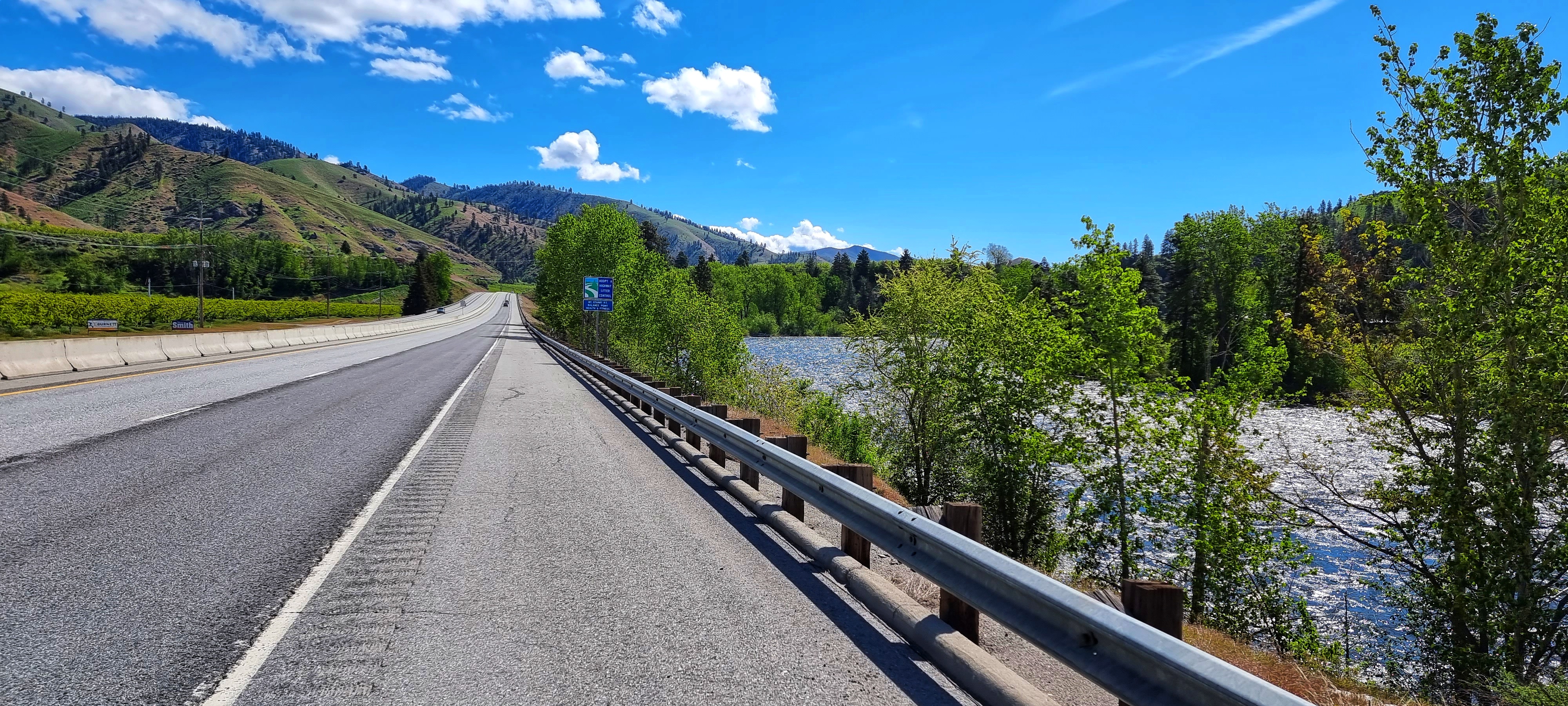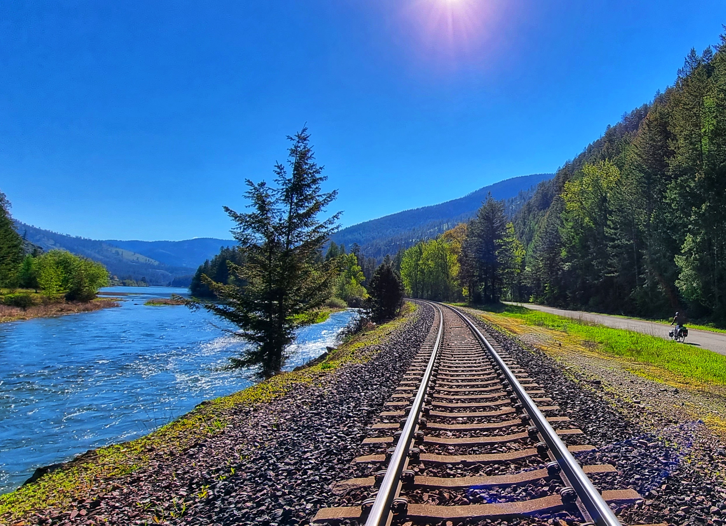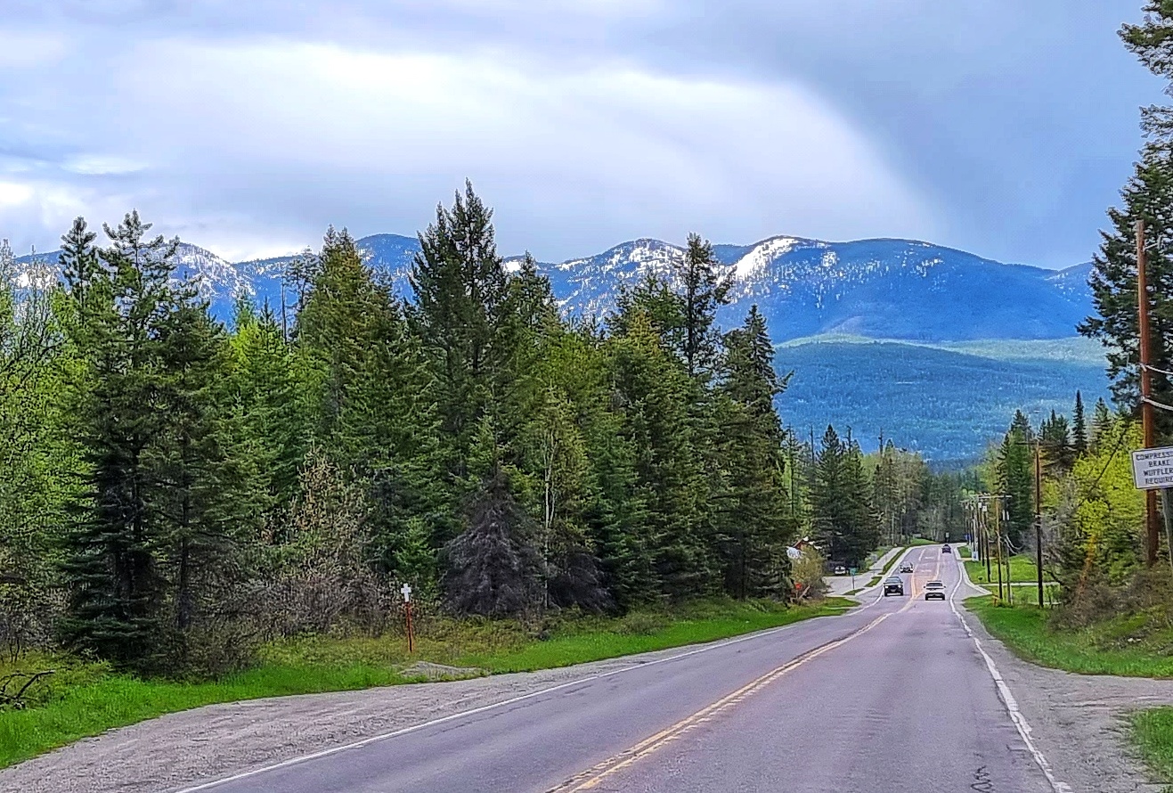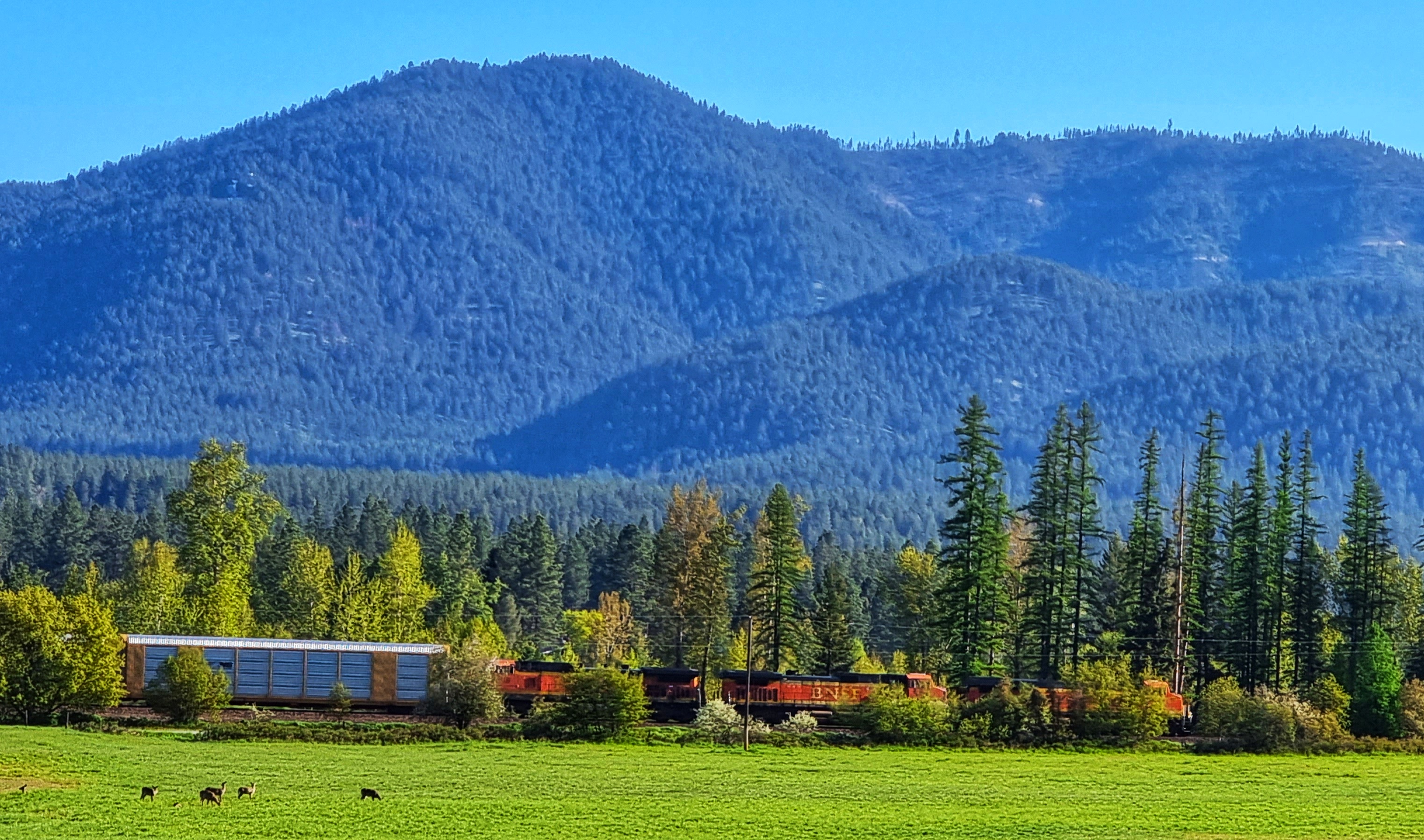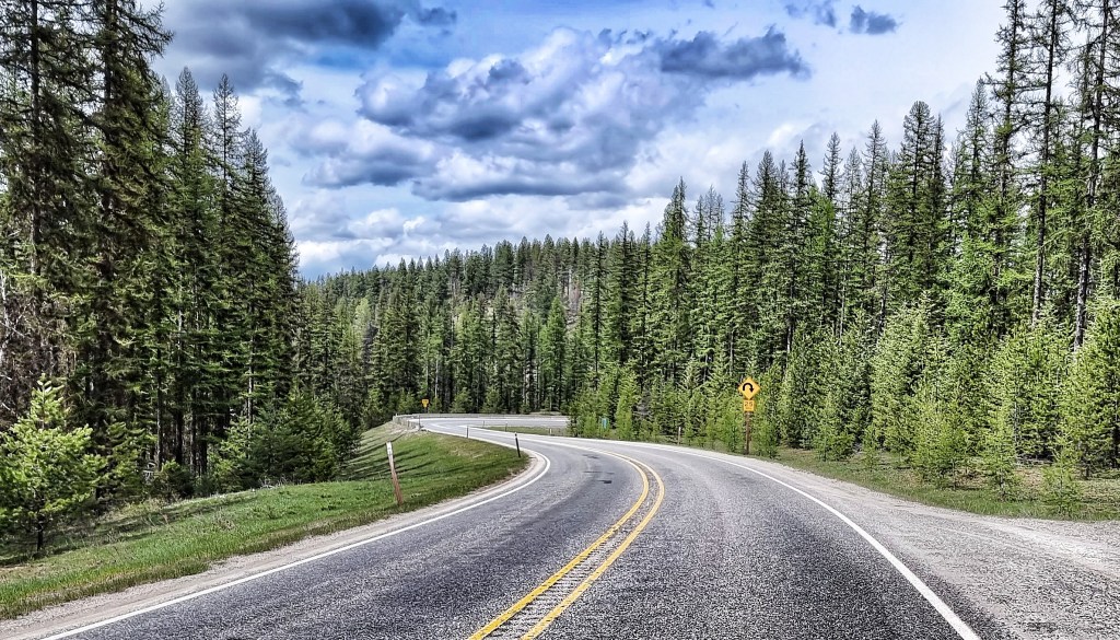 Heading East, we joined the US 2 & immediately started climbing, nothing severe, but enough to wake the legs up! We reached the summit of the climb just as a huge freight train was heading in the opposite direction – this one was double stacked with containers. The road continued to rise & fall gently, as we occasionally caught views of the Middle Fork Flathead river below.