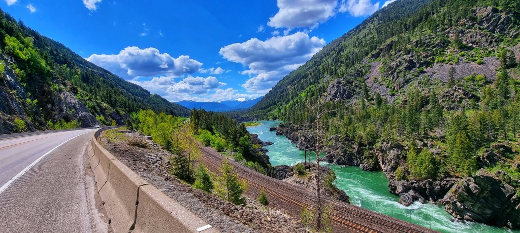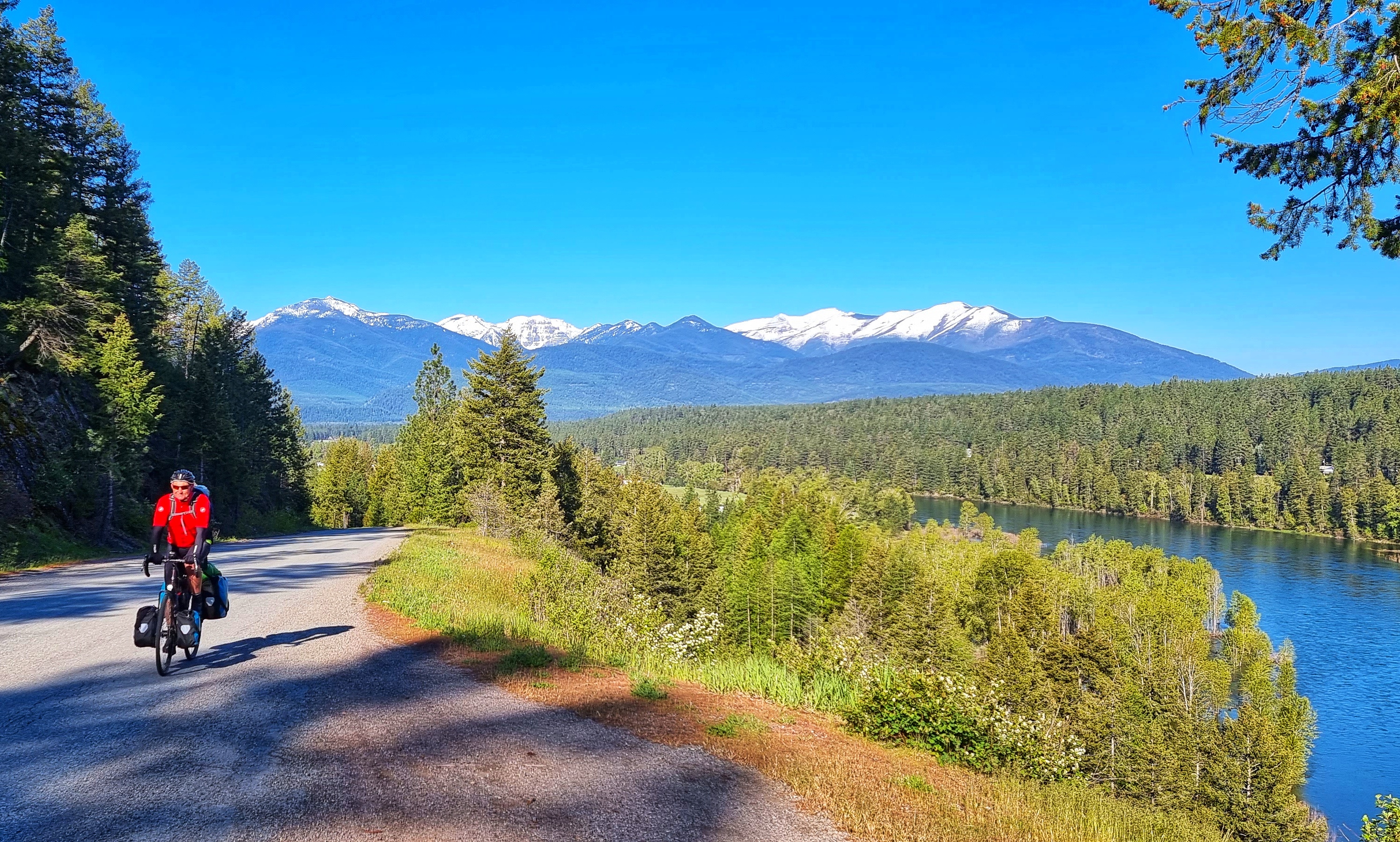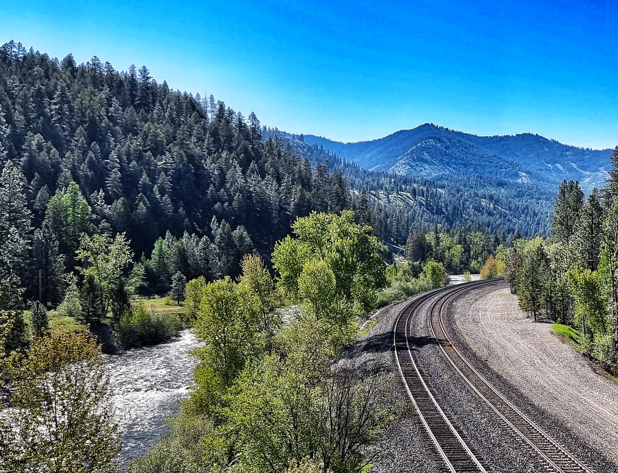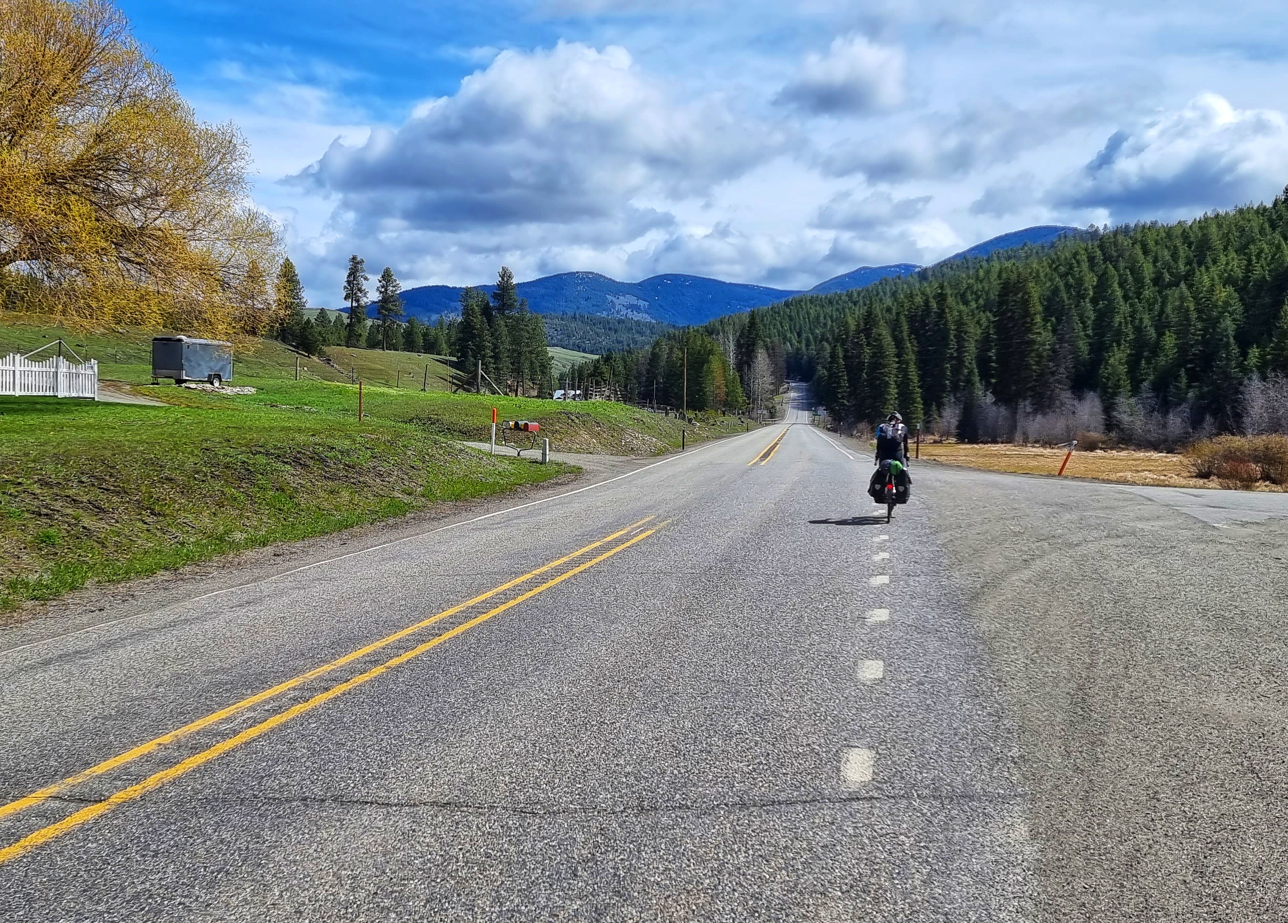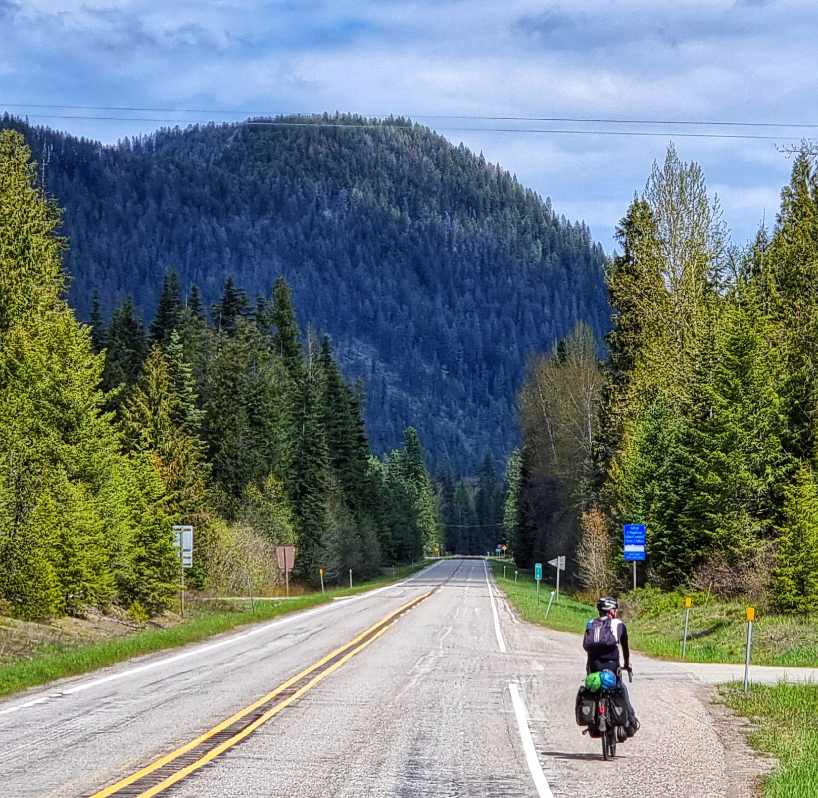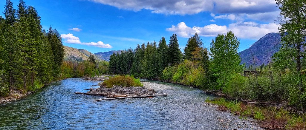 Heading East, we joined the US 2 & immediately started climbing, nothing severe, but enough to wake the legs up! We reached the summit of the climb just as a huge freight train was heading in the opposite direction – this one was double stacked with containers. The road continued to rise & fall gently, as we occasionally caught views of the Middle Fork Flathead river below.