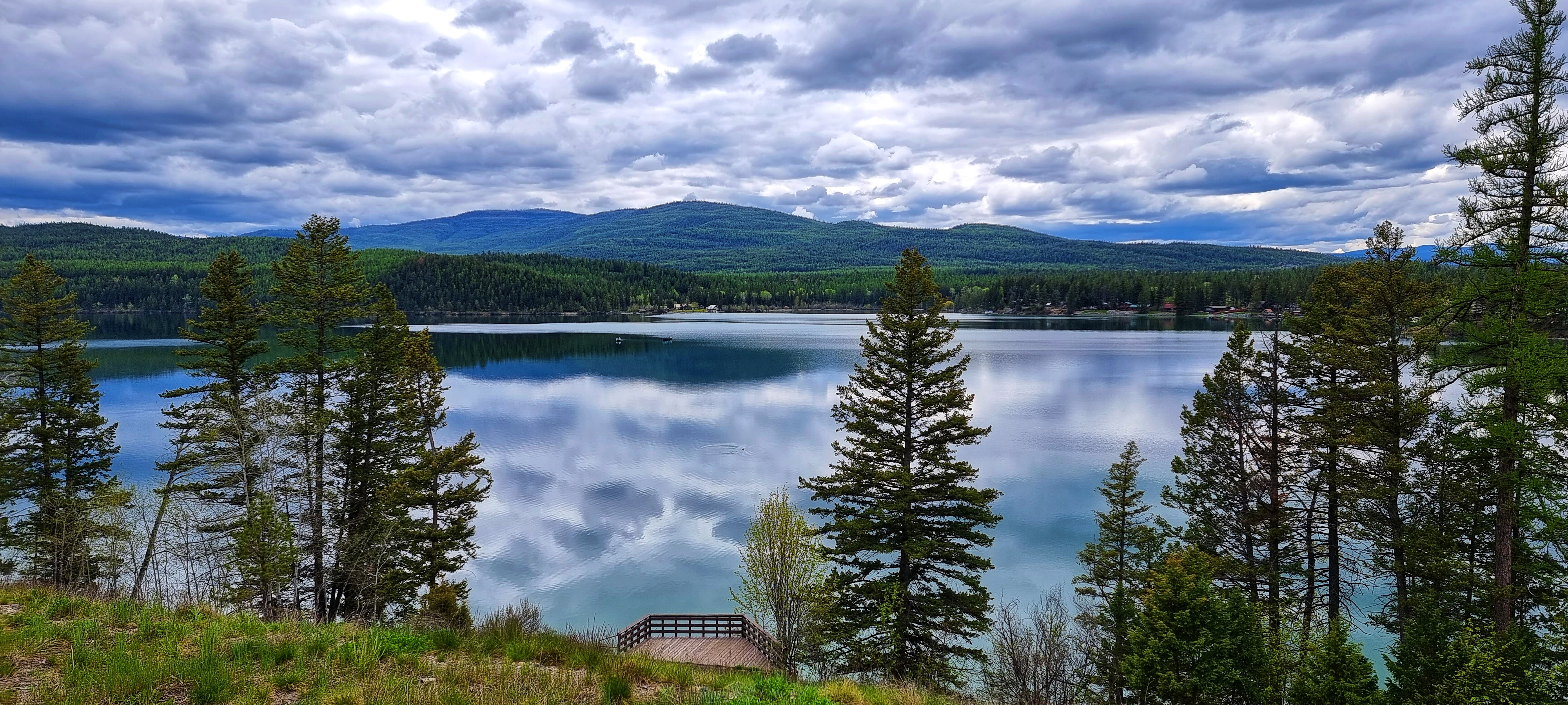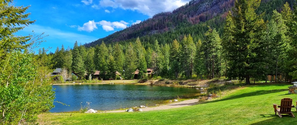 We passed one final lookout spot on the way to our motel at Motel McDonald Lake (not to be confused with Lake McDonald Lodge, which was right next door!). This gave a panoramic view down the 10 mile length of the lake. I learned that fish found in the lake are both native (such as the westslope cutthroat & bull trout, as well as the mountain whitefish) & non-native species added between 1912 & 1970 (lake trout, lake whitefish & kokanee).