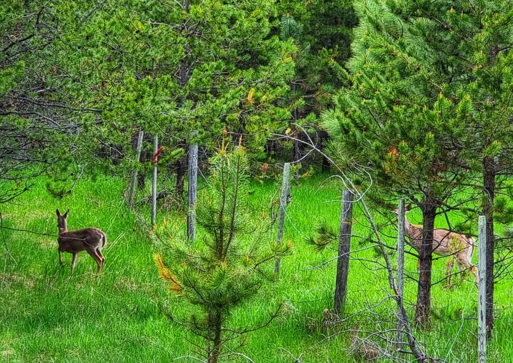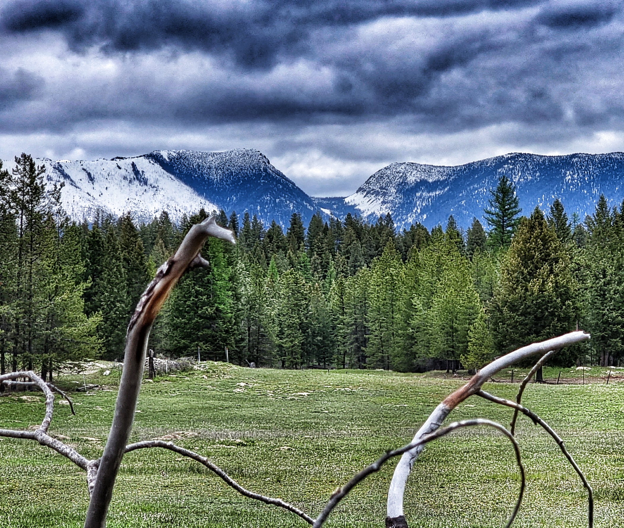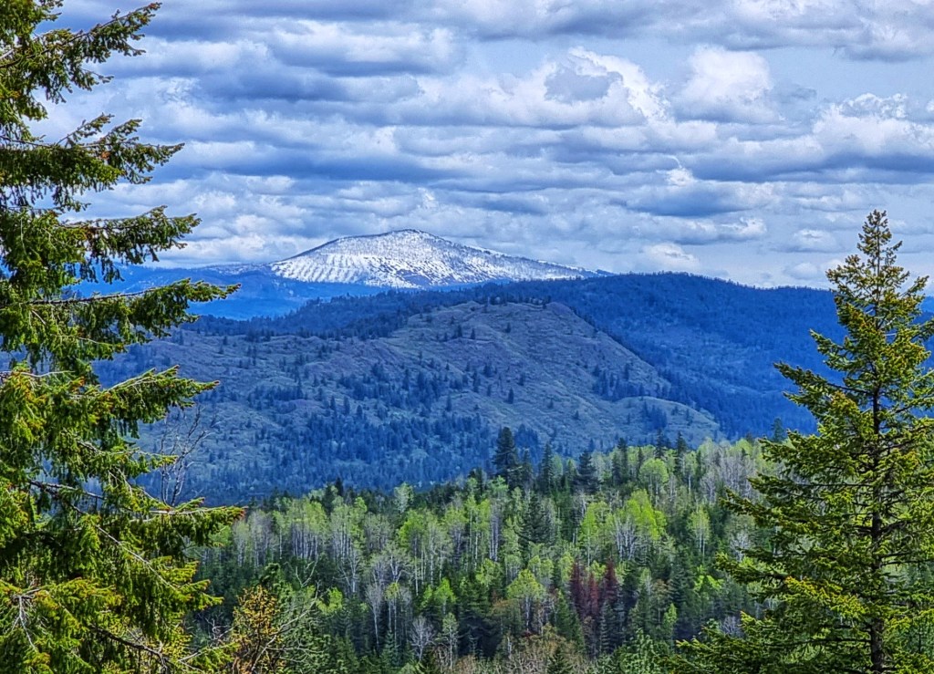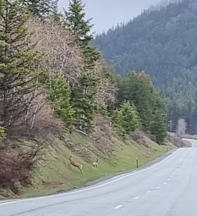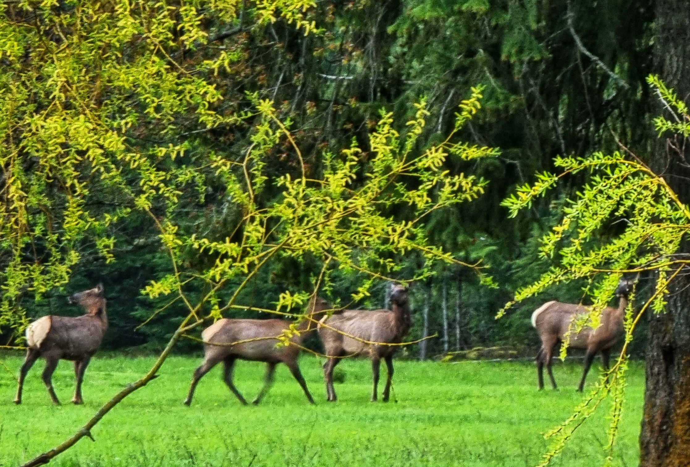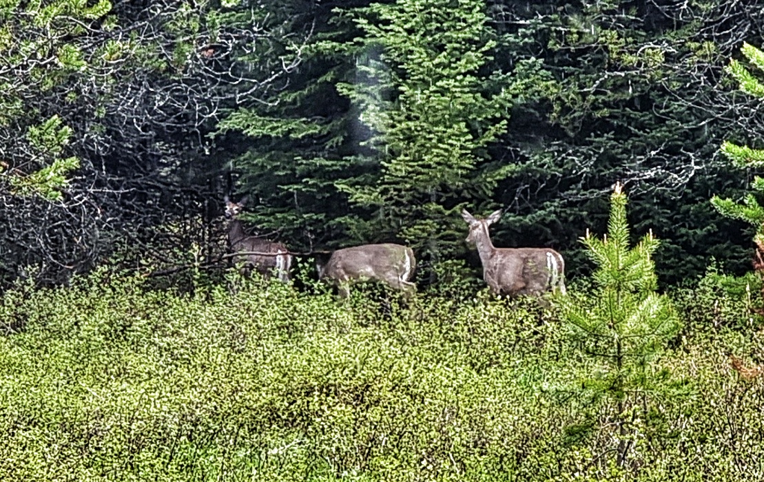 As we continued through the thick pines of the Flathead National Forest, we finally reached the end of the climbing for a while & descended to the valley floor, where we passed Walton Mountain, its summit wrapped in low-lying cloud. We were also visited by our old friends the inquisitive deer!!! It was about here that we got rained on for the first of several times today – never too heavy, or for too long, but enough to get us damp!