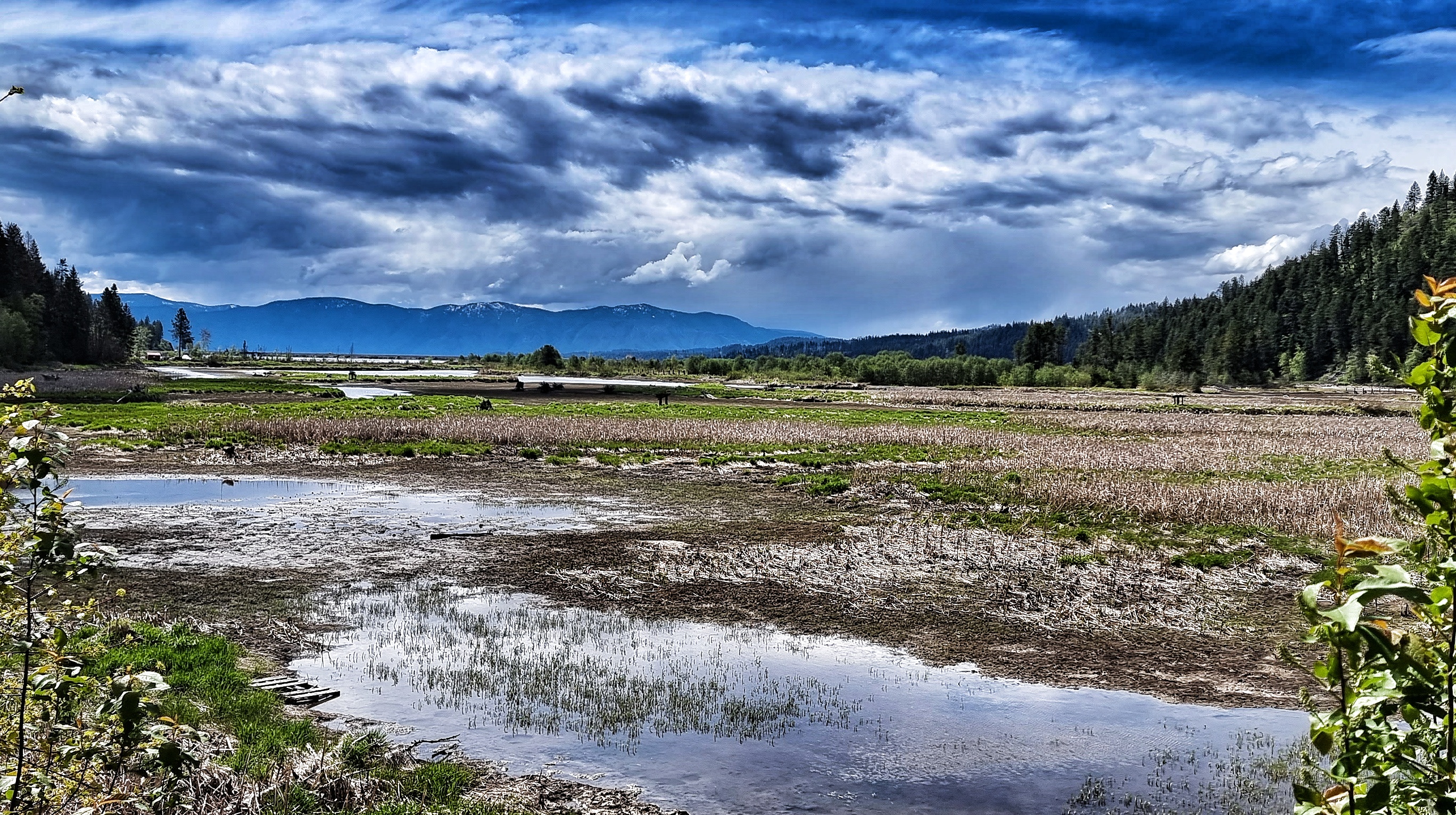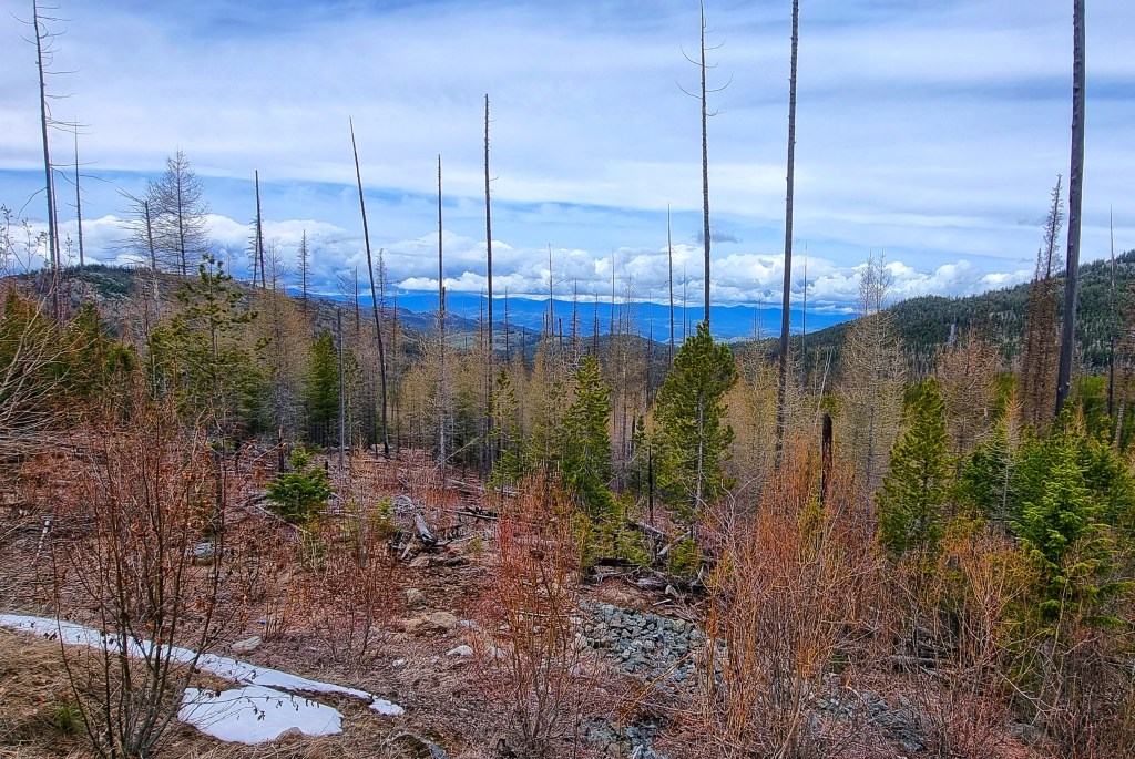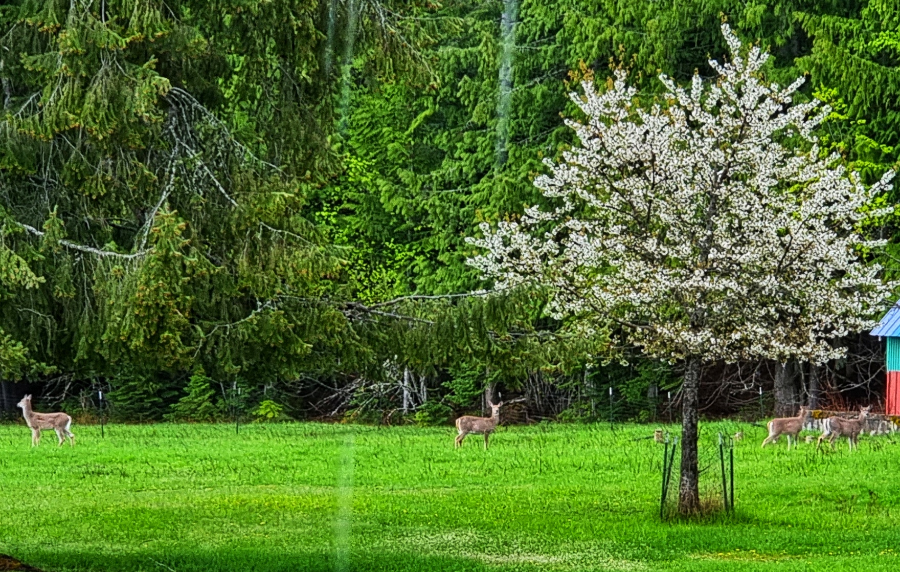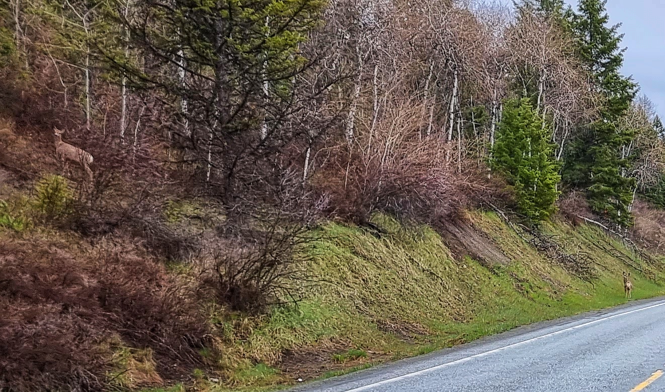As we continued through the thick pines of the Flathead National Forest, we finally reached the end of the climbing for a while & descended to the valley floor, where we passed Walton Mountain, its summit wrapped in low-lying cloud. We were also visited by our old friends the inquisitive deer!!! It was about here that we got rained on for the first of several times today – never too heavy, or for too long, but enough to get us damp!