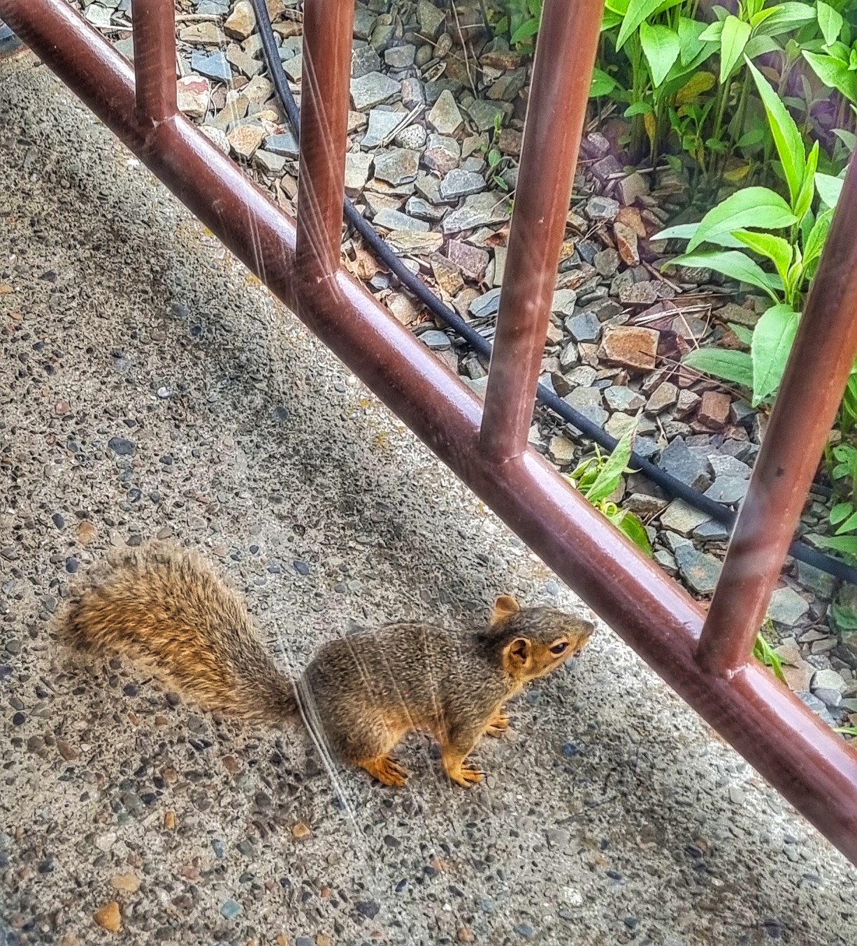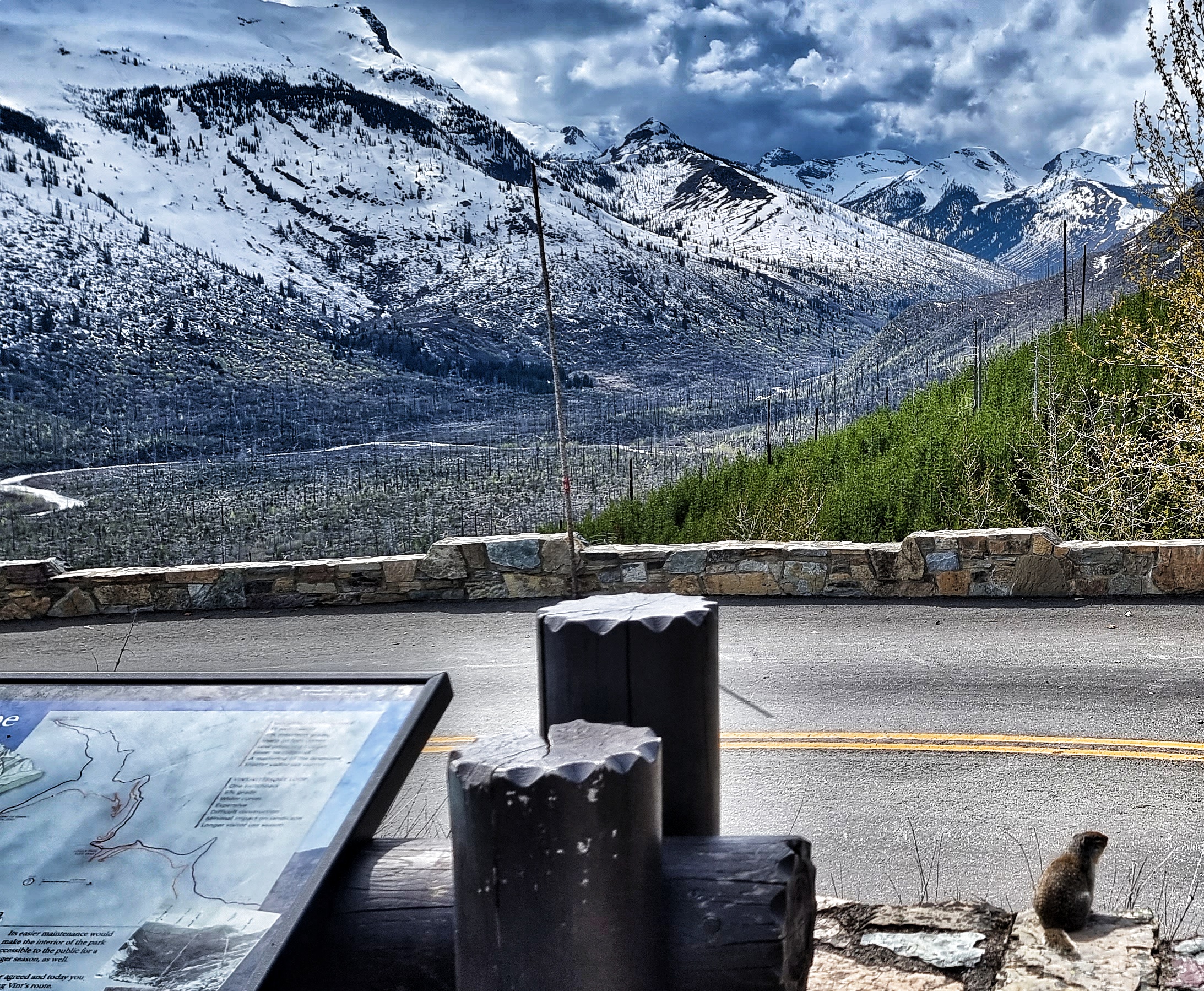 We turned around & pulled in at Lookout Point to drink in the huge vistas & marvel at Heavens Peak, towering above us at 8,987 feet above sea level. As we did, a cheeky chipmonk photobombed my picture!!