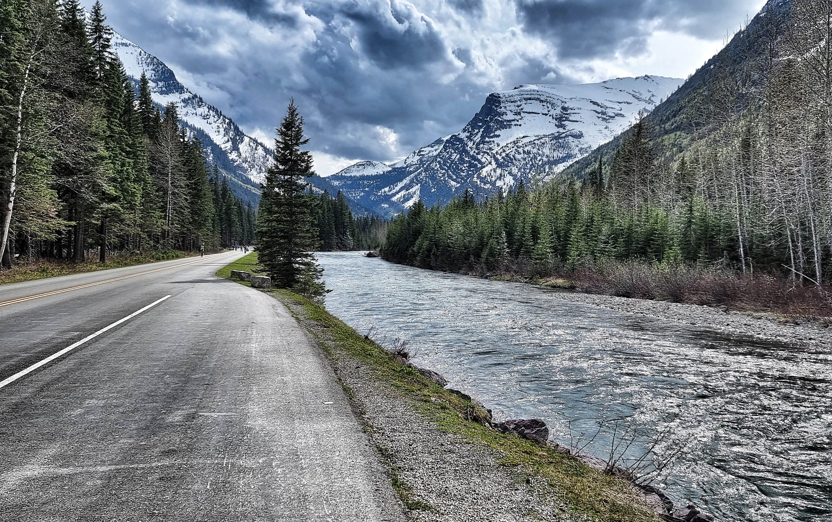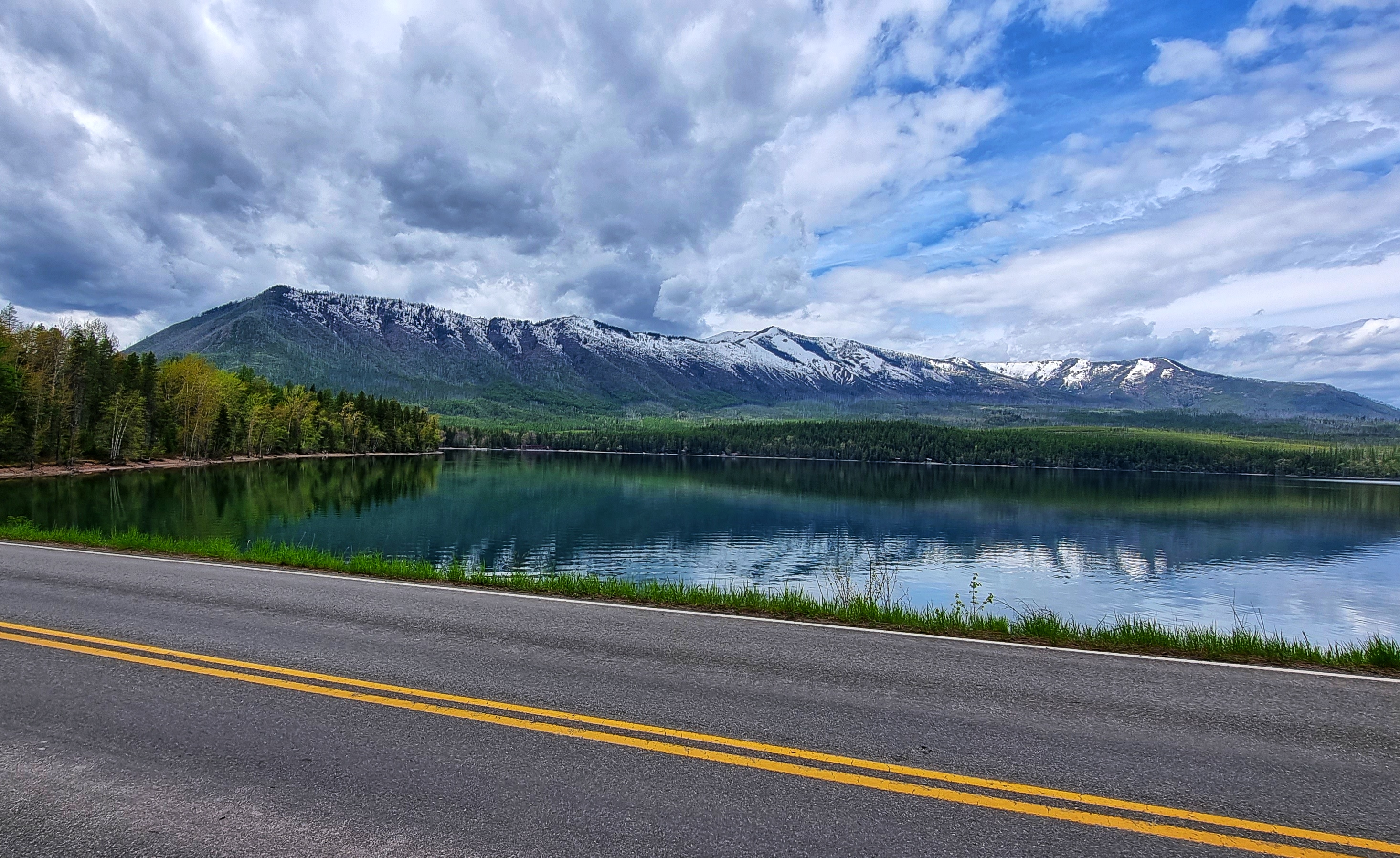 We took the right fork at Apgar which followed the GTTSR, taking us along the edge of Lake McDonald – we’d been told the scenery & vistas were something to behold, but I was still completely taken aback as we got our first views of the snow-capped mountains. The blue skies with fluffy cloud cover & mirror-like lake added to the spectacle.