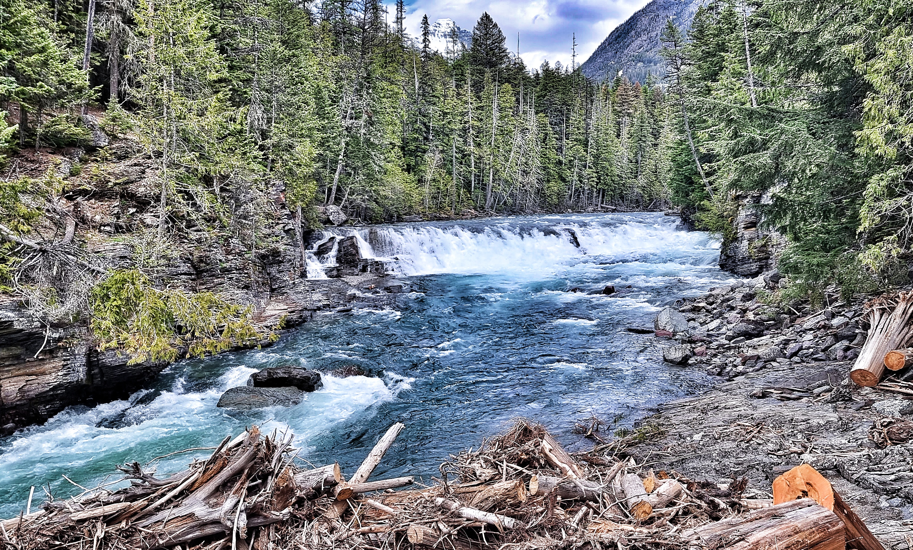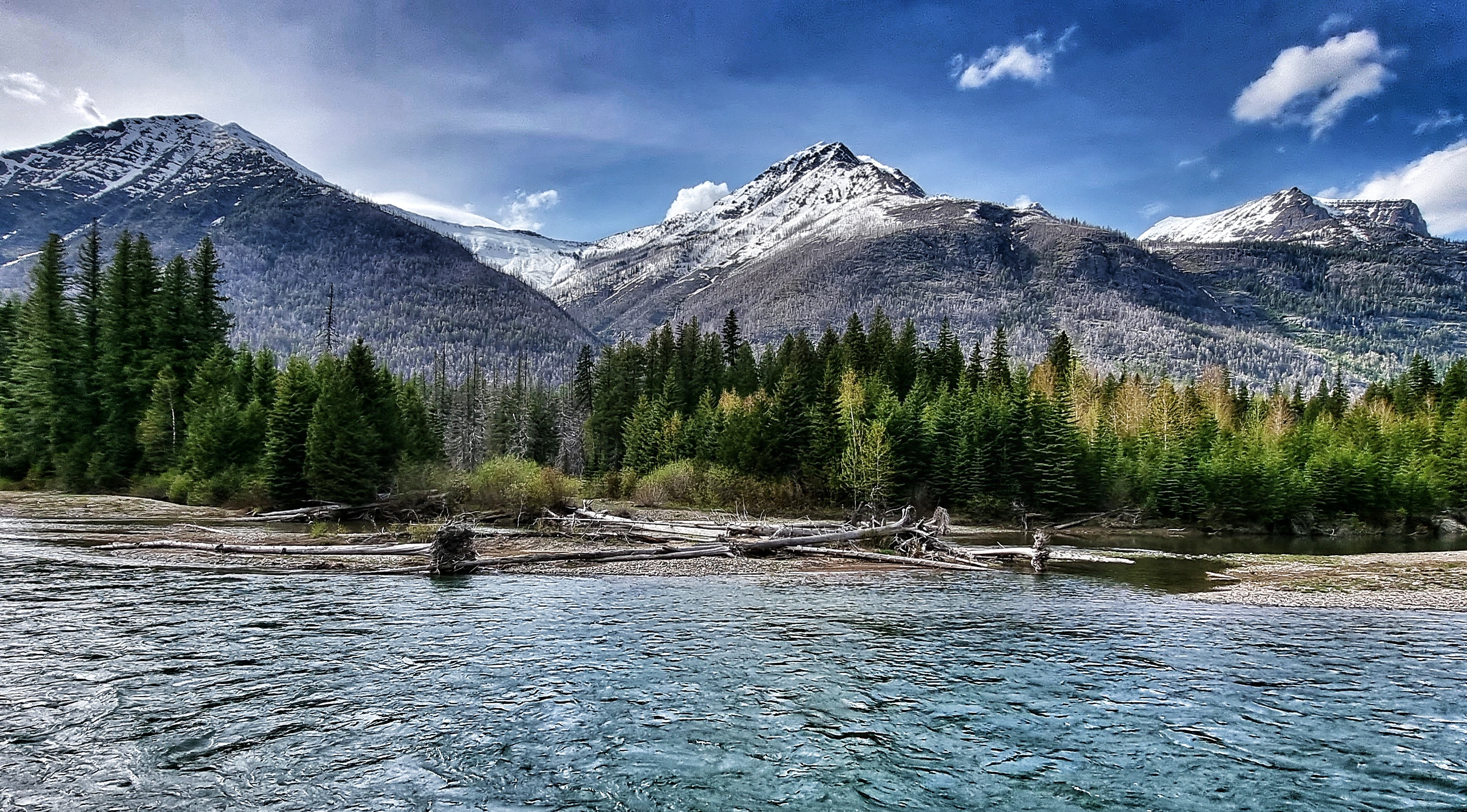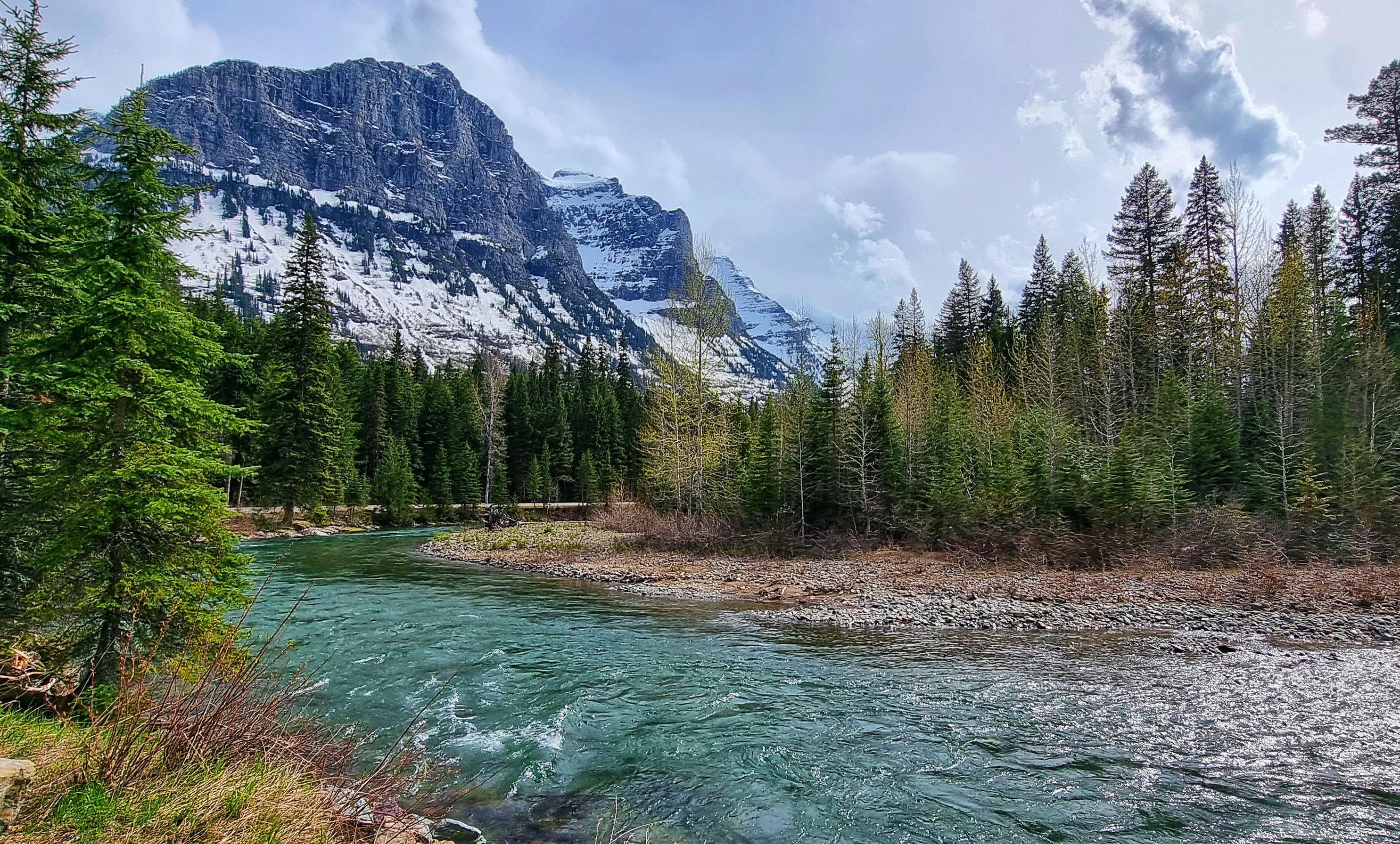 As we entered Glacier National Park (GNP) via the West Entrance, we stopped & took a quick snap as a permanent reminder of our visit. Crossing the Middle Fork Flathead River, we spotted one of the many rafting boats that are advertised – it had just dropped off its passengers & the guide was on his way back to base camp further down the river. Before our adventure in GNP had begun in earnest, we saw at close quarters our first near death moment, as an adult deer bolted across the road in front of two SUV’s that were travelling in opposite directions. A frightening moment for all concerned.