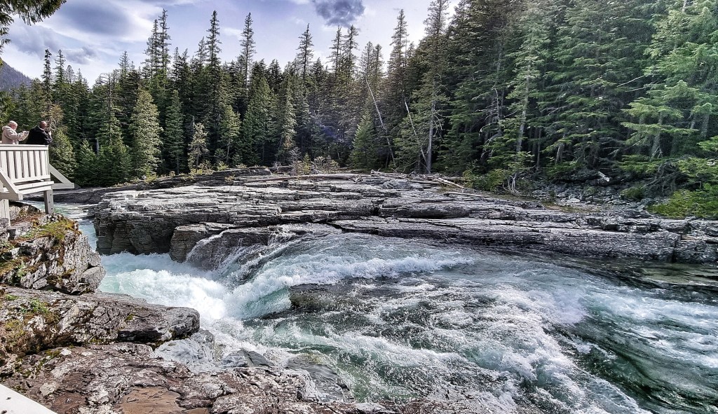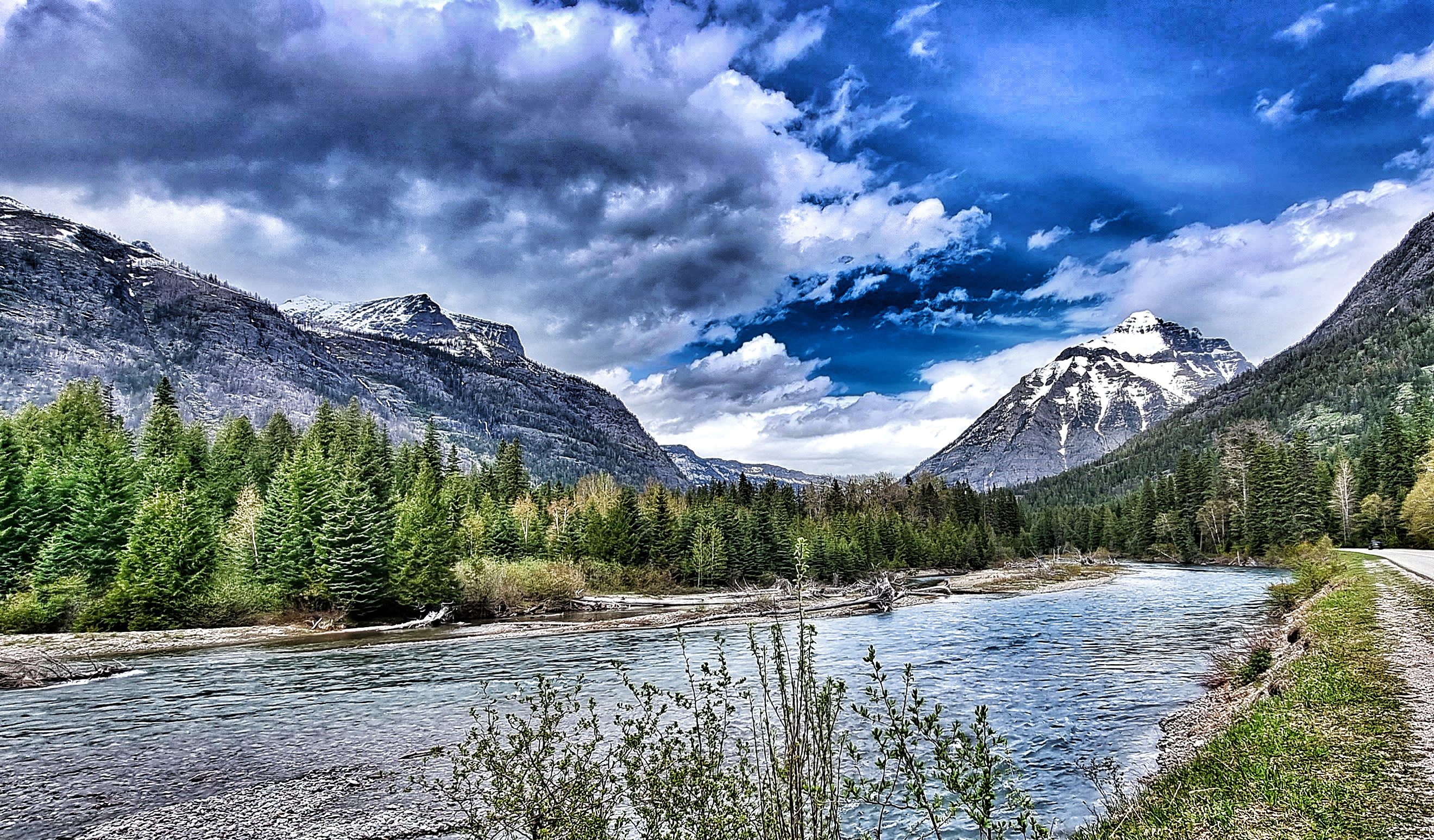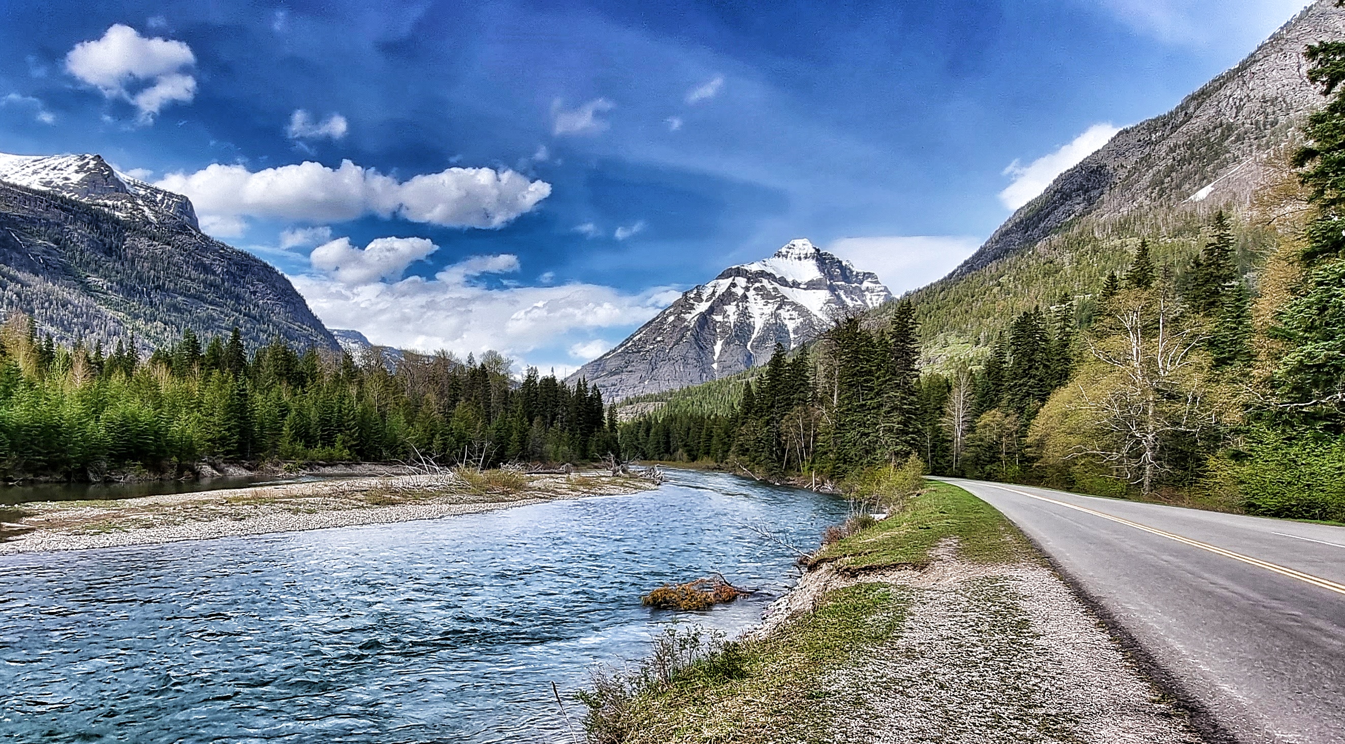 As we entered Glacier National Park (GNP) via the West Entrance, we stopped & took a quick snap as a permanent reminder of our visit. Crossing the Middle Fork Flathead River, we spotted one of the many rafting boats that are advertised – it had just dropped off its passengers & the guide was on his way back to base camp further down the river. Before our adventure in GNP had begun in earnest, we saw at close quarters our first near death moment, as an adult deer bolted across the road in front of two SUV’s that were travelling in opposite directions. A frightening moment for all concerned.