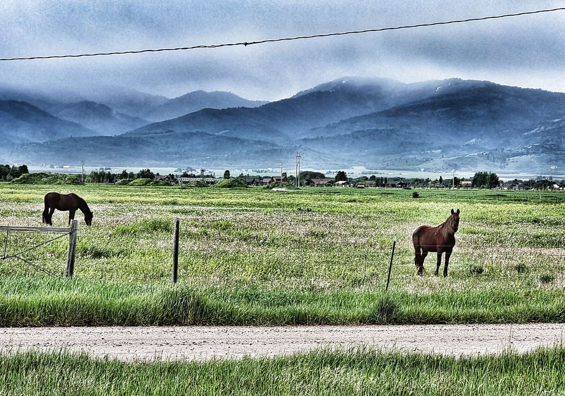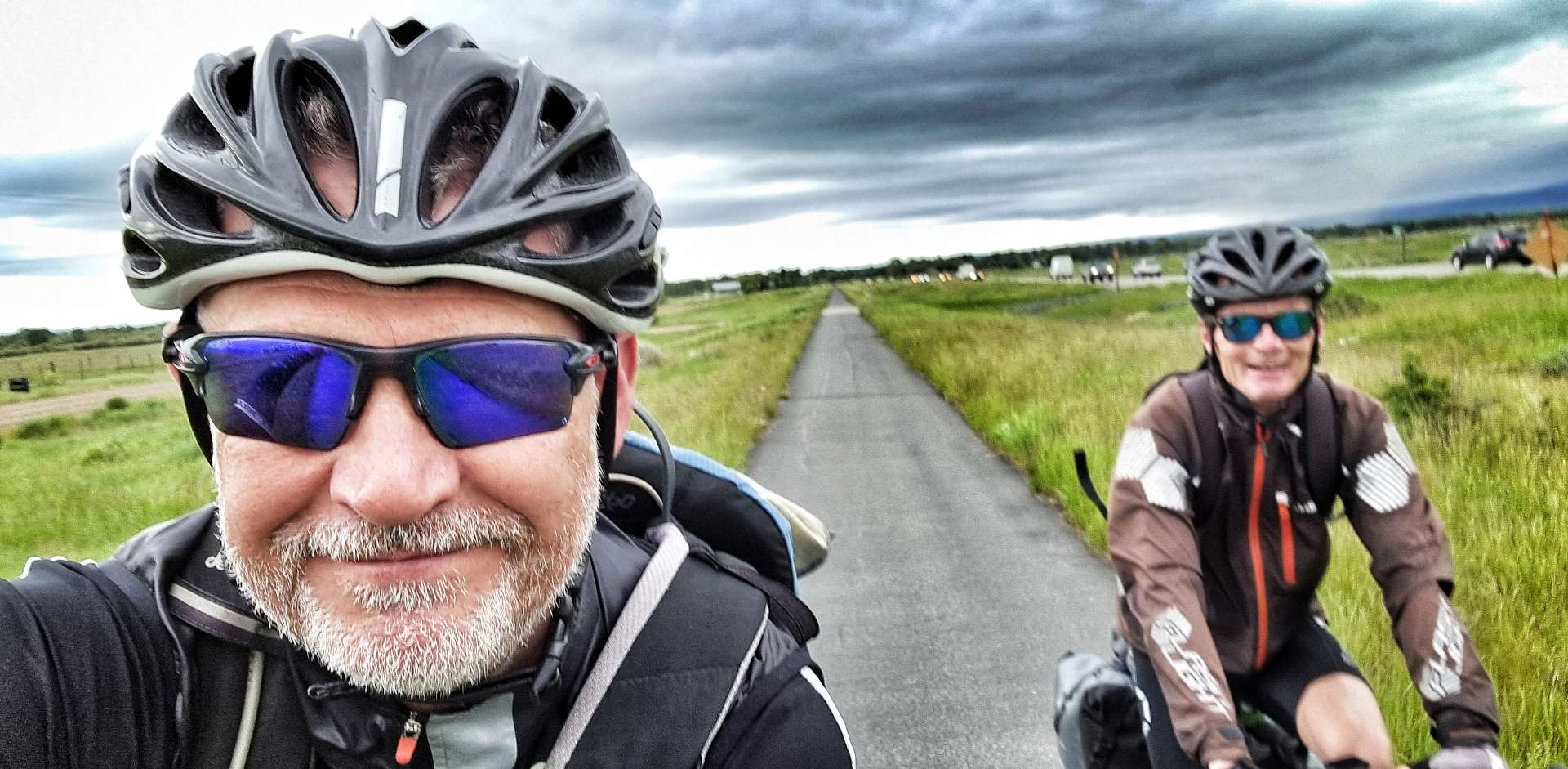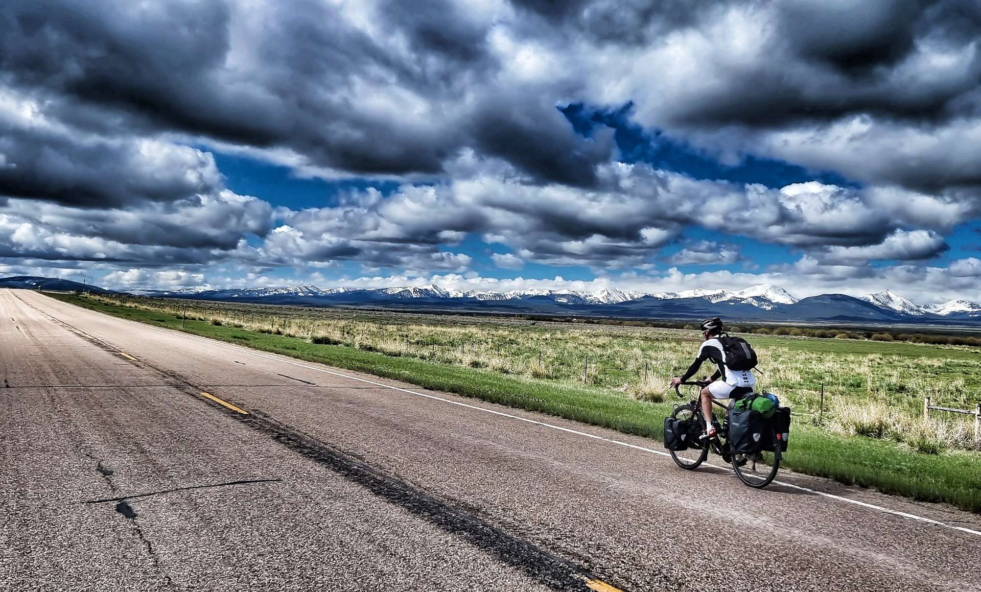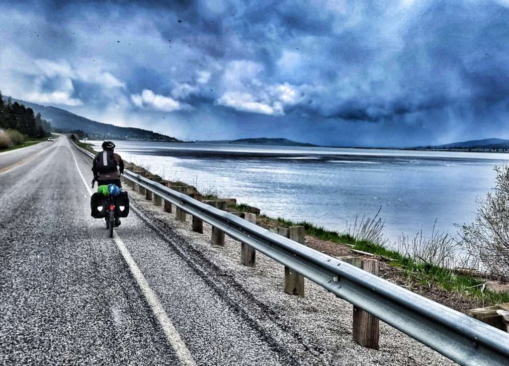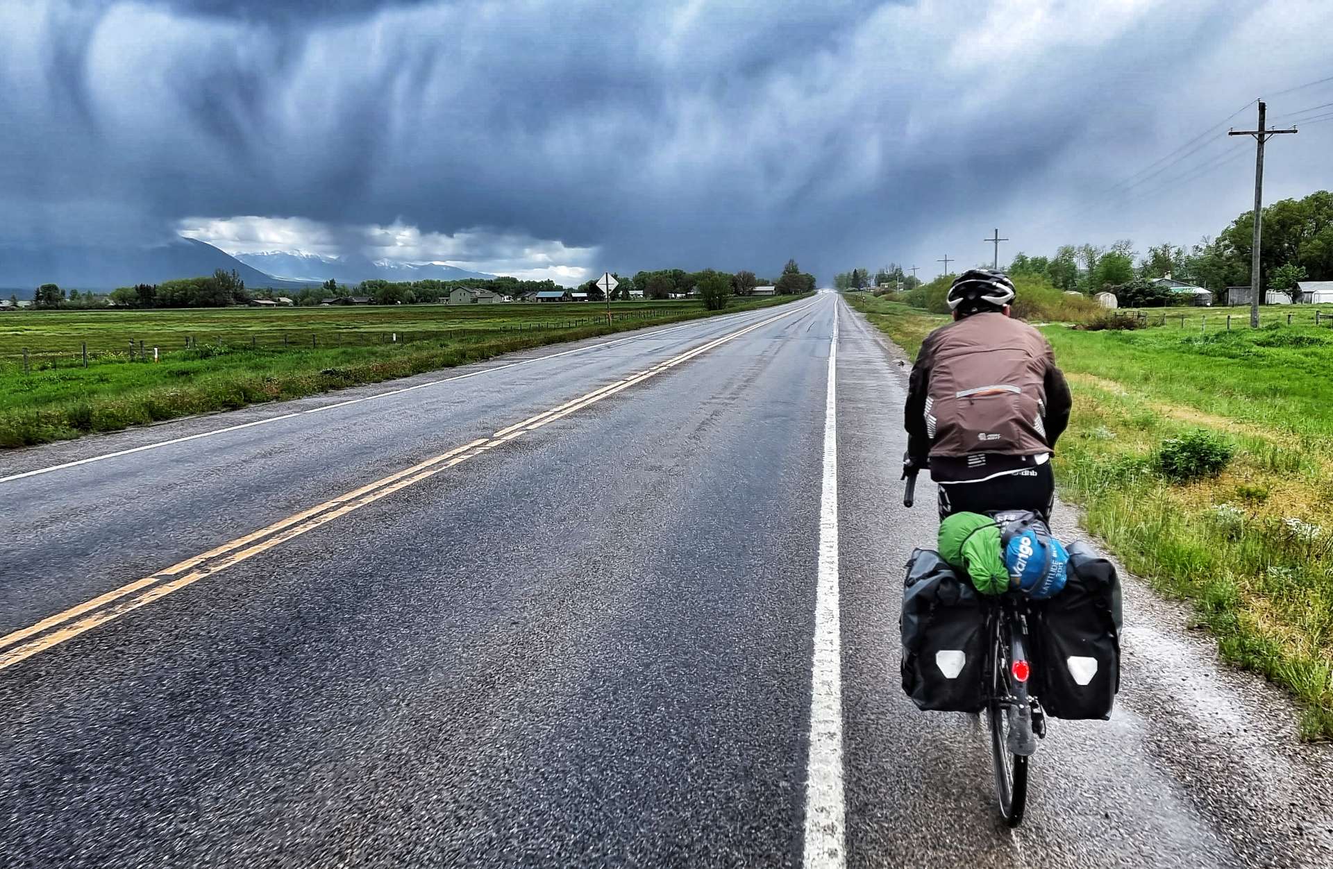 Leaving Driggs, we picked up a cycle track almost immediately that we’d be able to use for the first 9 miles until we reached Victor. We could see rain showers falling to either side of us, but somehow we remained dry – even one of the horses looked on in surprise! You may be able to see in the 2nd photo that Sean had taken most of his kit out of his rear left pannier, we were hoping that the reduced weight would increase the chance of the pannier surviving until Jackson.