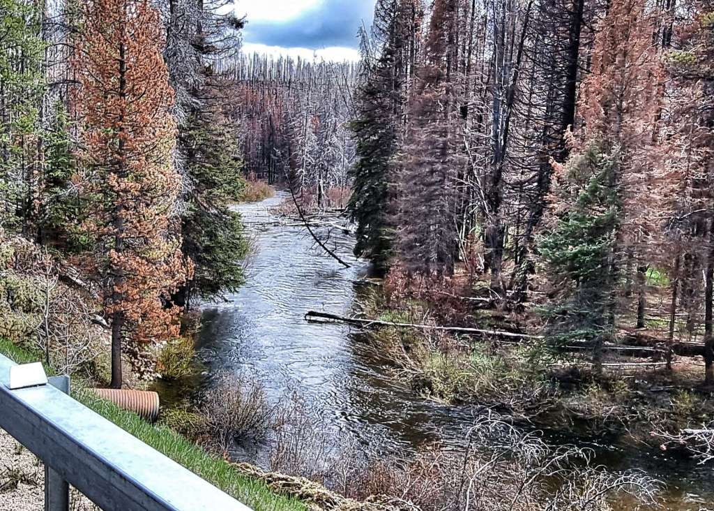 It was bitterly cold overnight (below freezing) – I bought a beanie on 19th May in Sandpoint for just such an occasion & slept in it last night, along with long legged thermal bibs & a long sleeved jersey. We were on the road by about 10am & continued on a constantly rising road for 6 miles through a section of burned forest, before exiting Grand Teton National Park on the John D Rockefeller Jr Memorial Parkway as we headed towards Yellowstone.
