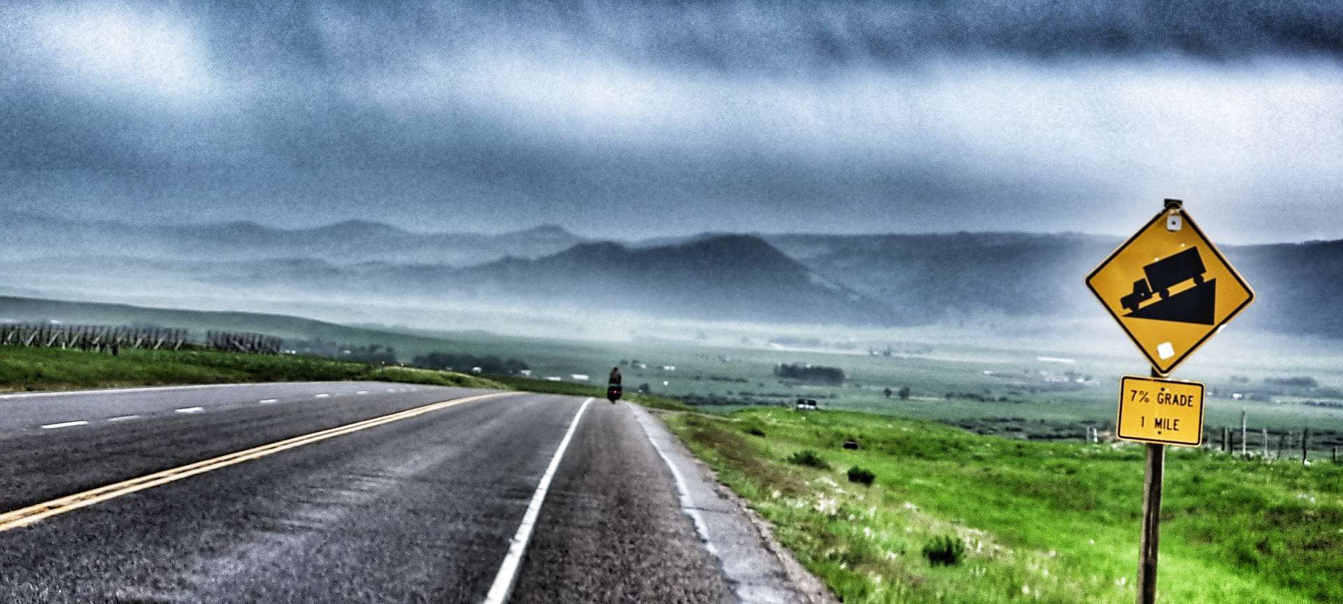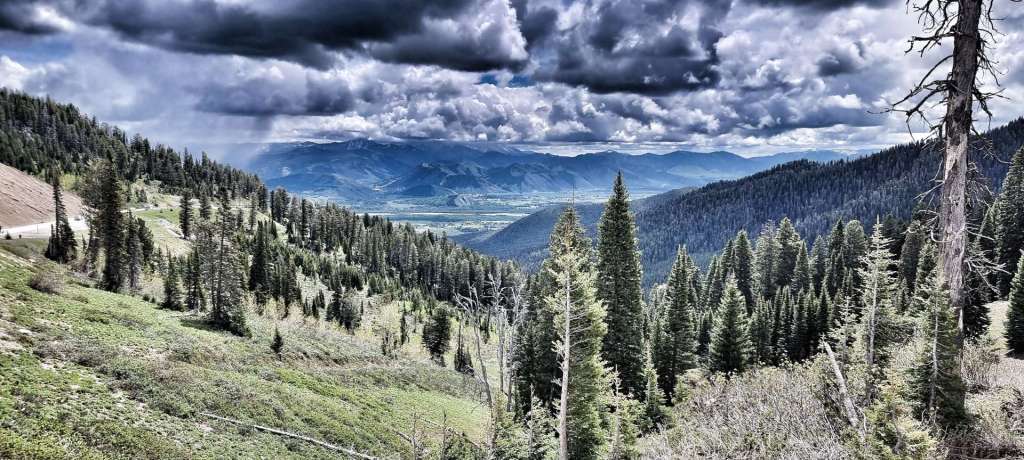 Because the summit of Teton Pass was over 8,000 feet above sea level, I’d researched the climb. This isn’t always a happy place to be, as I knew that from the next corner to the top (about 4 miles in total), the gradient wouldn’t dip below 9% & would max out at 13% – in the first photo you may be able to make out a thin line just to the left & above the treeline, this is the road. The second photo is taken from that spot looking back down the valley into Idaho.