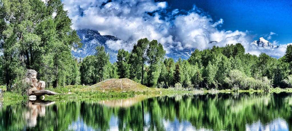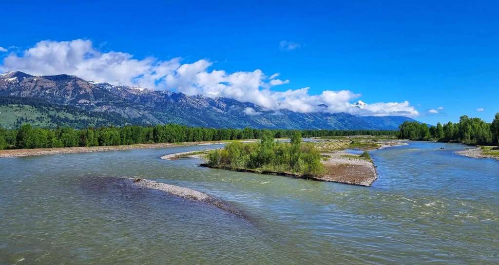Further up the valley is Jackson Lake – it’s a 400 foot deep natural lake, that was modified in 1916 by the Bureau of Reclamation when they added a 39 foot dam to the lake & rebuilt it in 1989. The lake is a remnant of glacial gouging from the Teton mountain range to the west & the Yellowstone basin to the north. It extends 15 miles up & 7 miles across the valley & is one of the largest high altitude lakes in the USA.