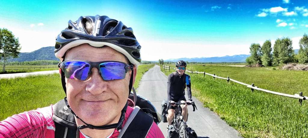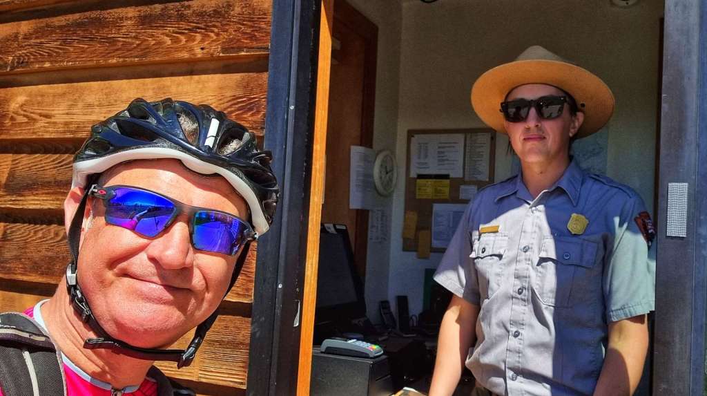For the next 10 miles we had our own cycle path which ran close to the road, but made for very relaxing & enjoyable riding. We saw a couple of runners & 3 cyclists, so we could take in the mountain views all around us. Before we knew it, we’d passed Teton Village & arrived at the entrance to Grand Teton National Park – thank you to the Ranger on the gate who humoured me when I asked for a selfie!