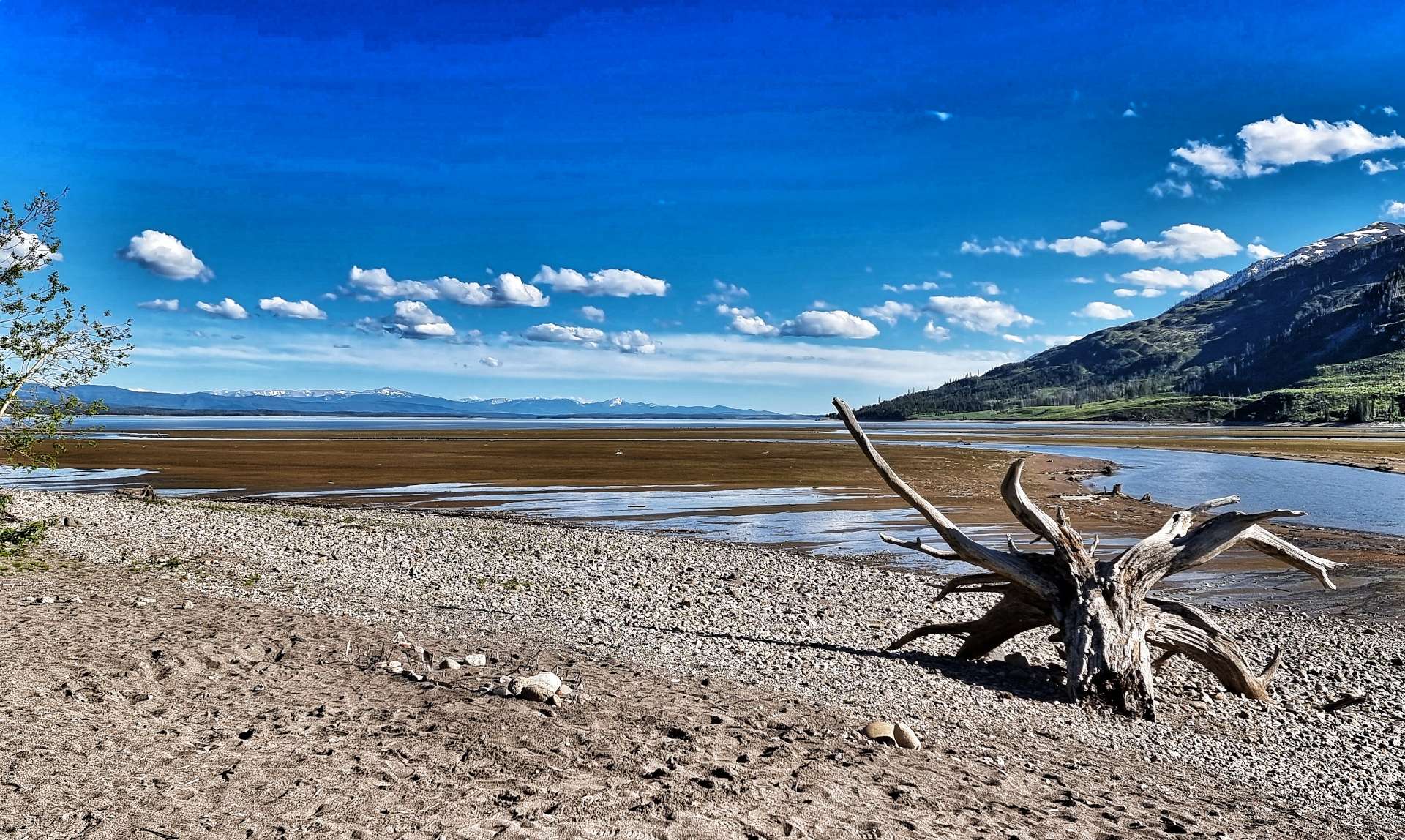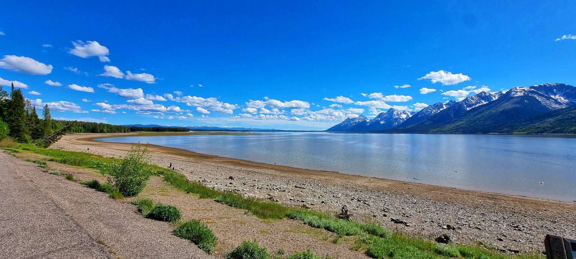 Continuing up the valley, it became more obvious that the water level in Jackson Lake is currently quite low, as more of the shoreline beach became visible. We stopped briefly at Colter Bay Village (a grand name for a gas station, if ever I heard one!) where we stocked up on sandwiches, crisps & fruit for our gourmet dinner later.