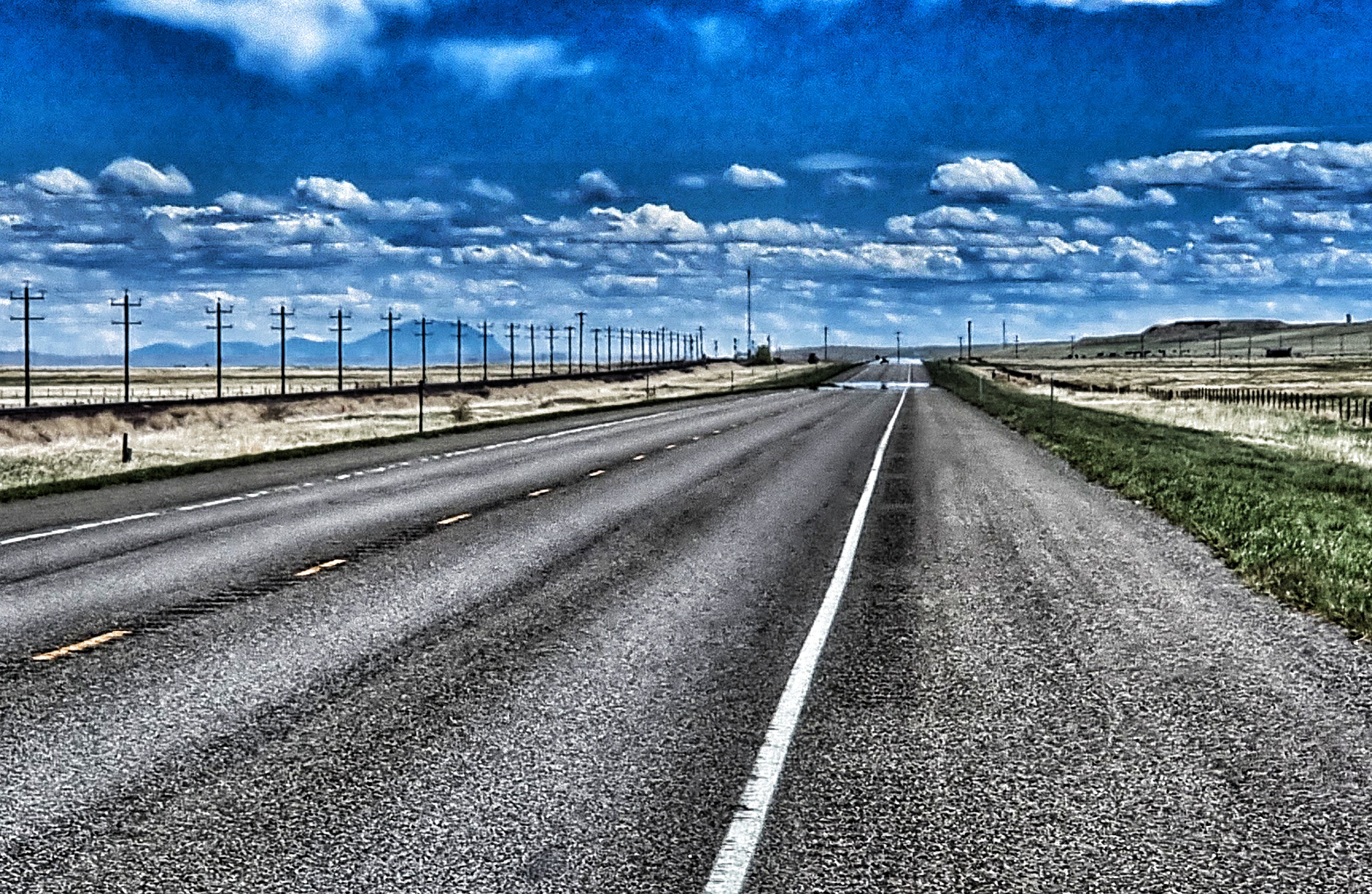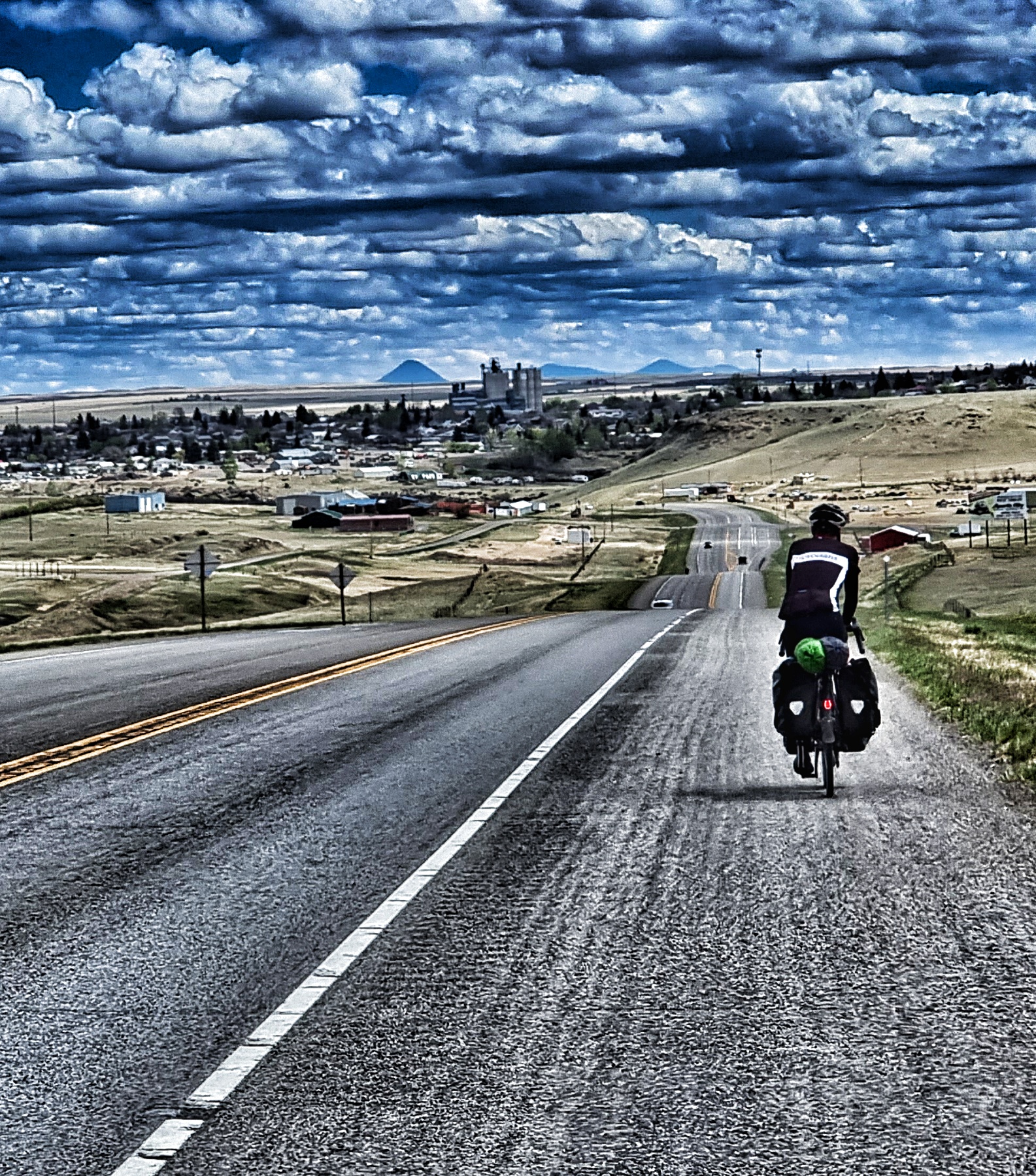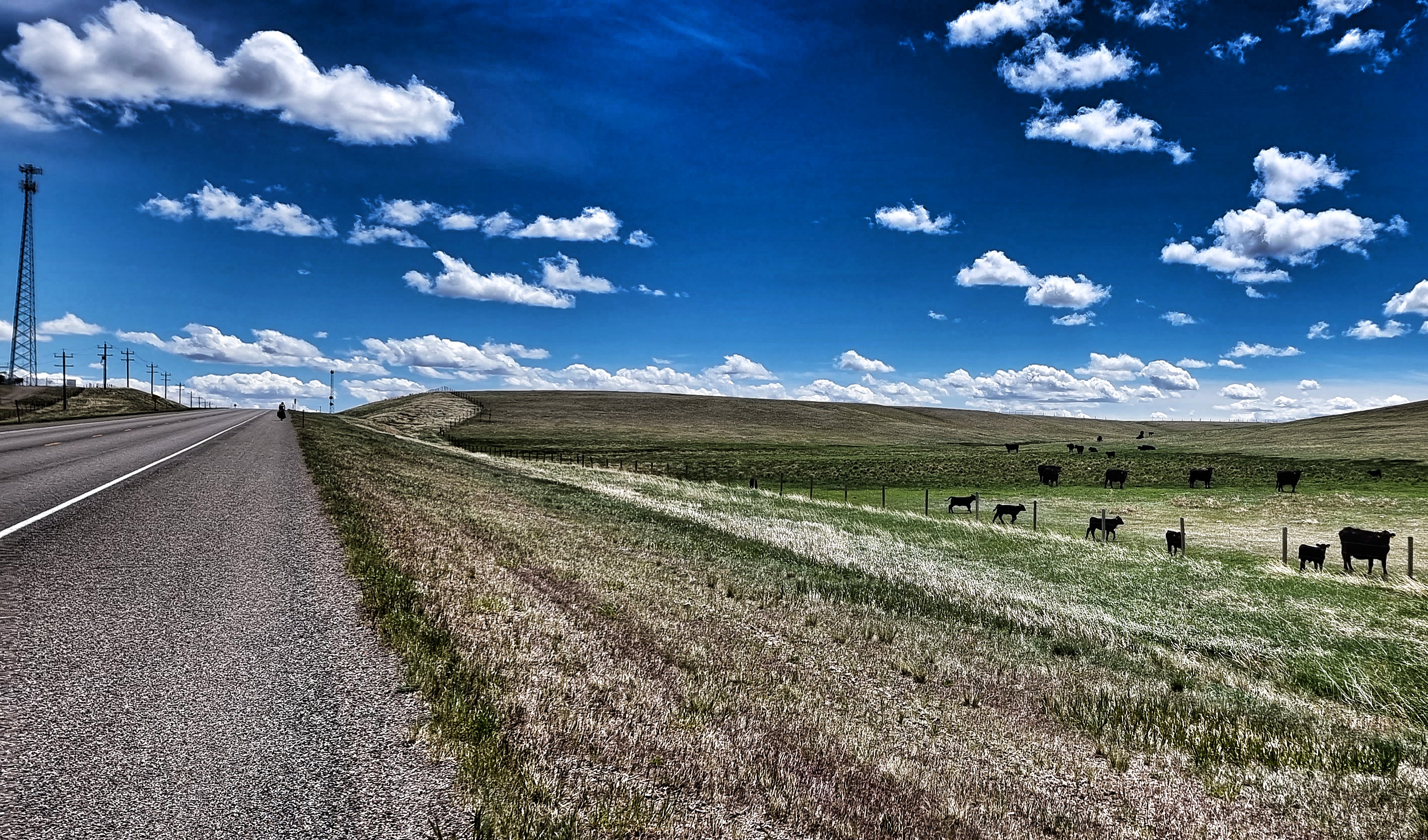 For the first time on our adventure the temperatures were high enough to see heat haze in the distance. Passing a field of cows on the right, the road rose gently for the first time in about 15 miles – the legs were slightly surprised when they were asked to put in some proper effort, so I stopped at the summit for one final look behind me. The cotton wool clouds overhead reminded me why Montana is known as The Big Sky State, as even the most normal view seemed so much bigger.