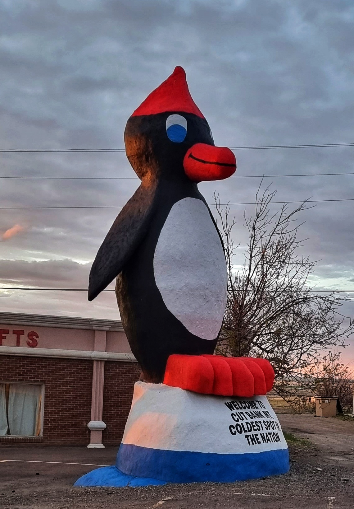 We had a relaxing afternoon, before heading out for a beer to celebrate another cracking day in the saddle. On the way back to the hotel I got to see both the sublime & the ridiculous within the space of 5 minutes – a glorious sunset & a 27 foot penguin which is a permanent reminder of when the temperature plummeted to 64 degrees F below freezing on 1st February 1989. The coldest spot in the nation is actually Prospect Creek Camp in Alaska, where temperatures plummeted to 79.8 degrees F below freezing.