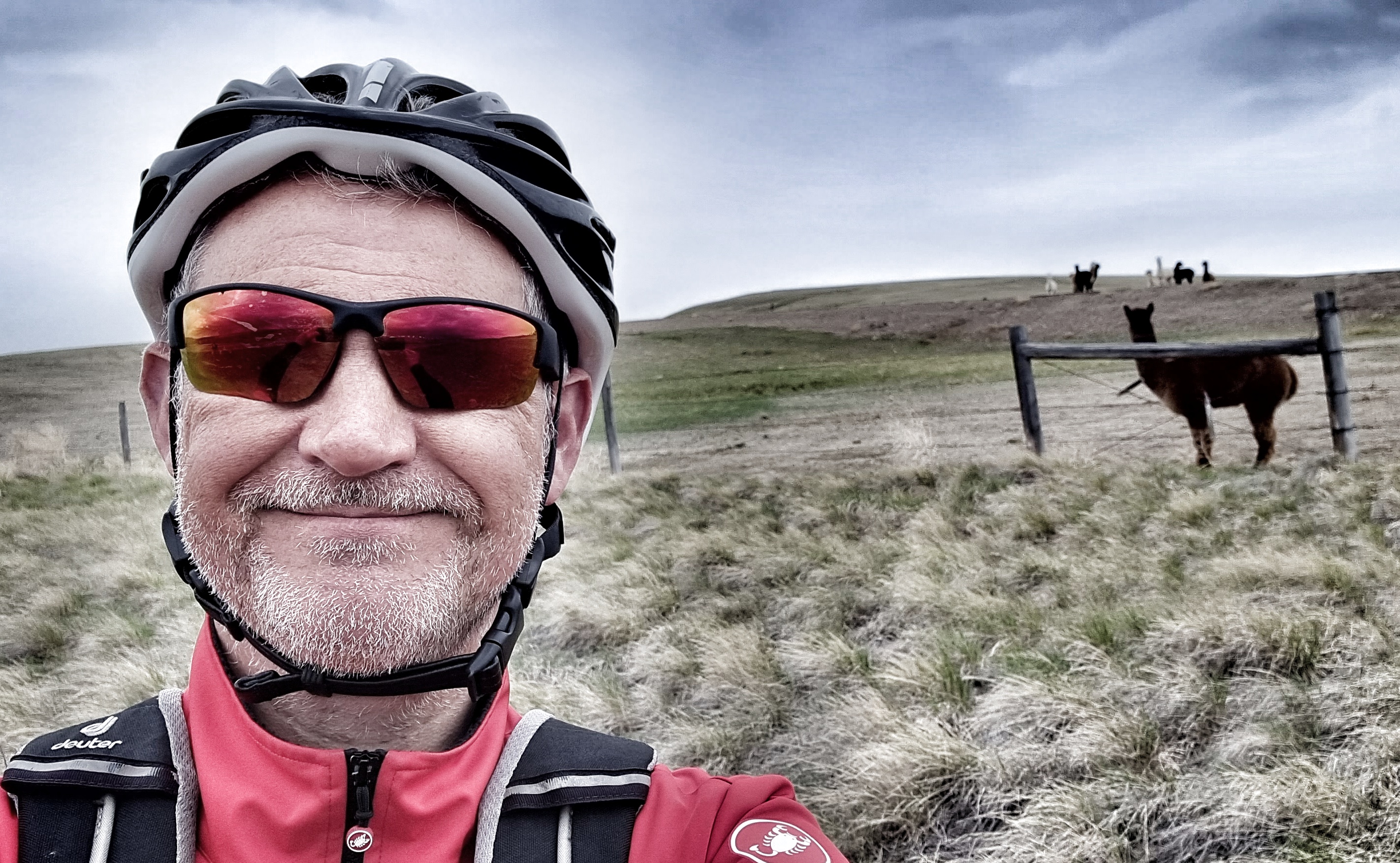 After a breakfast of cereal & toast, we were on the road for 9.30am. After yesterday’s turbo assisted ride we were expecting to have to work a bit harder today. We set off under overcast skies, with squalls of rain already falling around us (but not on us). The day started with a short climb up to the turning for the Valier Highway, where we turned left. Reaching the plateau we were surprised to meet a herd of alpacas. The alpha macho came over to check us out while the remainder of the herd looked on from a distance.