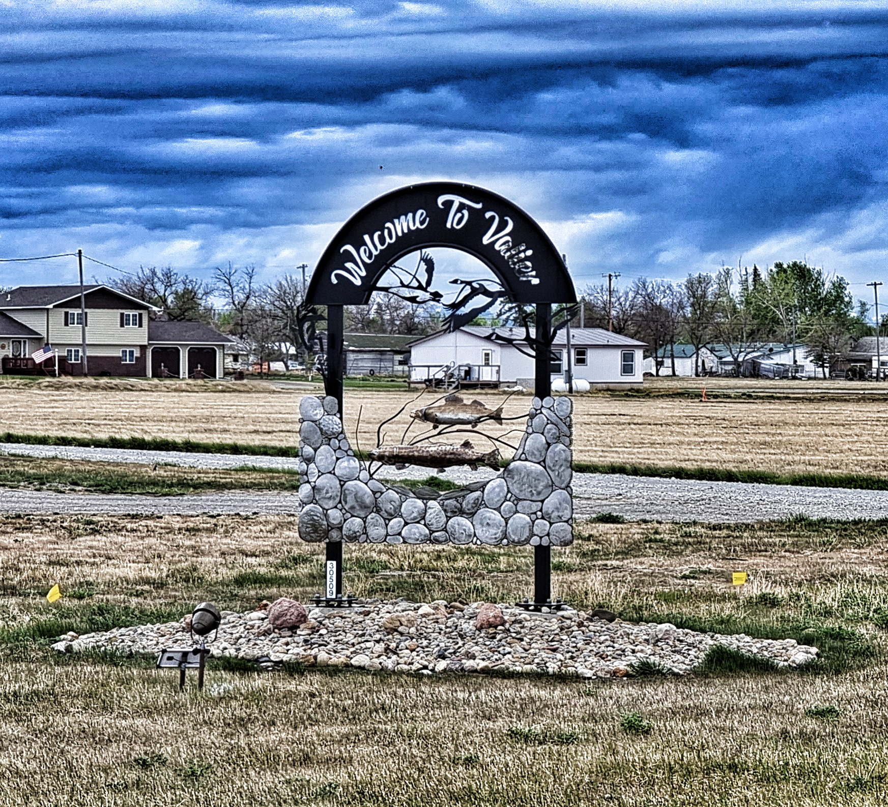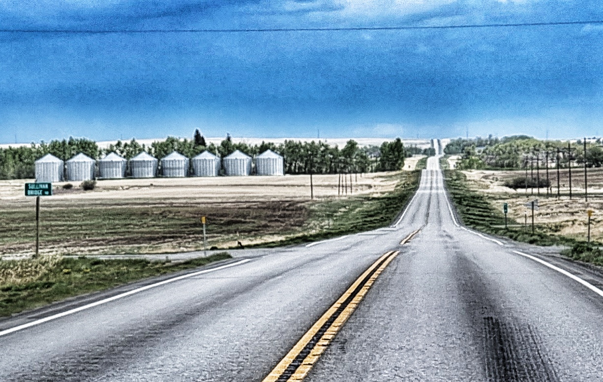 Just after crossing the river, we took a left hand turn & experienced the strength of the wind at first hand – unfortunately on our faces, not our tails! We also got our first look at the local “pepperpots” which store grain on individual farms before it gets collected & transferred to the larger co-operative facilities in local towns. After 13 miles of character building riding into a headwind we finally reached our coffee stop in Valier. Being a Sunday, we had to settle for a gas station coffee & Snickers, while we were finishing up, a professional rodeo team passed through.