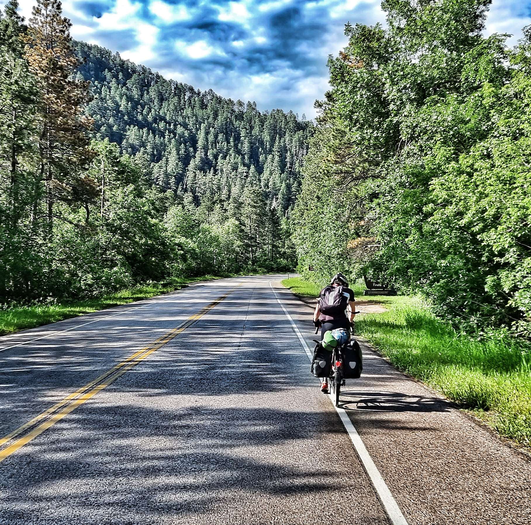 We loaded up the bikes, thanks our kind hosts for looking after our kit & set off on the short ride to Rapid City. We took the scenic Adventure Cycling Association route, which took us along quiet backroads that twisted & turned their way through the tight forest, as the topography required the road to rise & fall sharply – our legs were soon stinging!