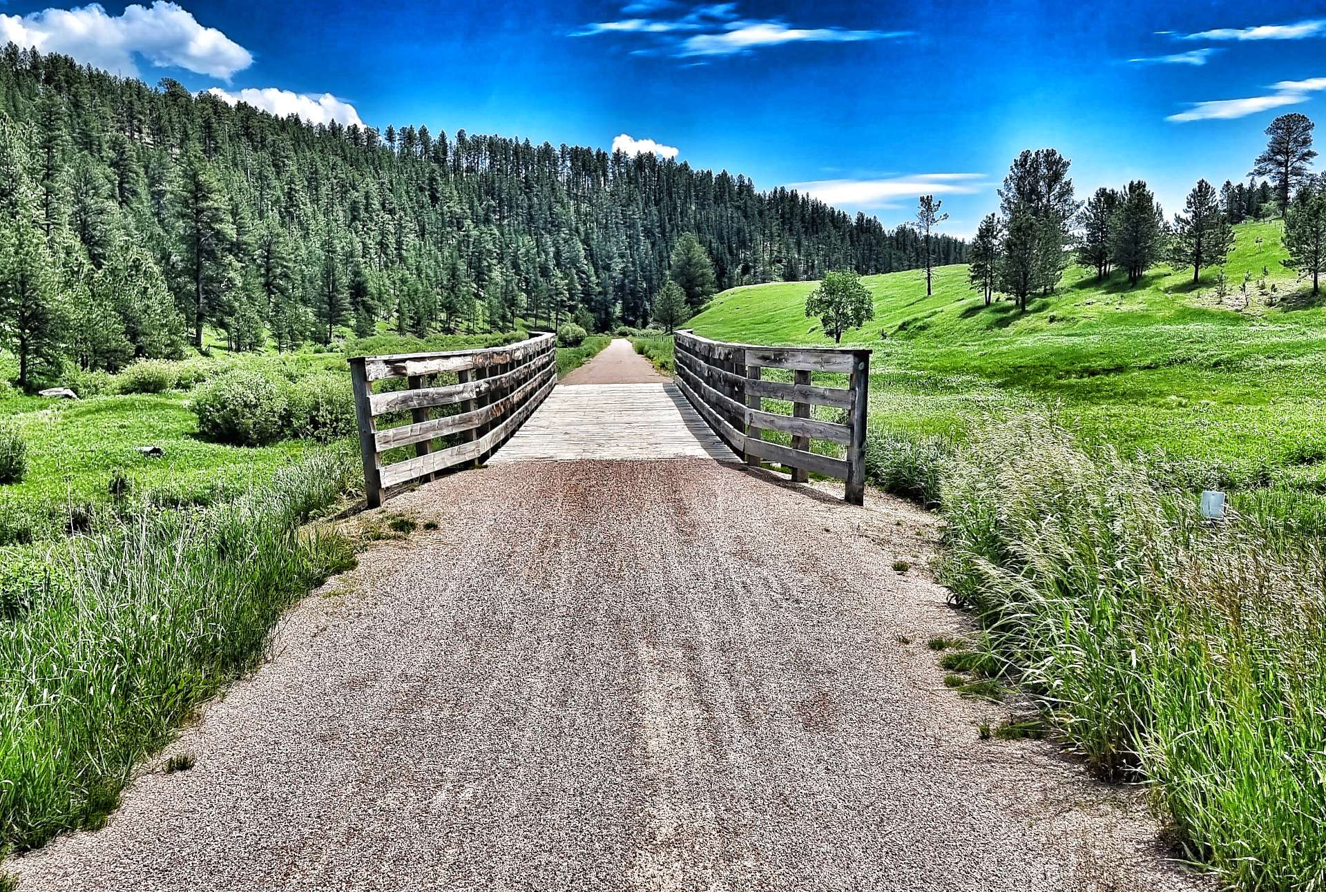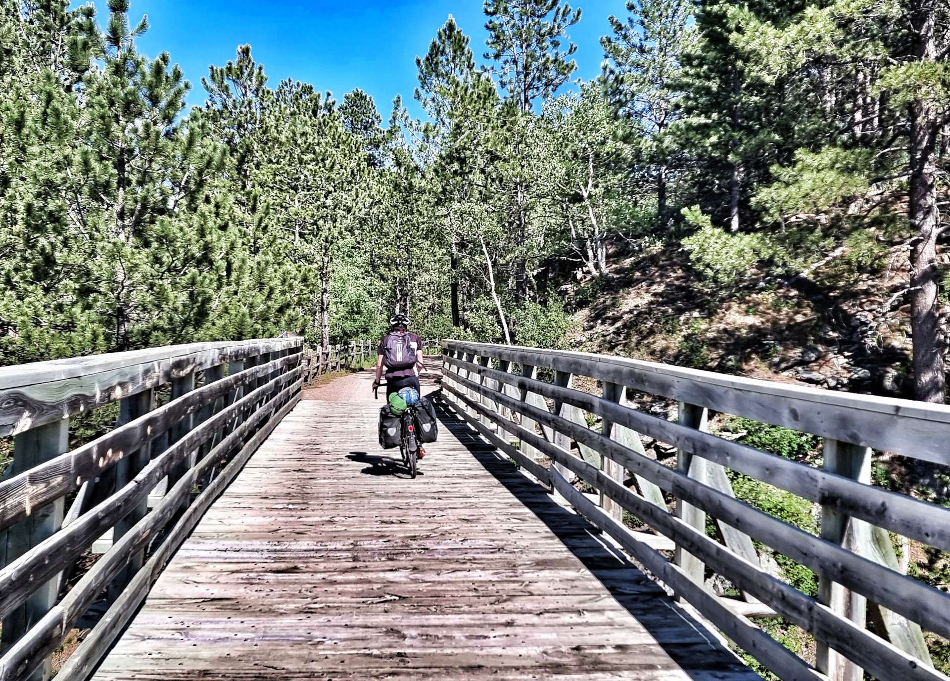 The George S. Mickelson Trail is 109 miles in length, is shared by cyclists, hikers & horse riders & was completed in September 1998. Much of the trail passes through National Forest Land as the 100 converted bridges & 4 rock tunnels enable users to travel from Deadwood to Edgemont – its surface is primarily crushed limestone, with stretches of gravel. The trail follows the old Chicago, Burlington & Quincy railroad branch line.