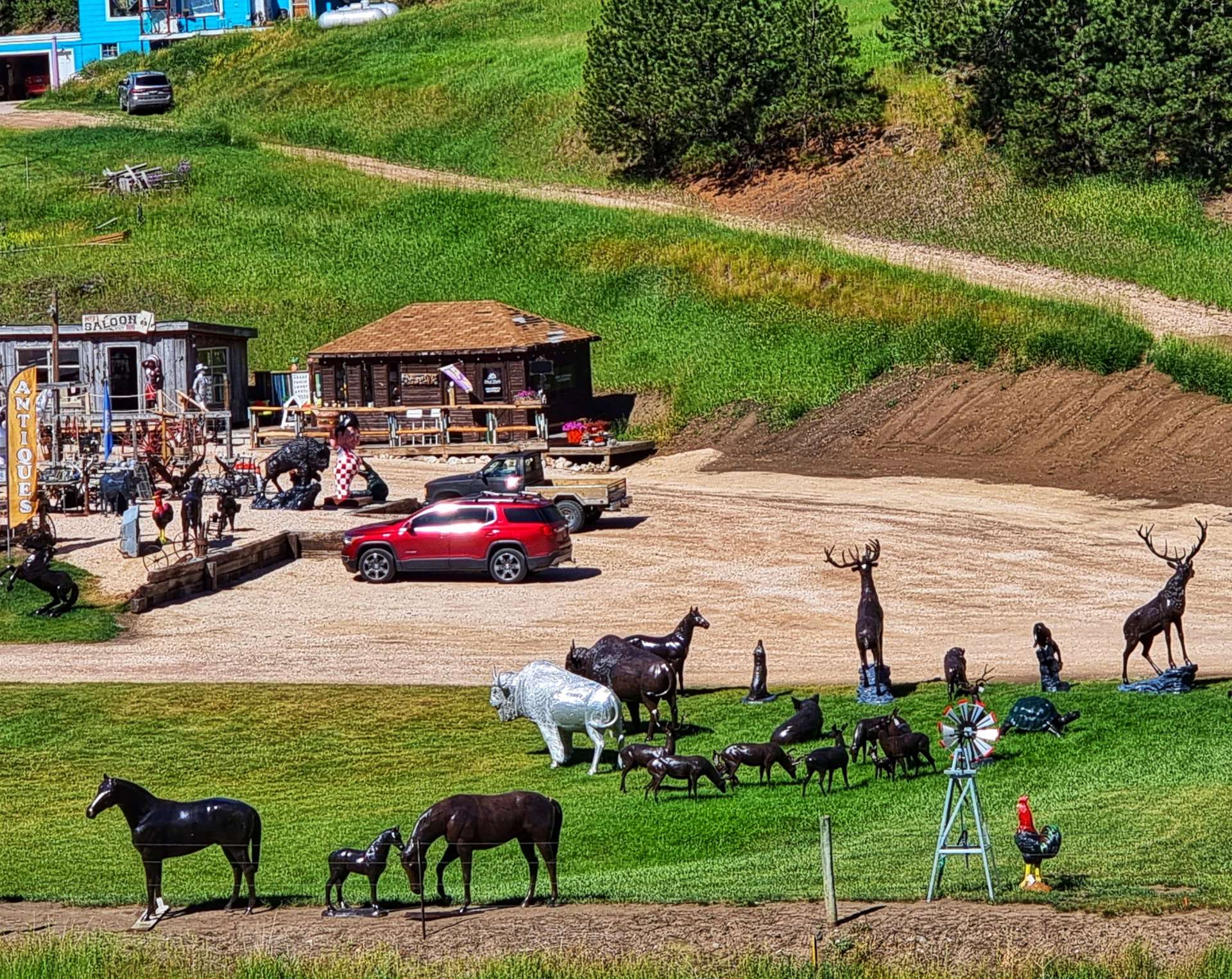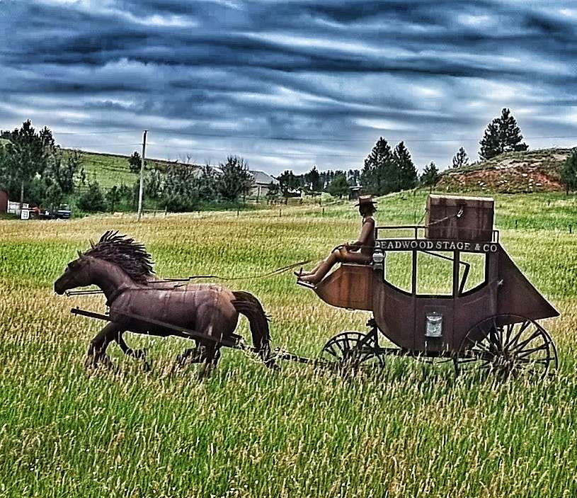 As we left the Black Hills National Forest Behind us, we encountered one last steep hill, then had big views across the valley below. As we descended to the main road, we had one final treat in the form of a life-size model of an old stagecoach & horses.