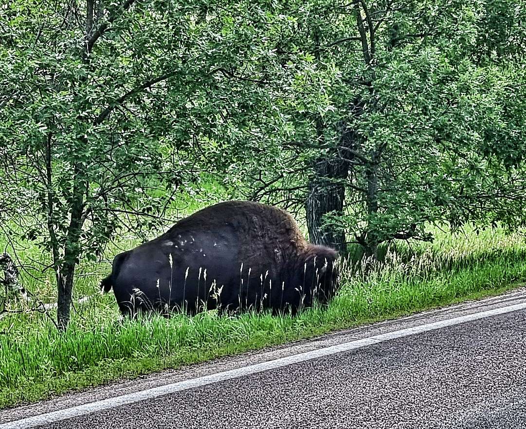 The road continued descending for another 2 miles until we left Custer State Park & took a left turn for the 12 mile climb up Iron Mountain Road. We were on the lookout for wildlife & couldn’t believe our luck, when there on the verge was a bison grazing on the grass. I made sure I was a safe distance away, then took a quick snap, before leaving the bison in peace.
