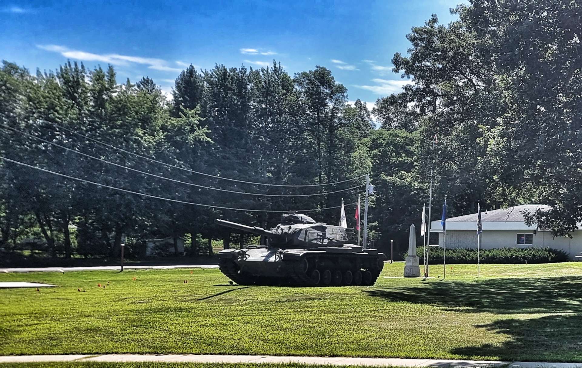 I re-joined Highway 21 just before entering Necedah & almost immediately, I passed a decommissioned tank on the site of the town’s Memorial Park. I also met up with Sean for a disappointing coffee & pastry – today our two choices were a Kwik Trip gas station or to go without! We needed to top up our water & knew there wasn’t anywhere else on our planned route. Life isn’t always glamourous on this adventure!