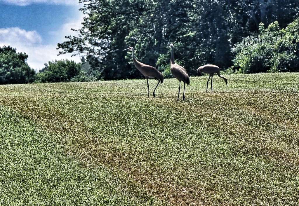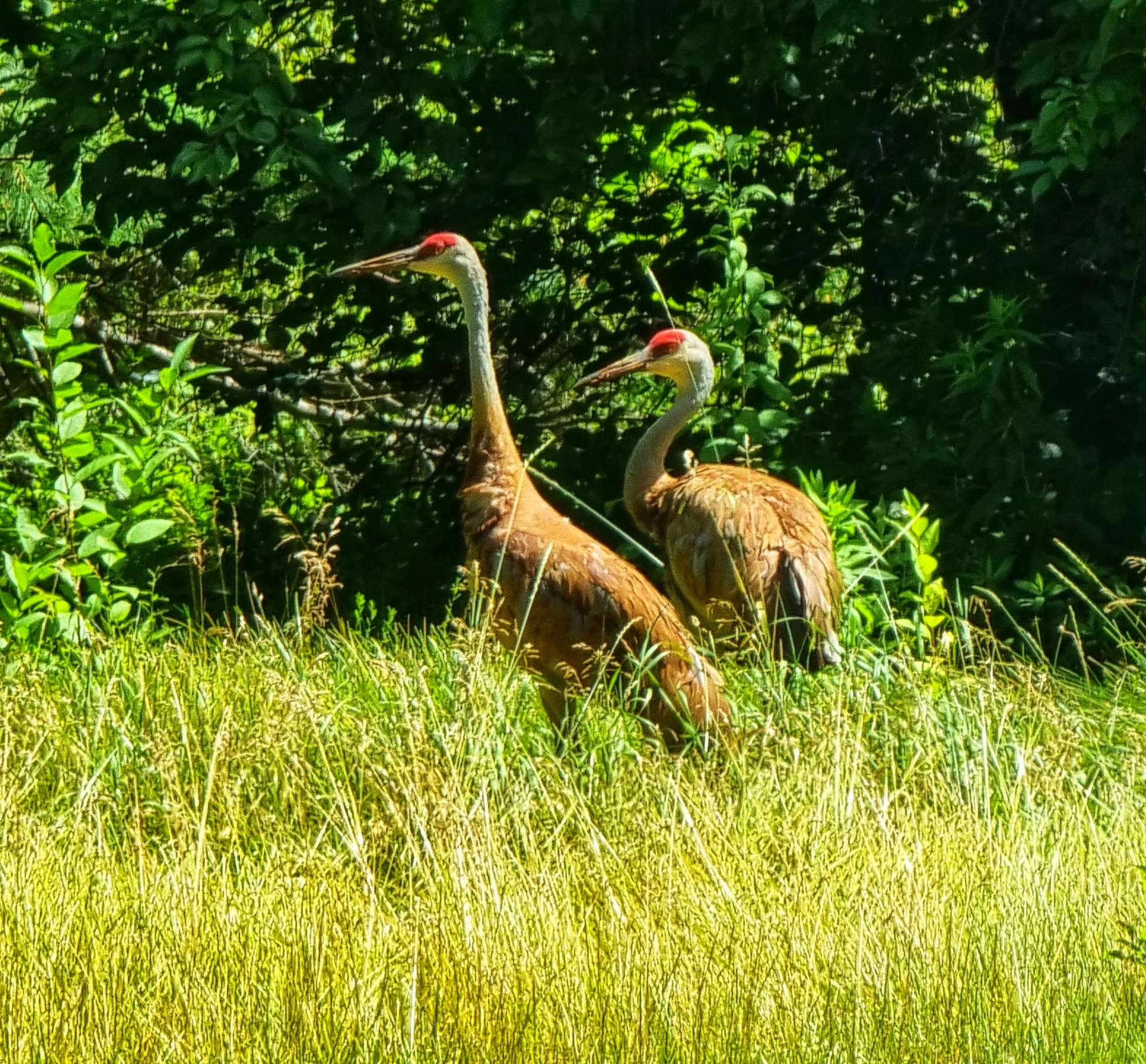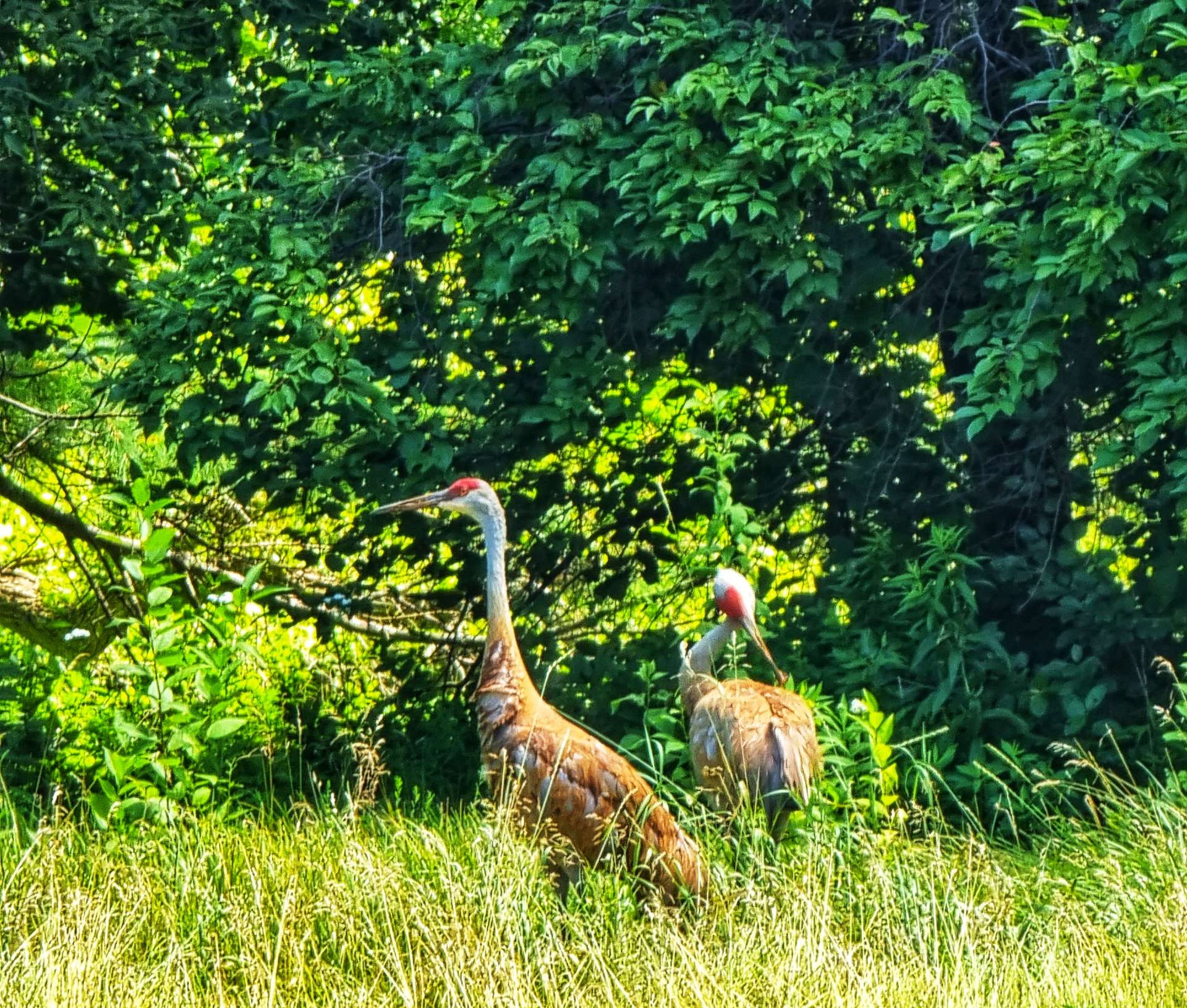 As we crossed the Heckrodt Wetland Reserve we saw what I’ve been describing recently as herons – it appears they may actually be sandhill cranes, which do frequent grasslands as well as shallow lakes. The bright red patch on the crest of their head is much more clear in these photos.