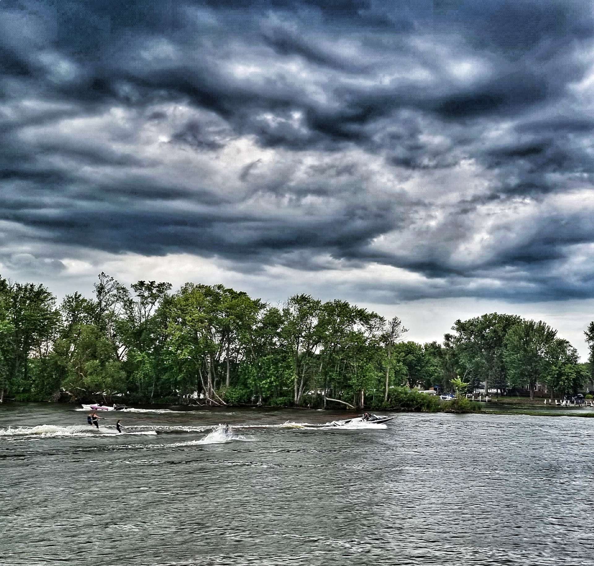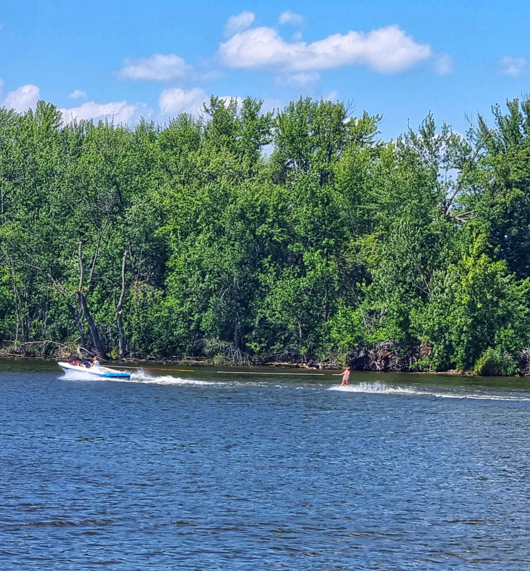 The show started slowly with skiers being towed one at a time, sometimes stood up, sometimes kneeling down on the skis. The boats then started pulling pairs of skiers & then long lines of skiers.
