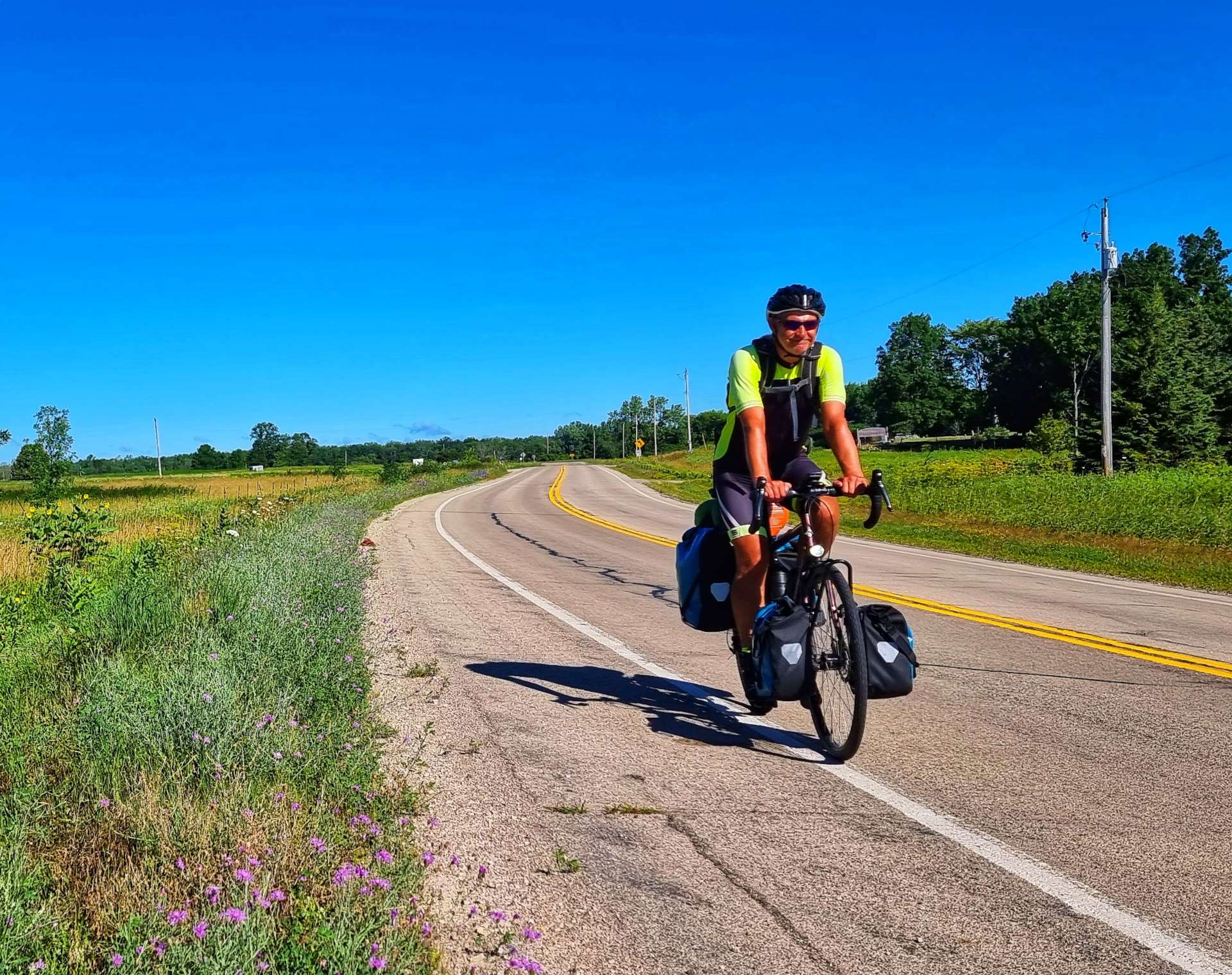 We woke up at 7am with a hangover each!! We headed downstairs & had a breakfast of omelette, toast, coffee & juice, then loaded our steel steeds & set off for Manitowoc. As we crossed the Wolf River (home of the Webfooters), we couldn’t believe our luck – we would be picking up a West to East tailwind for a large part of today’s ride!!! You can almost see the joy on my face, although it may still be hidden by the last vestiges of a headache!