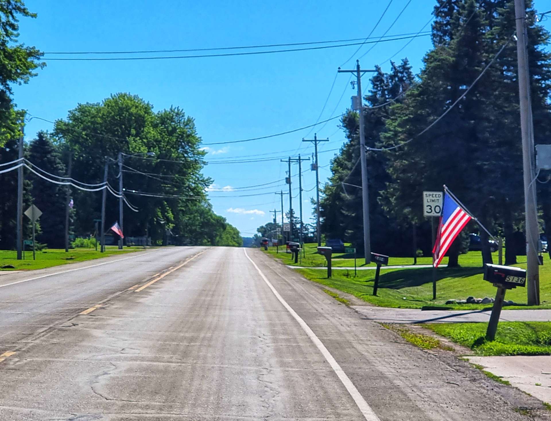All the early miles were on ruler straight roads & when we turned, it was always at a right angle! We left the agriculture behind briefly, as we became hemmed in by woodland. The 2nd photo shows a red sign in the lower left side – every property in Wisconsin has one of these & it includes the property number, the road (if there is more than one road) & the town. In this case it’s 6612 Town of Almond (this is a one road town!).