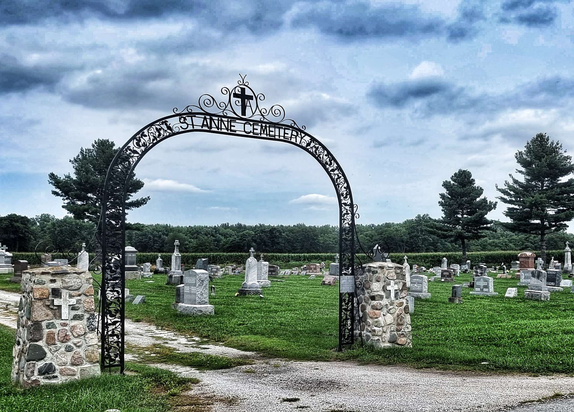 We were still on deserted, straight roads & we couldn’t remember when we last saw a car. All through Wisconsin, Michigan & now Indiana we’ve passed cemeteries on the outskirts of small towns. Some had as few of 5 or 10 headstones, while others like St Anne’s Cemetery outside Monterey had hundreds of memorials & headstones.