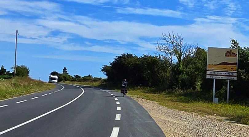 I was certain that Surtainville was in the general direction of our destination, so we picked up the D66 as it took us up to a ridge where we occasionally saw glimpses of the Atlantic Ocean way off in the distance. Just before Surtainville we joined the D650 for the final 8-mile ride in Carteret, our base for this evening.