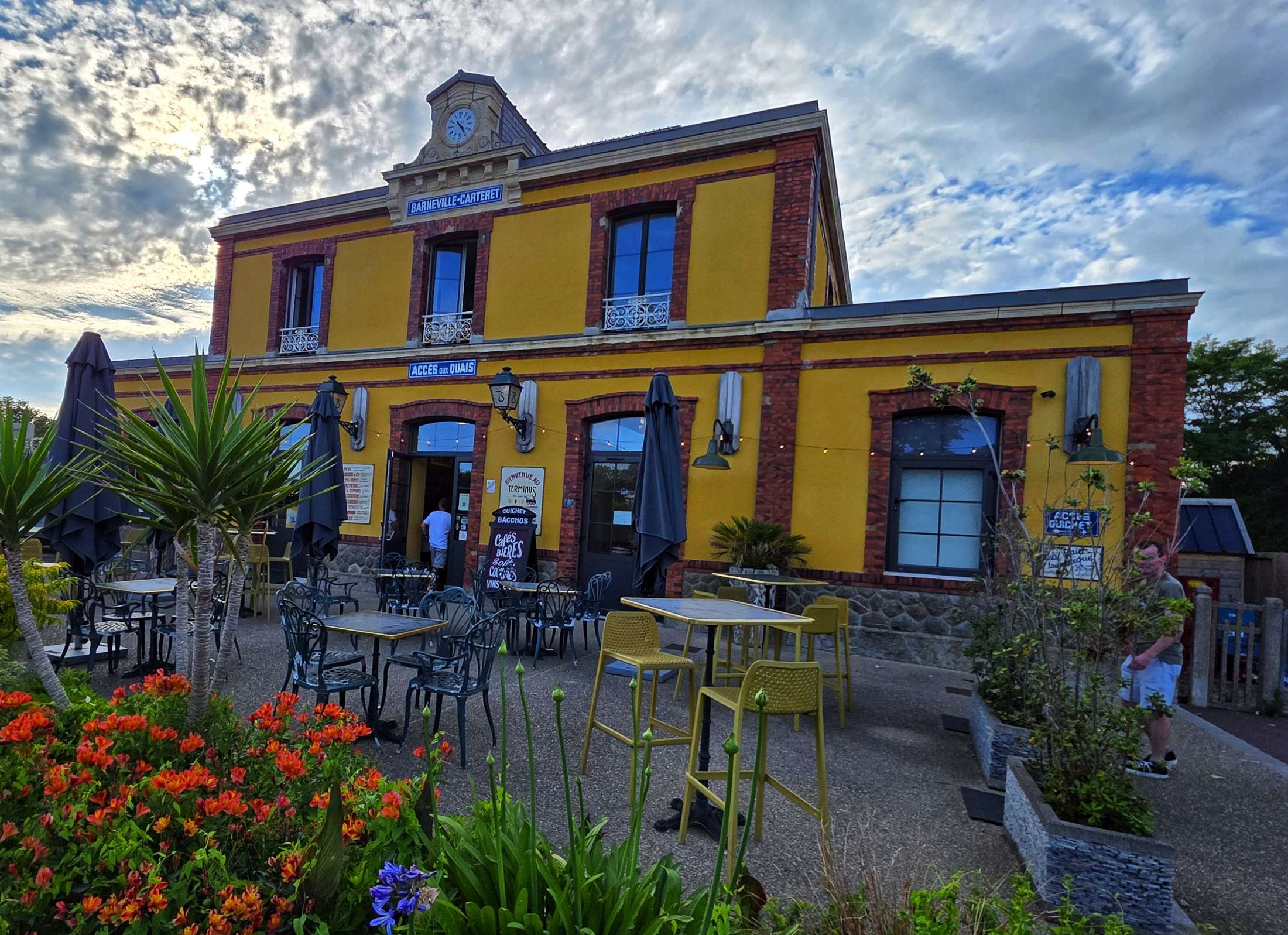 We found another historic railway station to add to our collection – Gare de Carteret has been converted into a food & drink paradise, where you can choose from 9 different food vans, plus a bar. We toasted our 1st day in France with a burger & fries, washed down with a pint.