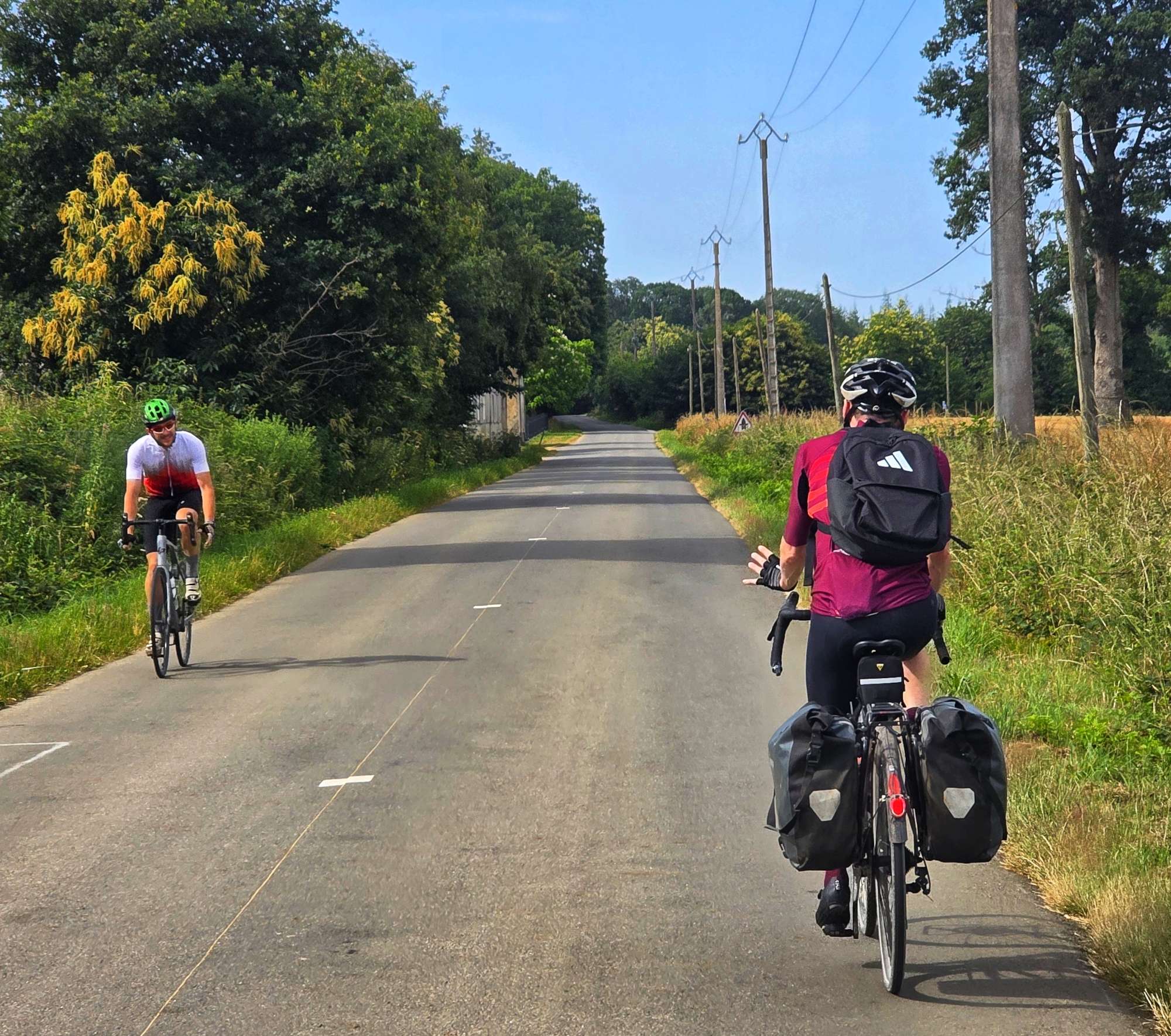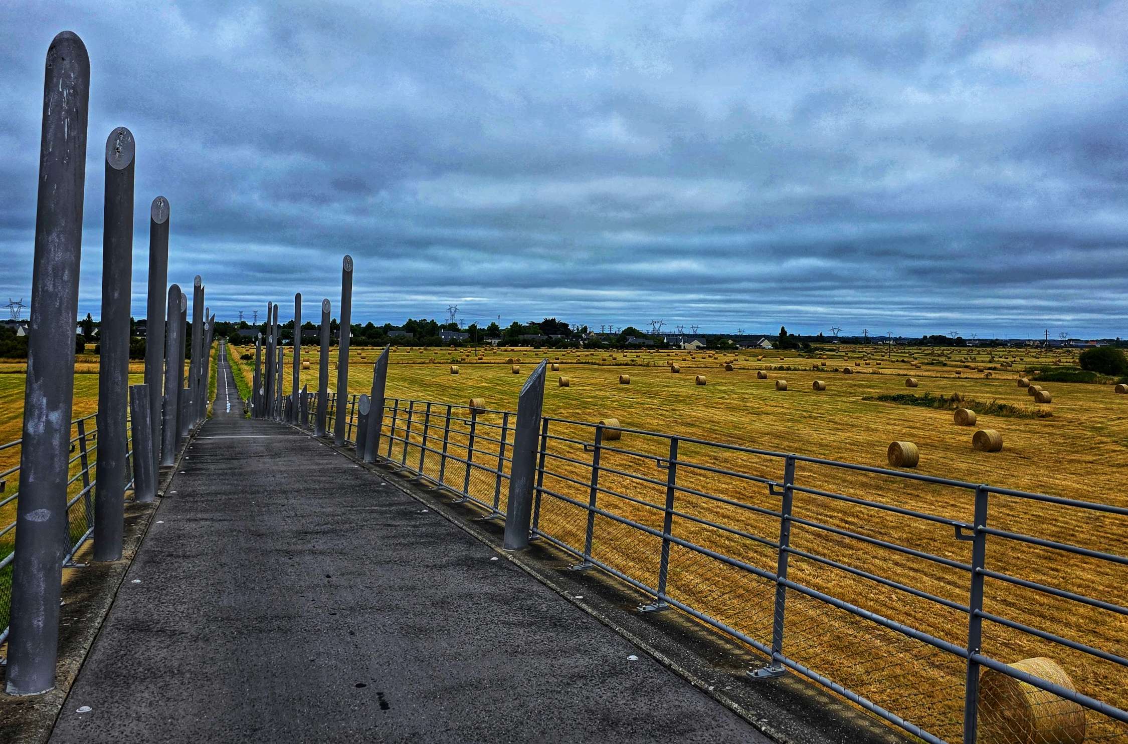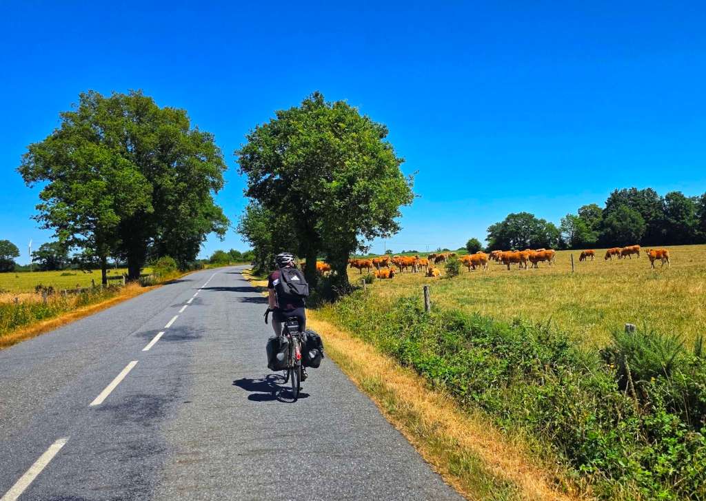 Leaving Trignac, we picked up a local cycle track that cut through fields of wheat that have been harvested & hay baled. Behind 1 of the bales, I spotted a single person tent & bike trailer – it looked like a wild-camping cyclist had found their perfect spot to stop last night.