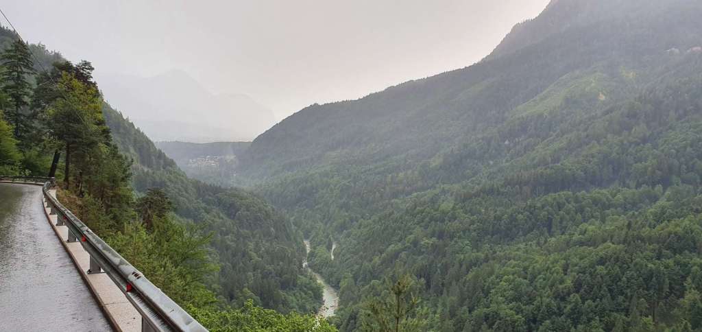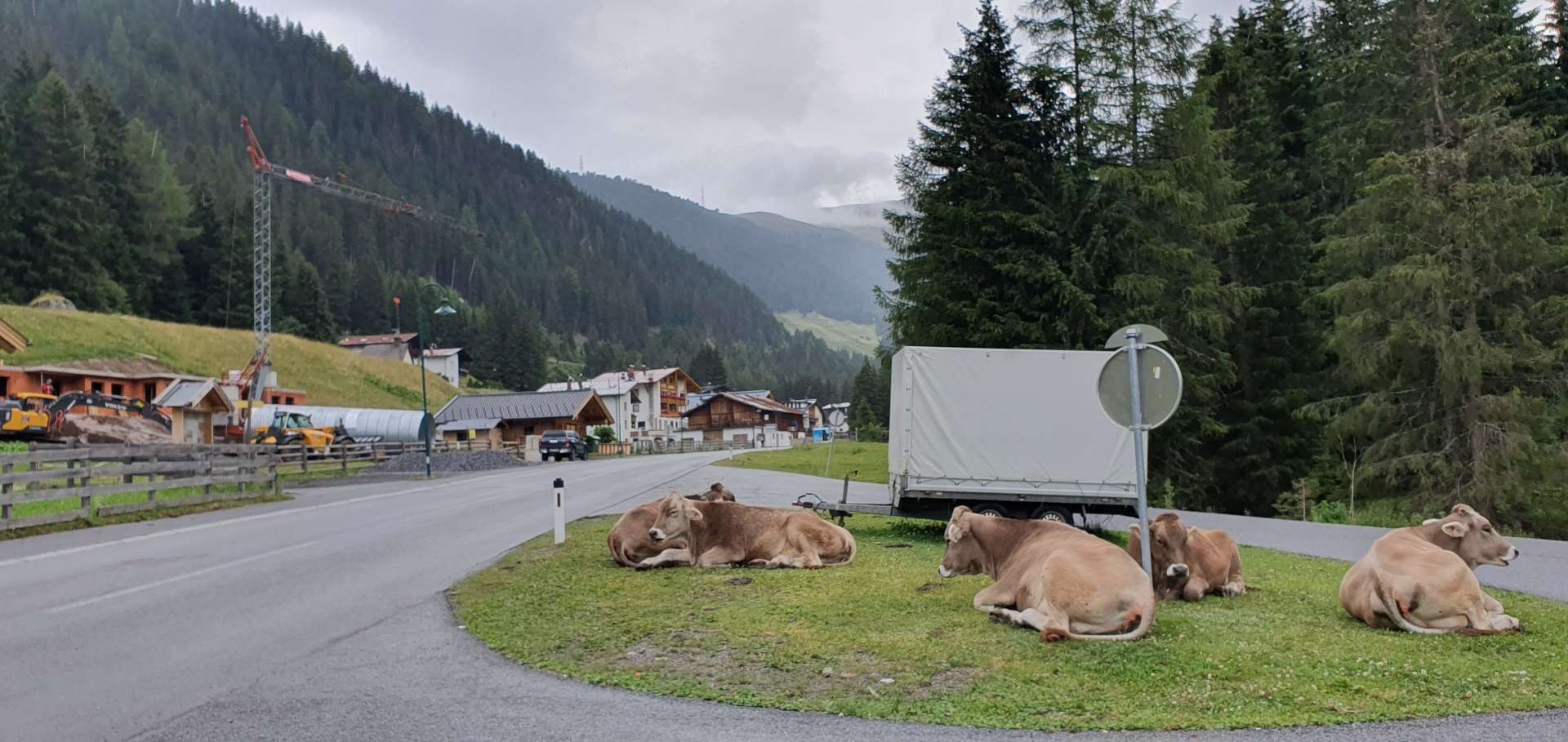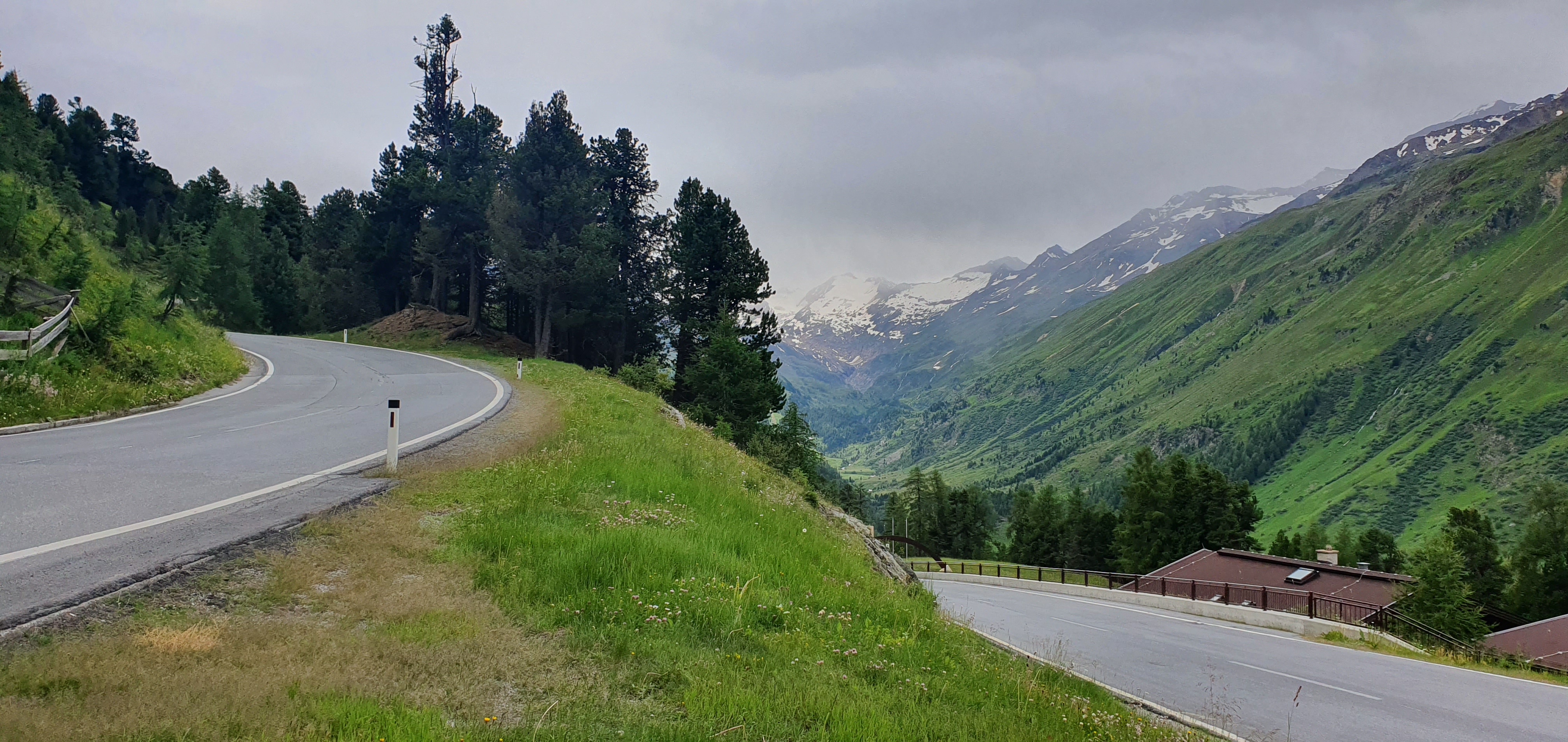 We stopped for a warming minestrone soup at a restaurant on the Italian / Austrian border, before descending back to Solden. It was raining again at the summit, so once we’d put our rain jackets on, we set off back down the Timmelsjoch – after a few hairpins near the summit, the road opened out & in no time I had hit 43mph & was still accelerating when I remembered the cattle & sheep crossing the road earlier, so I started to reduce my speed, just as well as there were now sheep where the cattle had been!!!