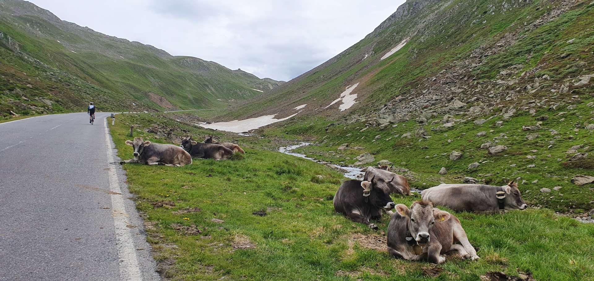 After a brief stop were on our way again & although we weren’t anywhere near the summit of the Timmelsjoch, the road descended for a mile & we gave away 450 feet of hard earned altitude! The final 3 miles to the summit were the most wild & rugged, as the only vegetation was grass which was being grazed by wild cows & sheep. They roam freely & as we were climbing, a convoy of Porsches were forced to stop their descent as the cows chose that moment to cross the road.