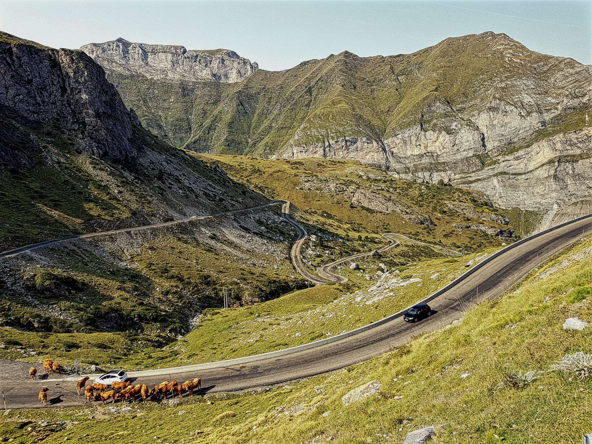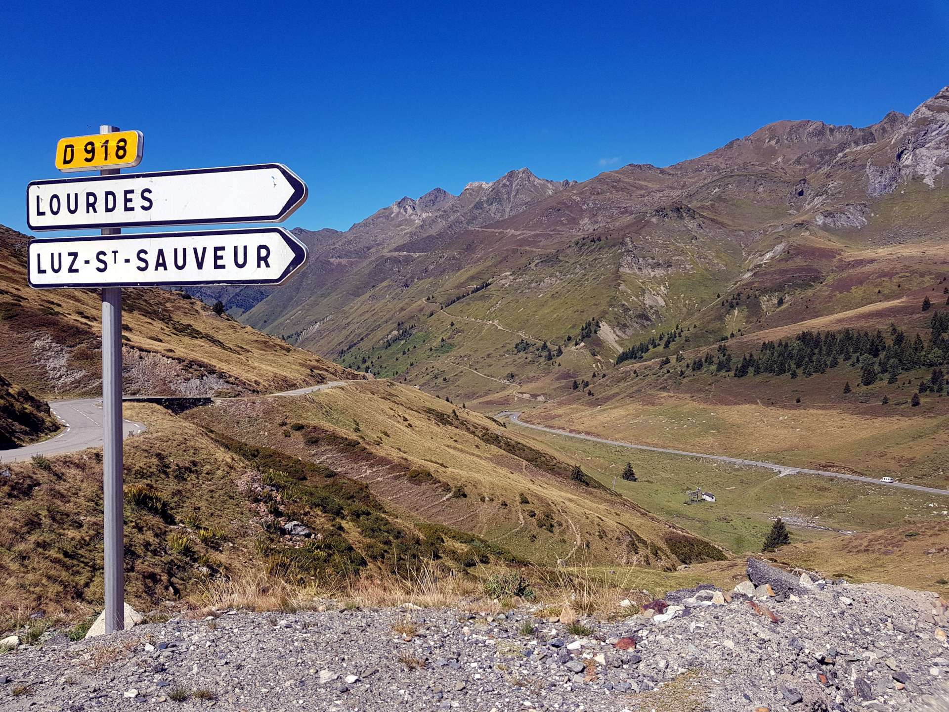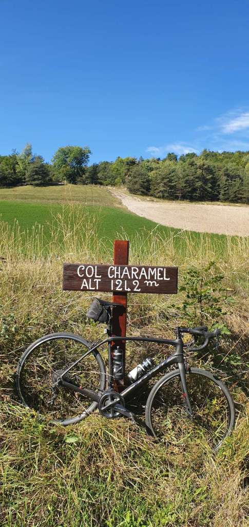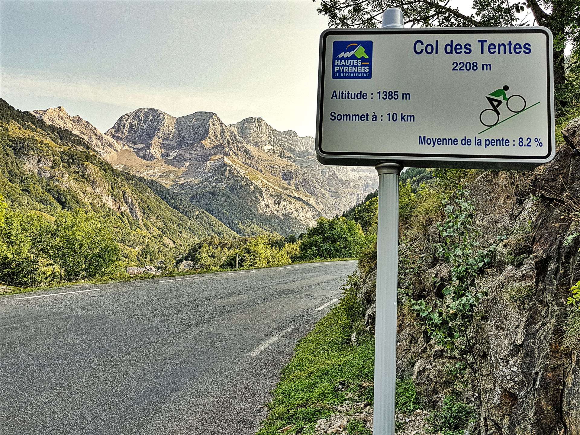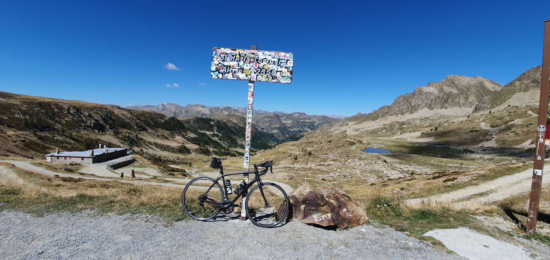 Looking below, we could see the lower slopes of the climb, as well as having regular reminders of what still faced us – there were markers every kilometre, showing how far remained to the summit, as well as the average gradient. After 2½ hours of climbing we’d reached the Col de la Bonette, where we stopped briefly for a photo.