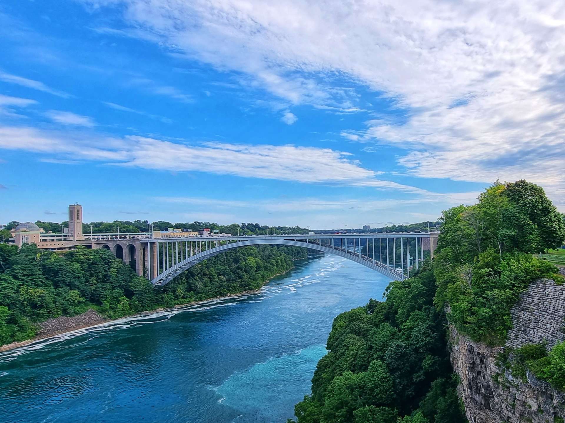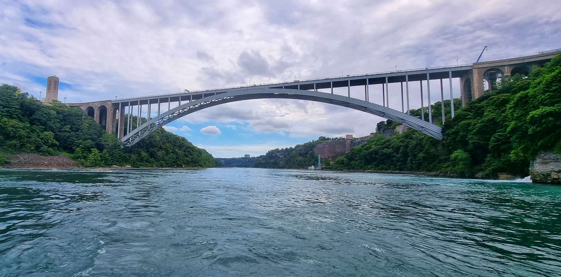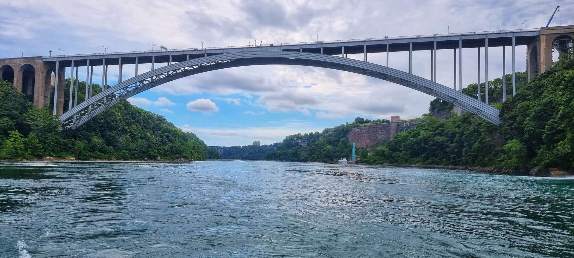 We bought our tickets for the Maid of the Mist boat trip & headed to the Observation Deck where we stopped to take in the views of the Rainbow Bridge, gateway to Canada & the USA . The Rainbow Bridge was started in May 1940 & opened in November the following year. The roadway runs 950 feet from Canada to the USA & is 202 feet above the water level. It’s estimated that 6 billion pounds of water flow under the Rainbow Bridge every minute!