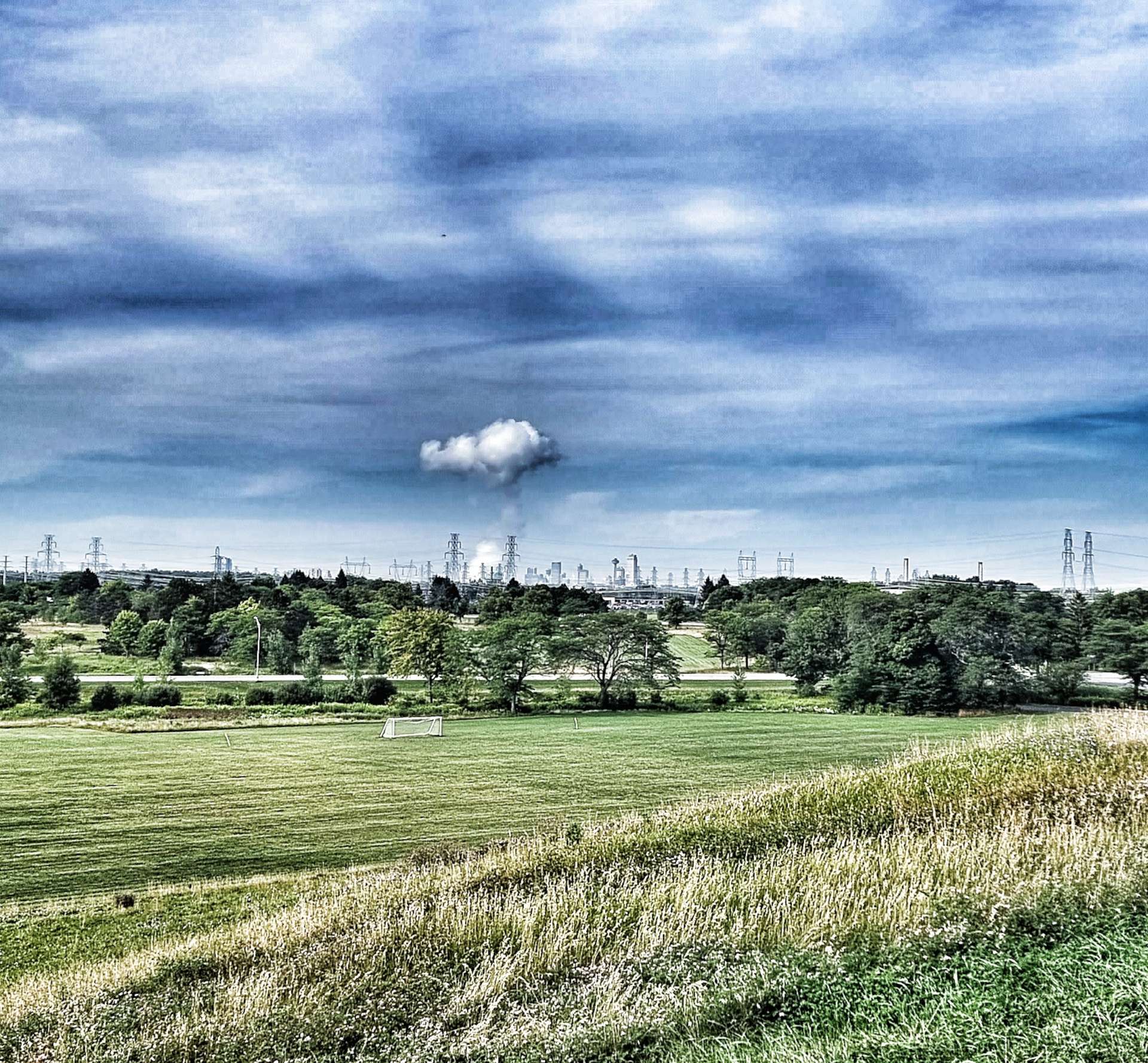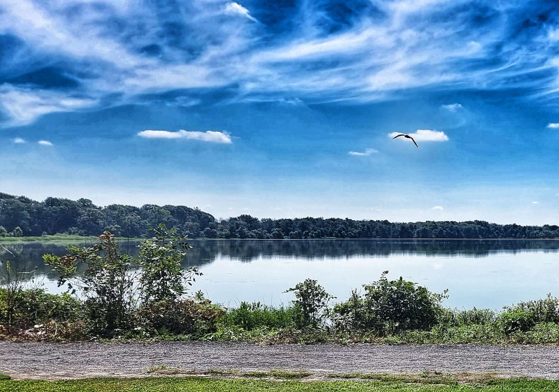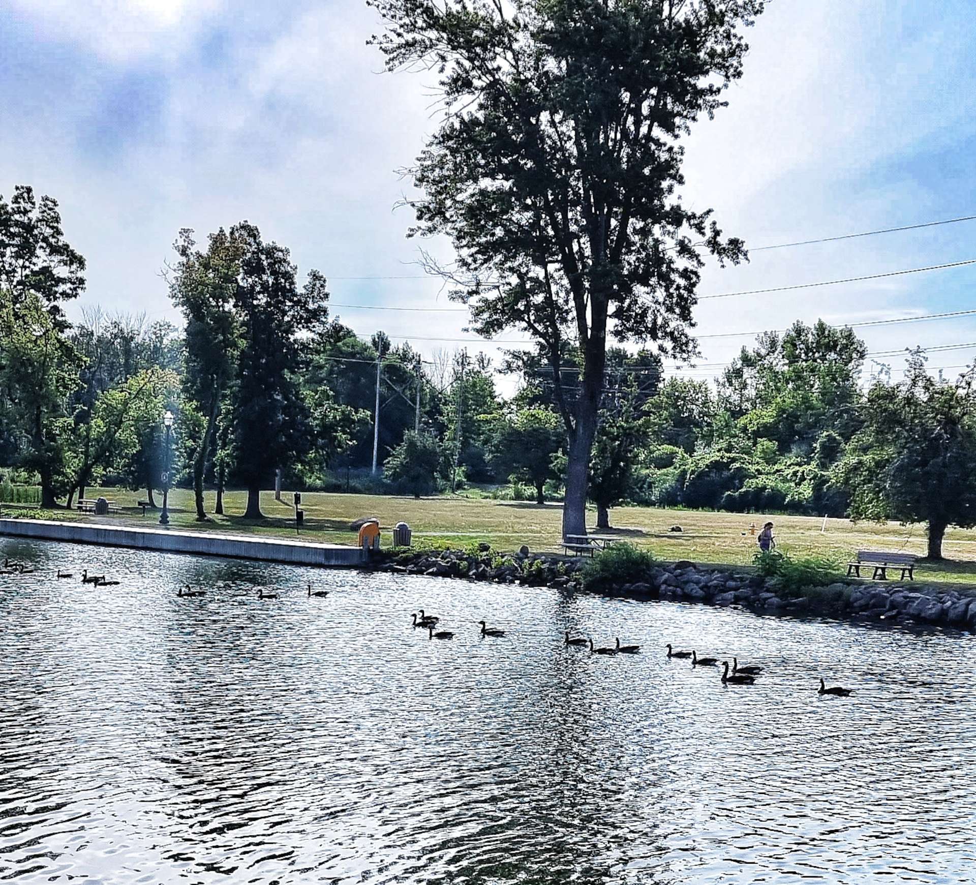 After yesterday’s amazing morning at Niagara Falls, we were back on the road, cycling again by 9am this morning. We took the Military Road north, stopping briefly at Reservoir State Park. Although we were more than 5 miles from Niagara Falls, the mist was still very much visible in the background. The State Park is a favourite with locals because of its many uses – tennis, roller hockey & basketball courts, softball diamonds combine with kite flying, model aircraft clubs, football & golf. The reservoir also has excellent fishing if that’s your thing.