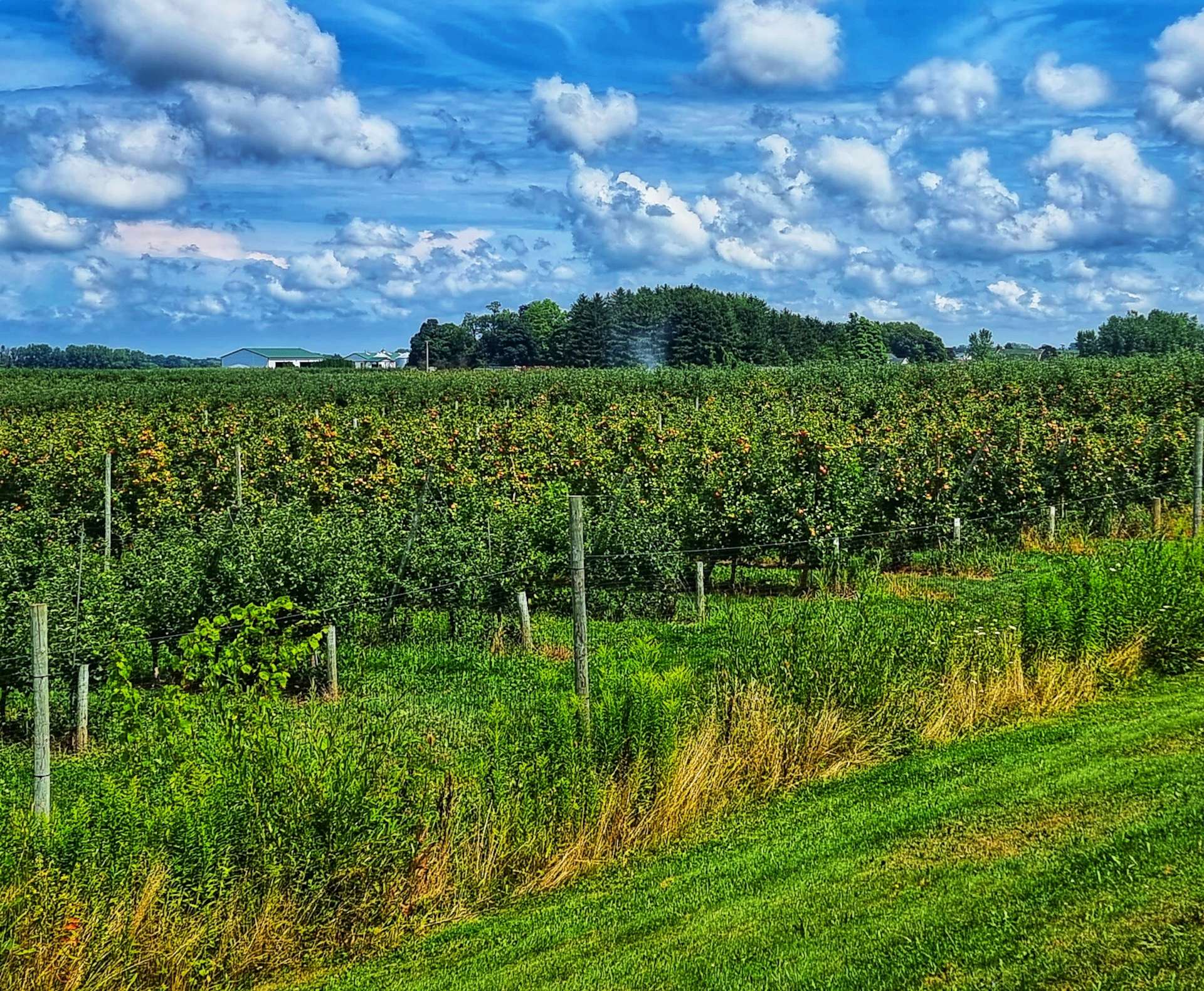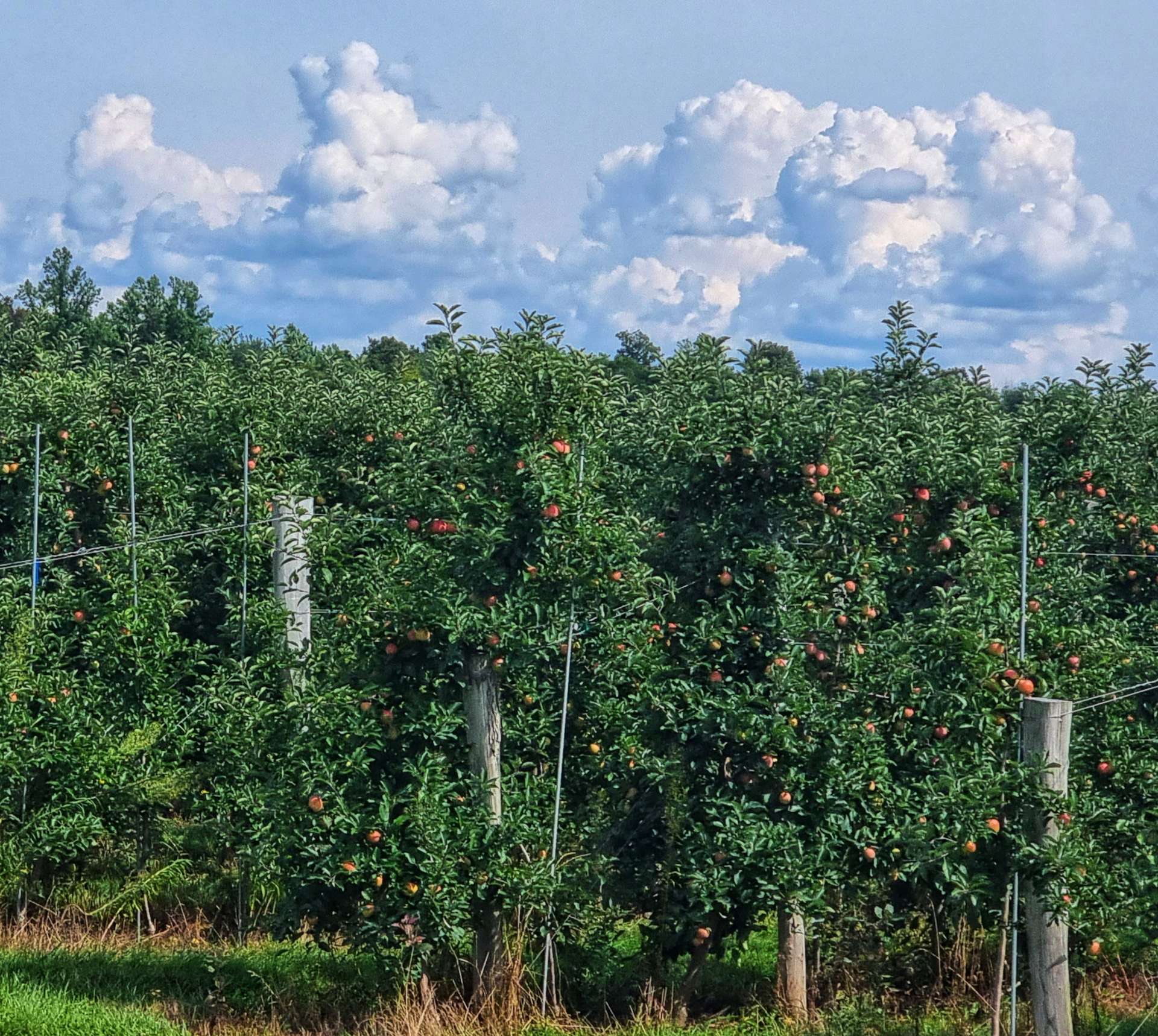 We reached the northernmost point of the Erie Canal, which was good news, as the light wind was blowing from the North. We had the trail to ourselves by now & stopped to admire the view & take a couple of photos. The crops also switched from fields of maize & soya being harvested by big combine harvesters to orchards of apples